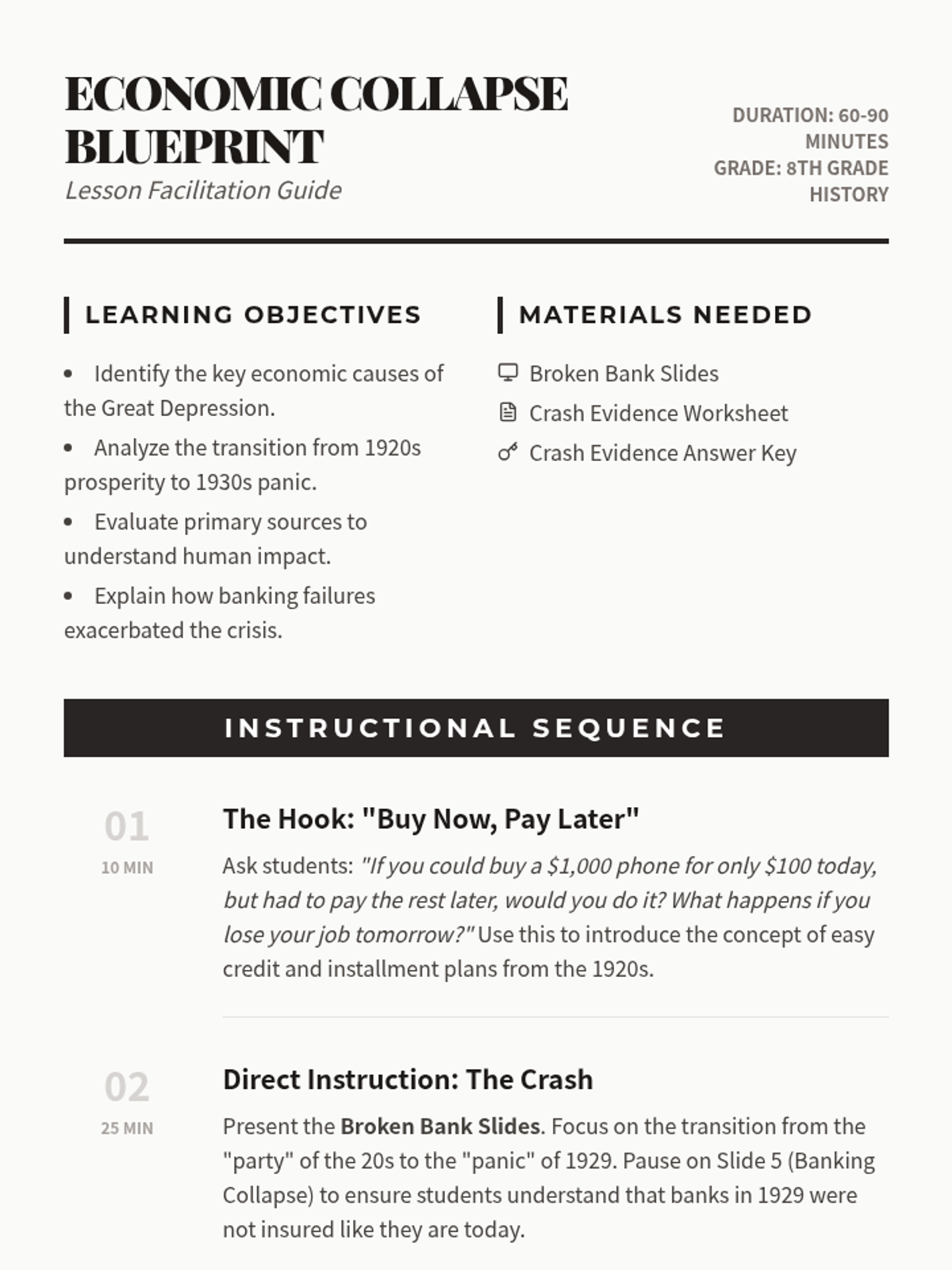 This lesson introduces students to the long-term causes of the Great Depression and compares the contrasting leadership styles and economic philosophies of Herbert Hoover and Franklin D. Roosevelt. Students will analyze primary source-style text, complete guided notes during a mini-lecture, and evaluate the effectiveness of the New Deal vs. Rugged Individualism.