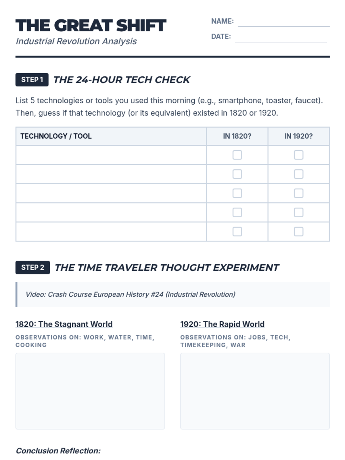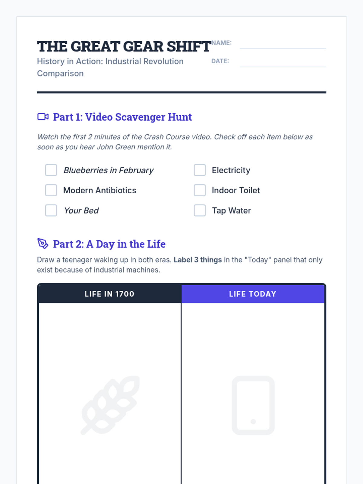 A lesson comparing pre-industrial and post-industrial life using the Crash Course World History video as a catalyst for understanding the massive scale of change in human history. Students participate in a video-based scavenger hunt and a creative comic strip activity to visualize the transition from rural farming to modern industrial society.