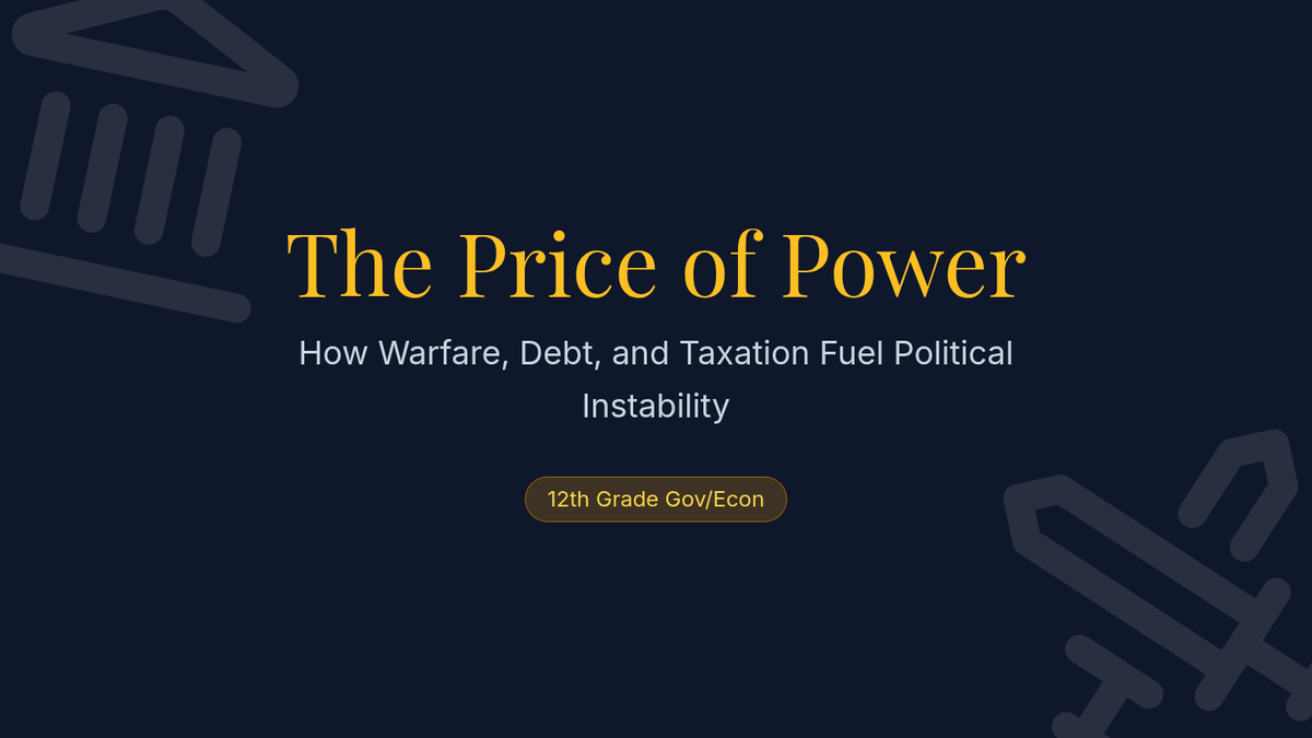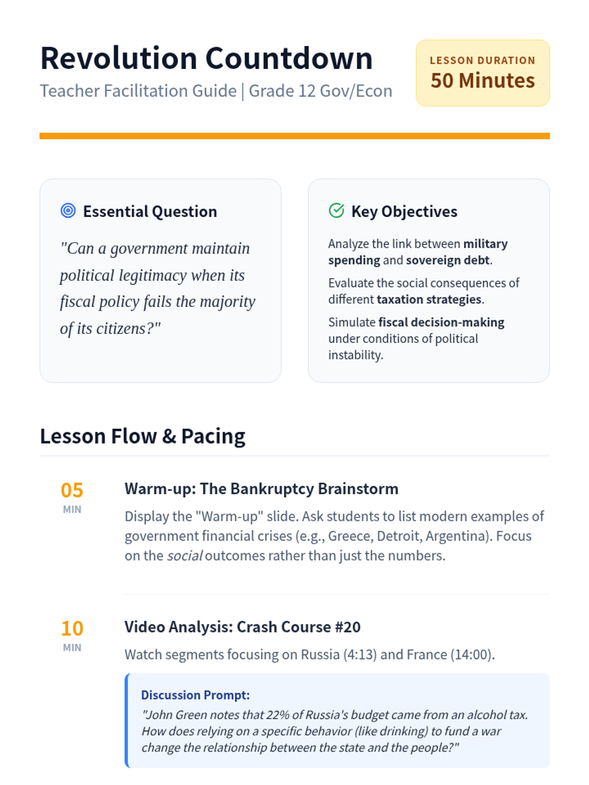 This lesson explores the economic roots of political instability by analyzing how 18th-century warfare led to crushing national debt, unfair taxation, and eventually the French Revolution. Students simulate a budget crisis as advisors to King Louis XVI, weighing the risks of fiscal reform against social unrest.