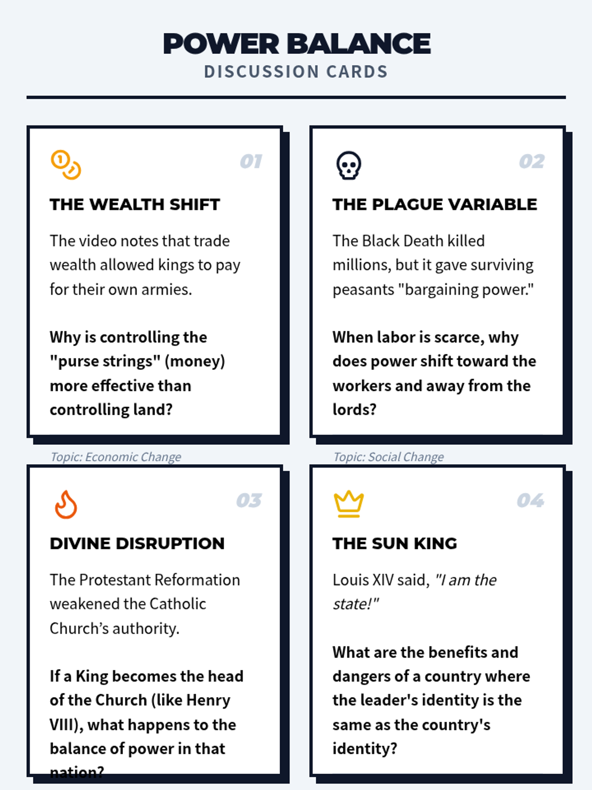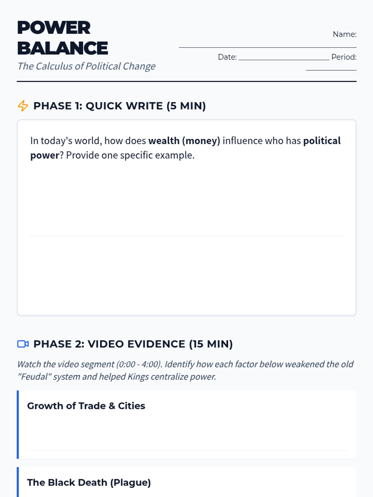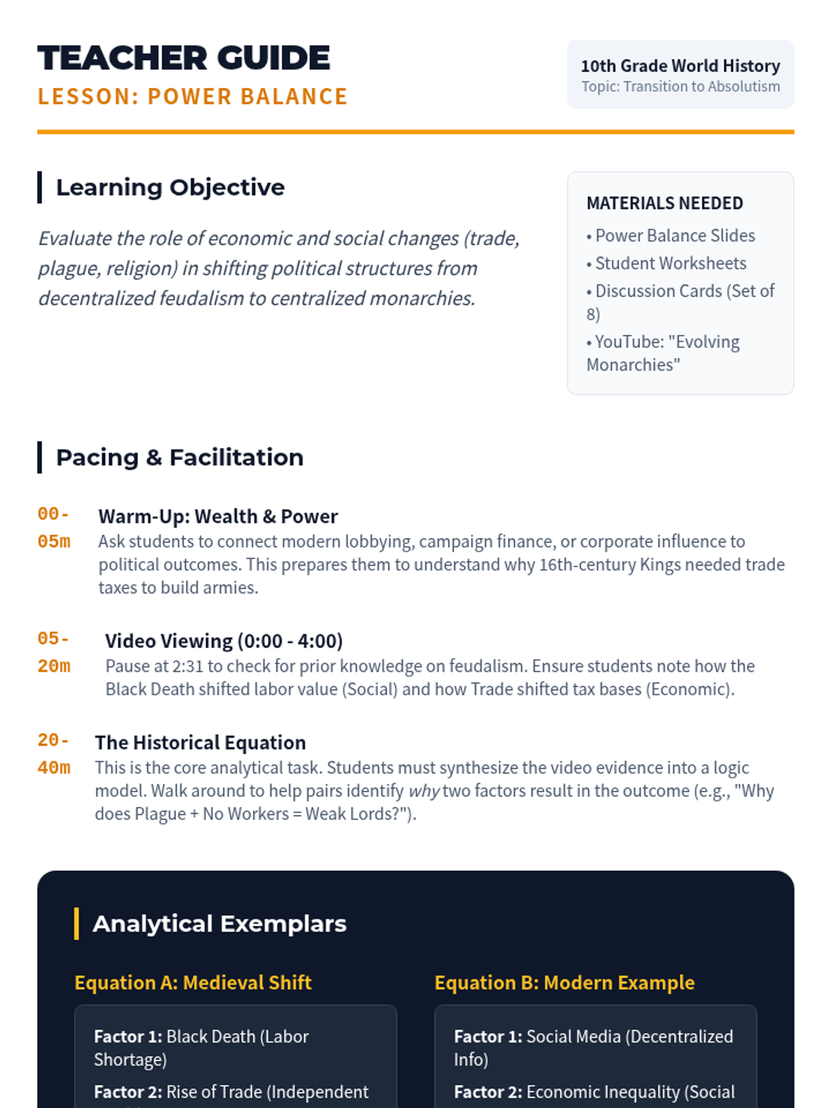 A 10th-grade history lesson examining how economic shifts, the Black Death, and the Reformation catalyzed the transition from feudalism to centralized monarchies. Students use 'Historical Equations' to analyze power dynamics and apply this logic to modern political shifts.