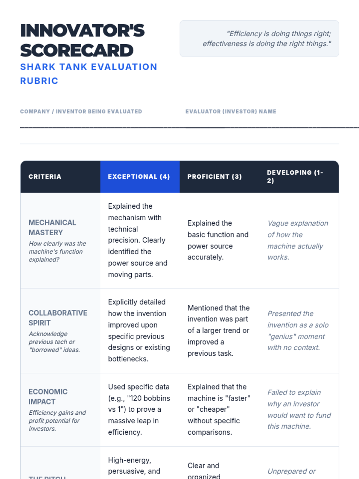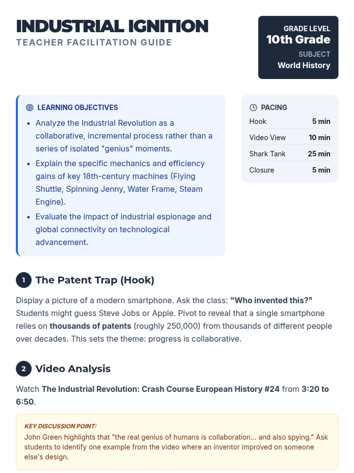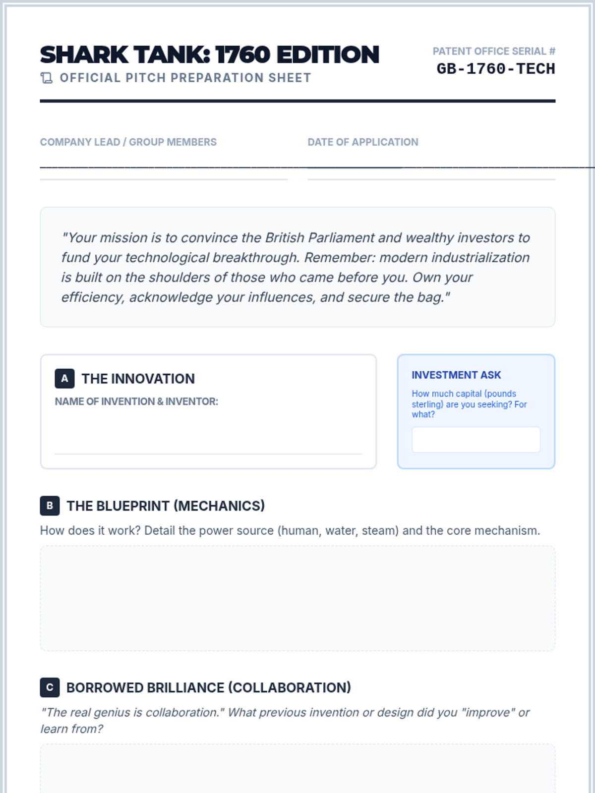 A high-energy 10th-grade history lesson where students pitch Industrial Revolution inventions in a 'Shark Tank' format, focusing on the collaborative nature of technological progress and mechanical efficiency.