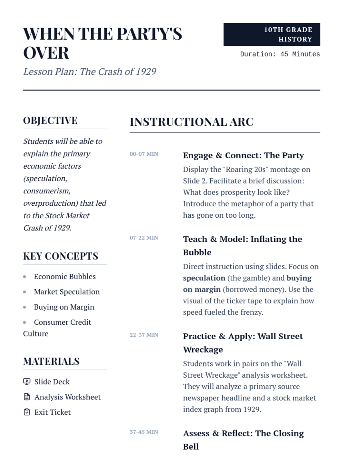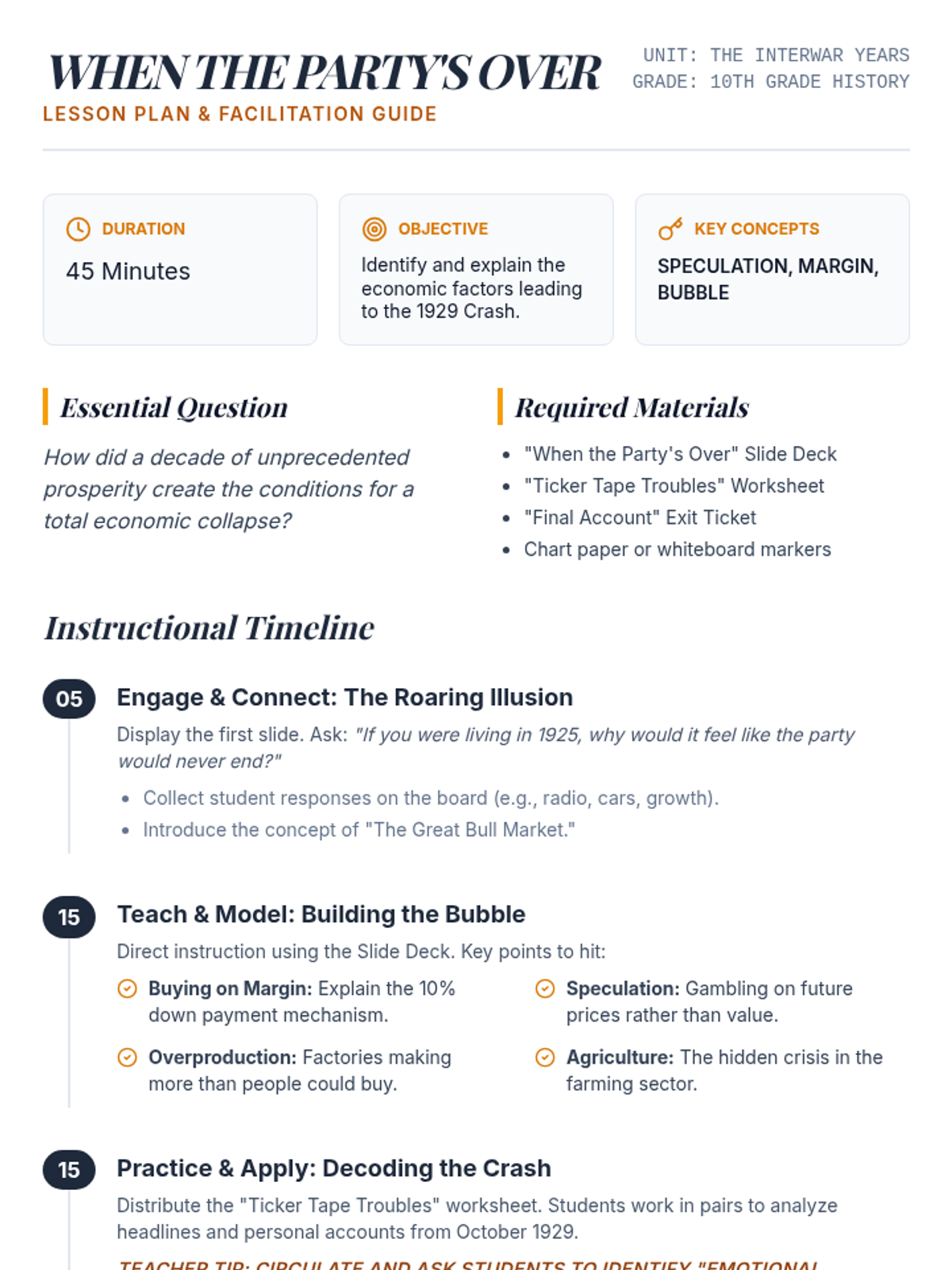 A comprehensive 45-minute lesson exploring the economic mechanisms and social climate that fueled the 1929 Stock Market Crash, featuring primary source analysis and interactive slides.