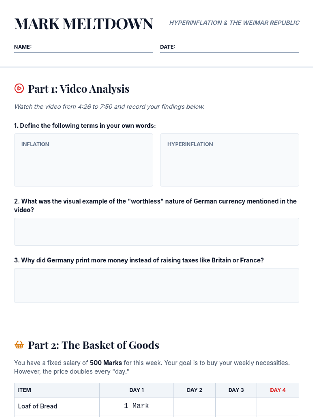 A deep dive into the economic chaos of post-WWI Germany, exploring how hyperinflation destroyed the value of the Mark and destabilized the Weimar Republic through a simulated 'Basket of Goods' activity.