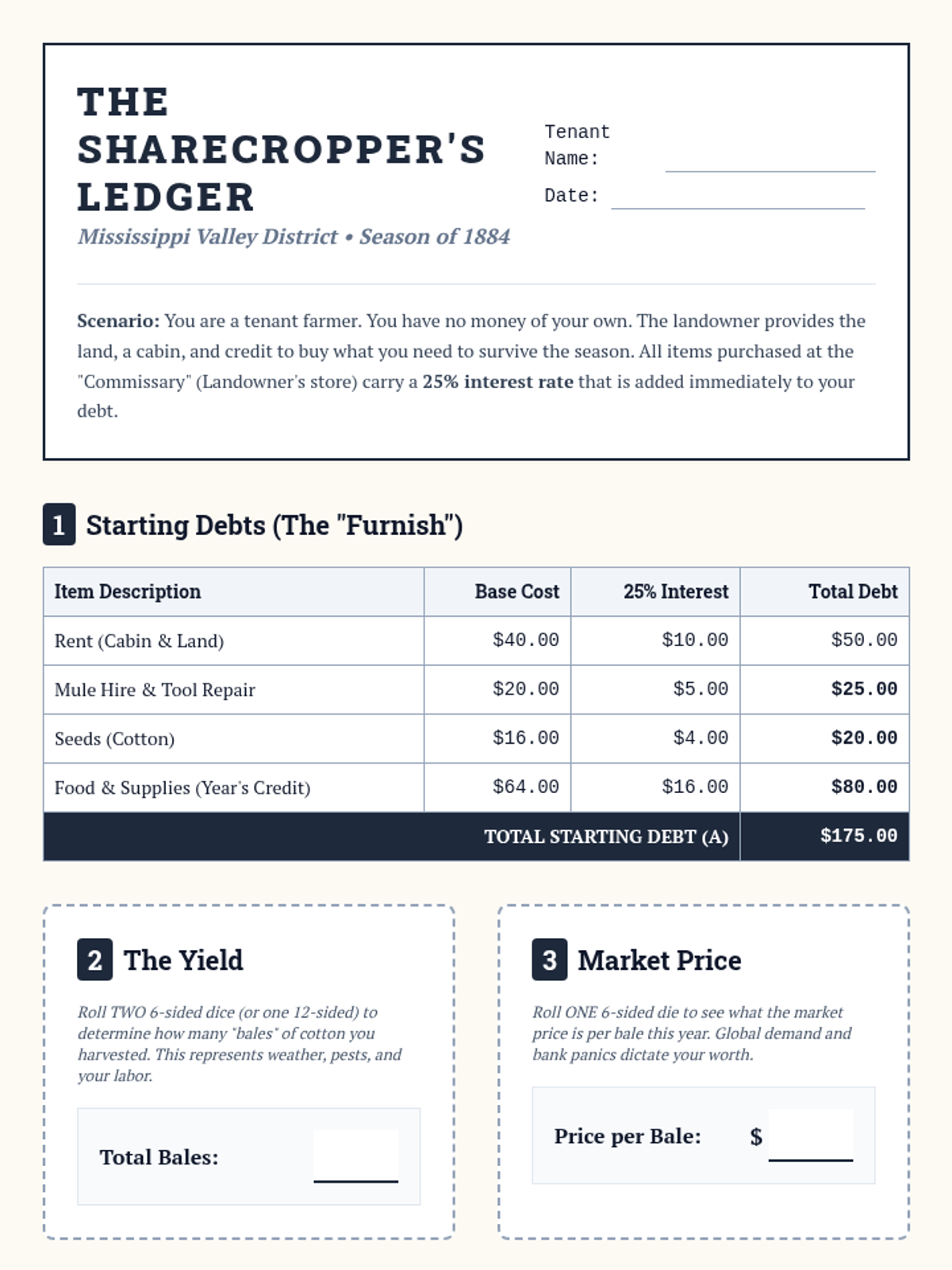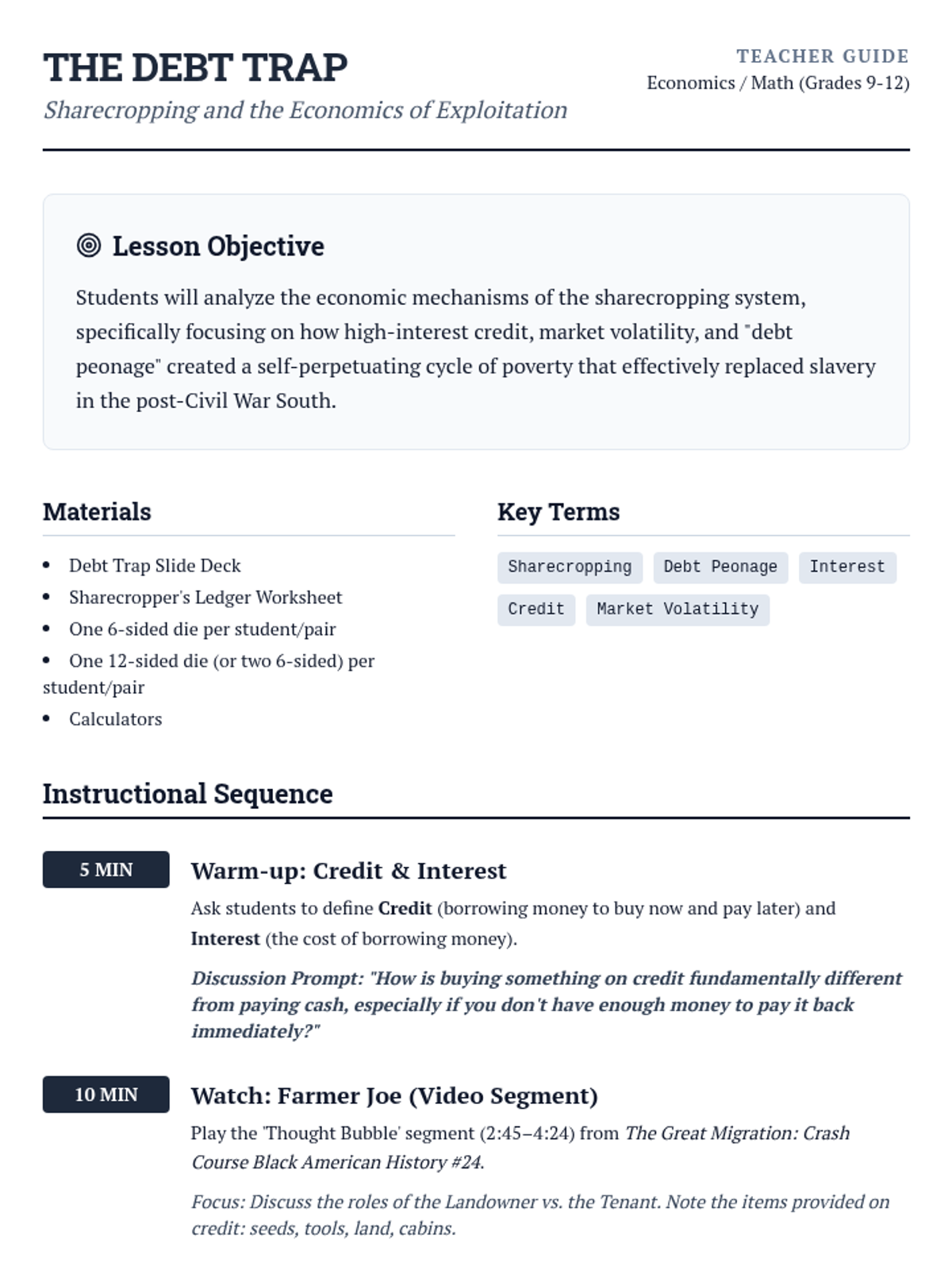 A high school Economics and Math lesson exploring the exploitative cycle of sharecropping and debt peonage following the Civil War, featuring a simulation and video analysis.