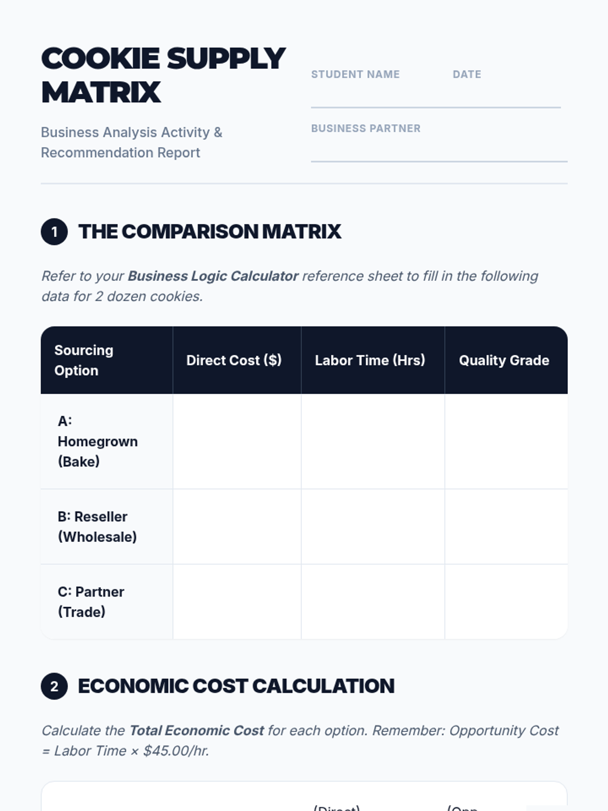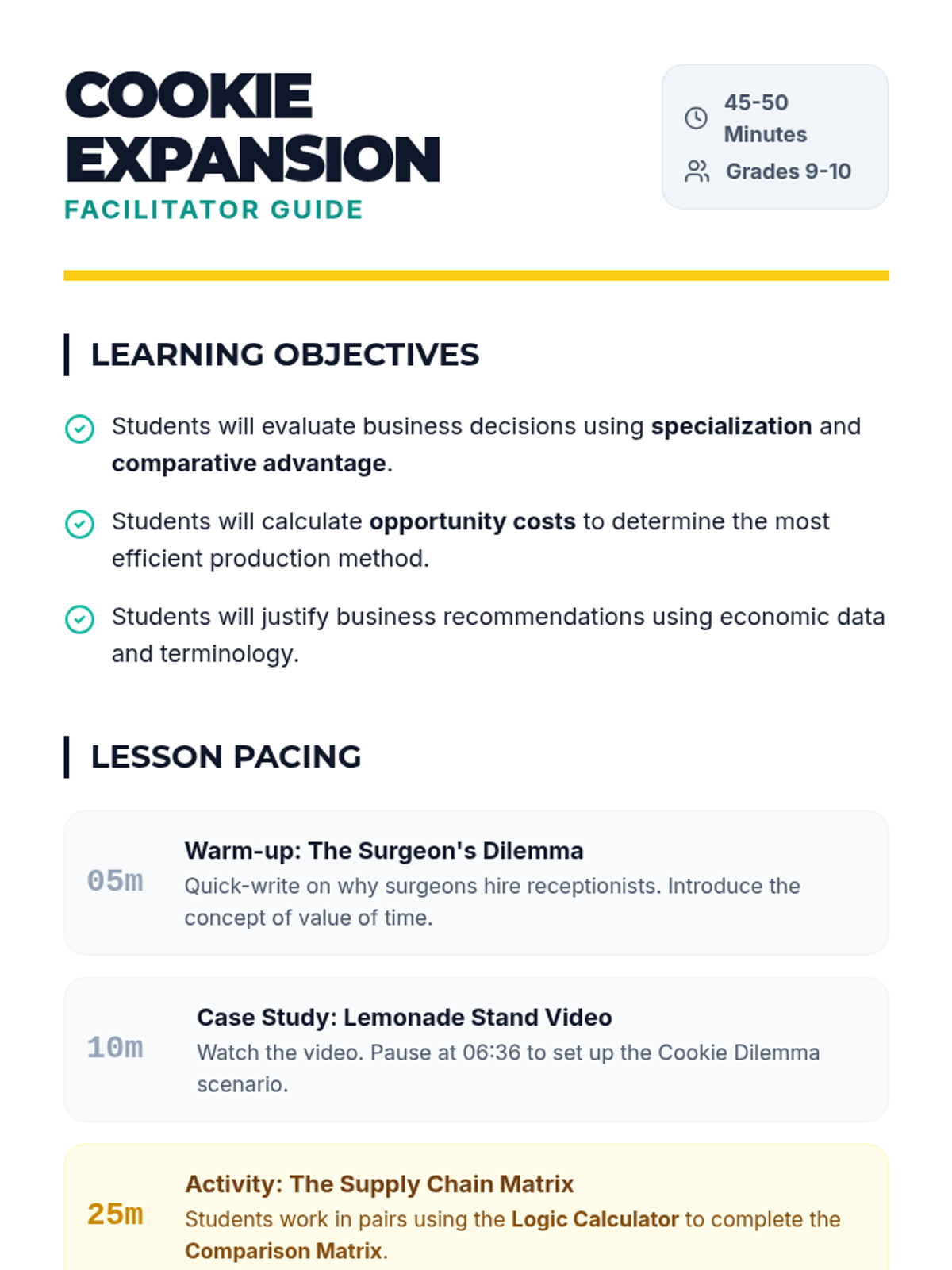 Students evaluate business decisions for a lemonade stand expansion by applying the principles of specialization and comparative advantage to determine the most efficient way to add cookies to the menu.