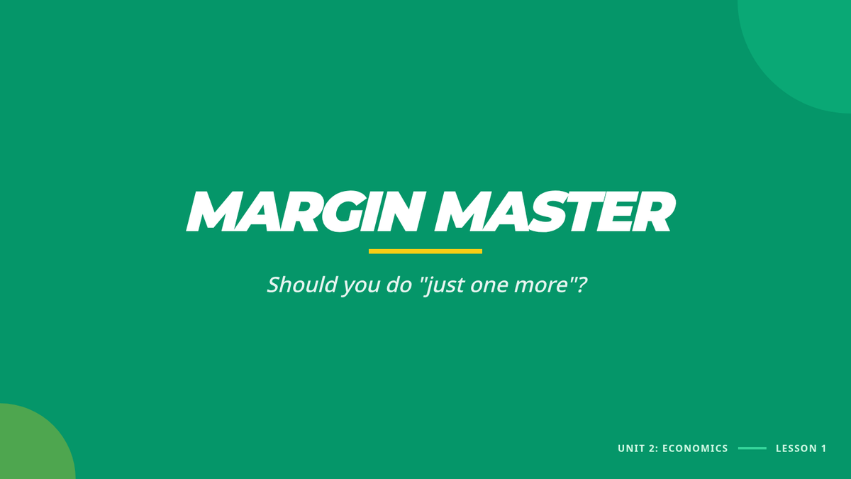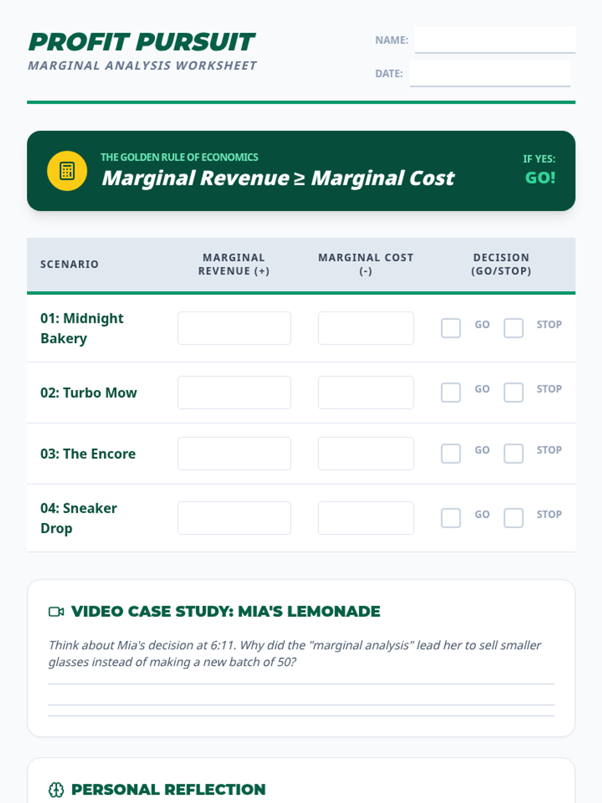 Students explore the economic concept of marginal analysis through a lemonade stand video, business roleplay scenarios, and cost-benefit calculations. They will learn to determine when 'one more' of something is worth the investment by comparing marginal costs and marginal revenues.