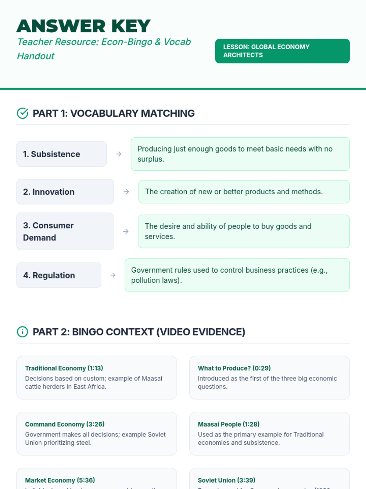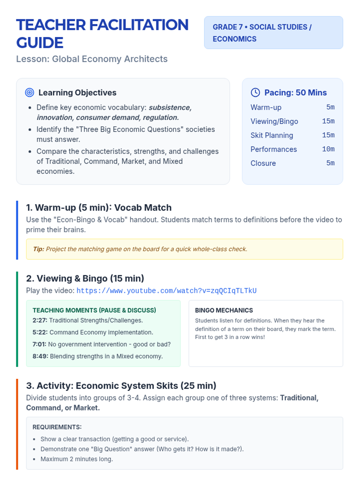 Students explore the four major economic systems (Traditional, Command, Market, and Mixed) through a video-based 'Bingo' game and creative group skits. The lesson focuses on how different societies answer the three fundamental economic questions: What to produce, How to produce, and Who to produce it for.