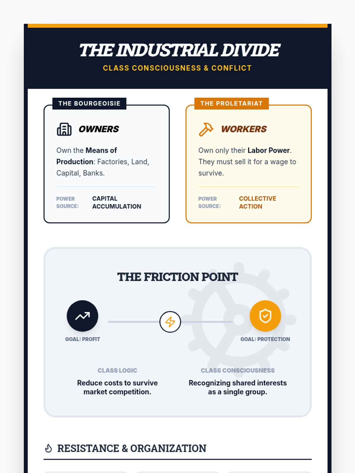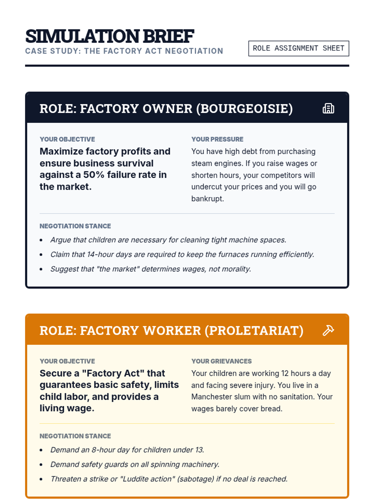 A high-stakes simulation focusing on the rise of class consciousness during the Industrial Revolution, where students negotiate labor conditions as factory owners or workers.