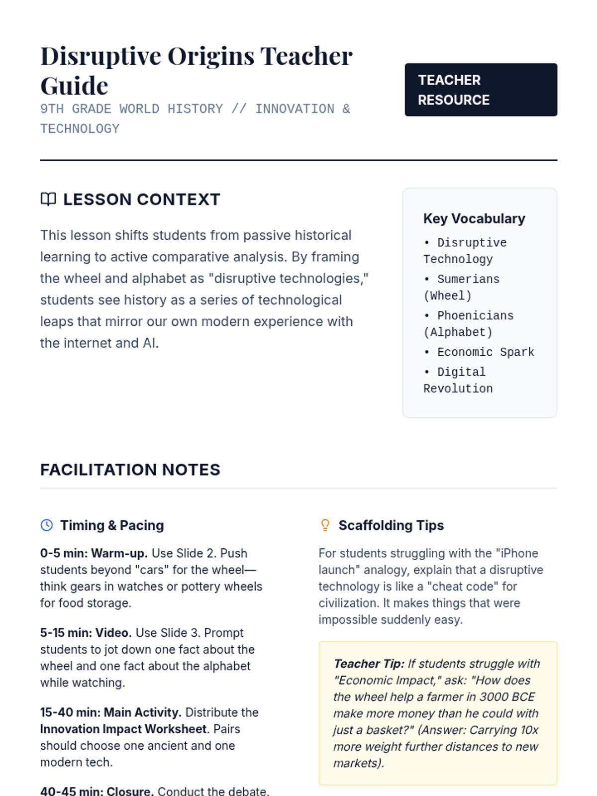 Students analyze the wheel and alphabet as 'disruptive technologies,' drawing parallels between ancient innovations and modern advancements like the internet and AI through a creative 'Tech Spec Sheet' activity.