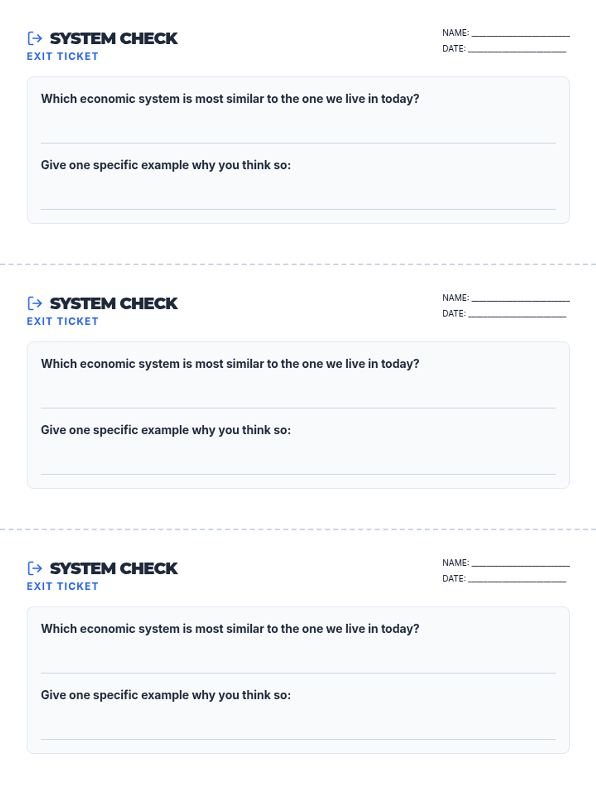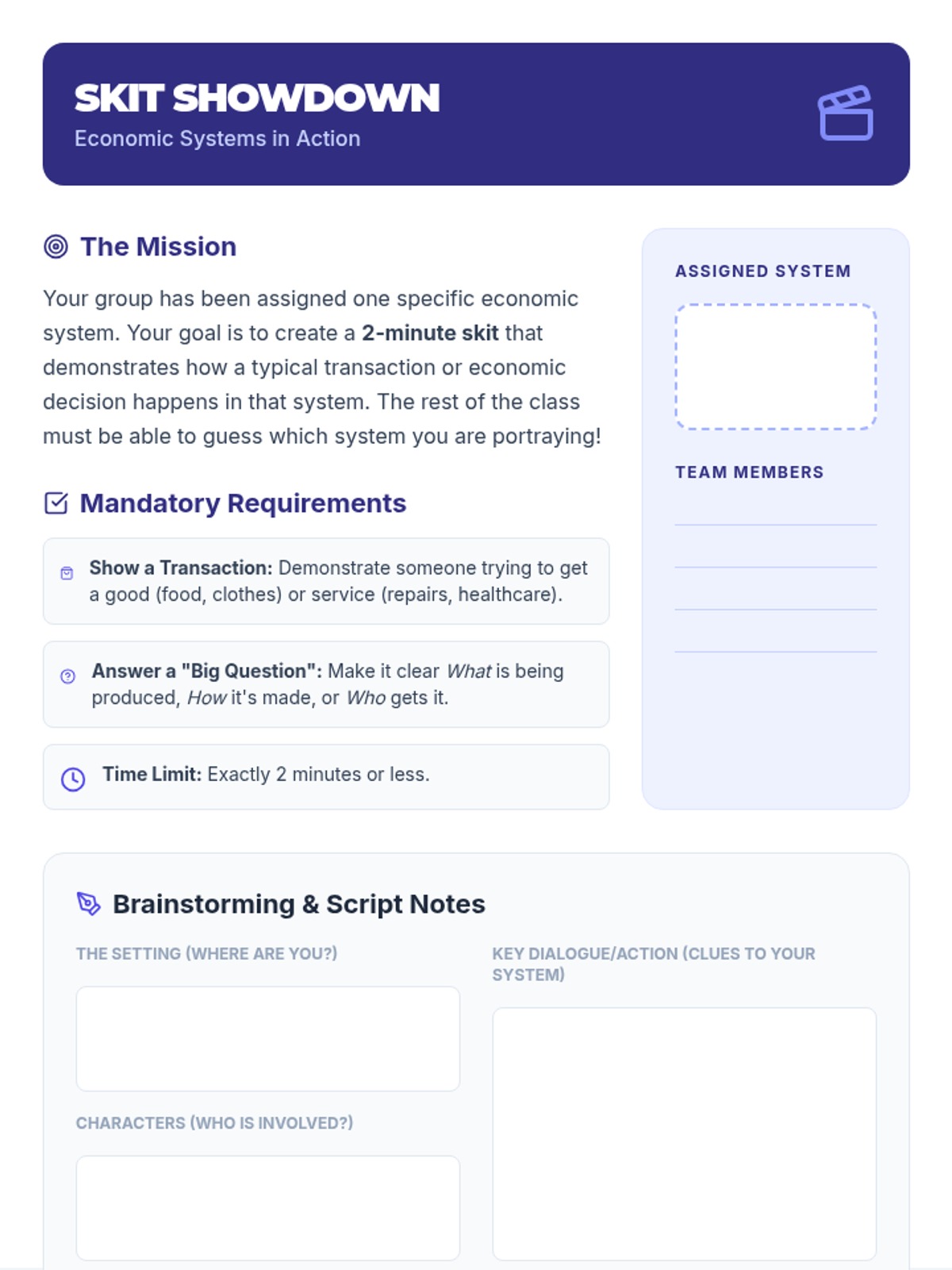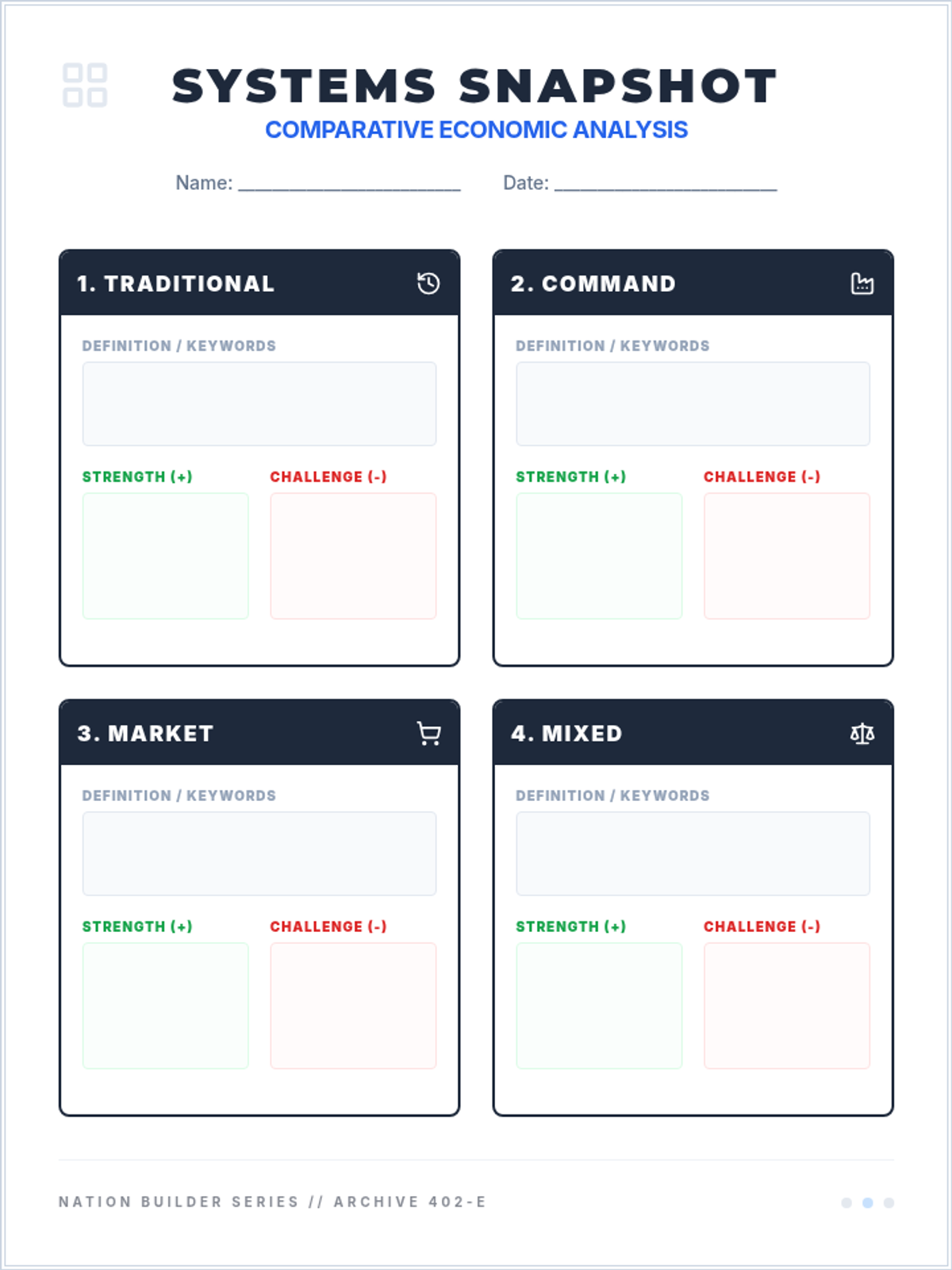 Students analyze traditional, command, market, and mixed economic systems, focusing on how different societies balance economic freedom with social security. Through a series of scenario-based 'briefing cards,' students will propose mixed-economy solutions to real-world problems.