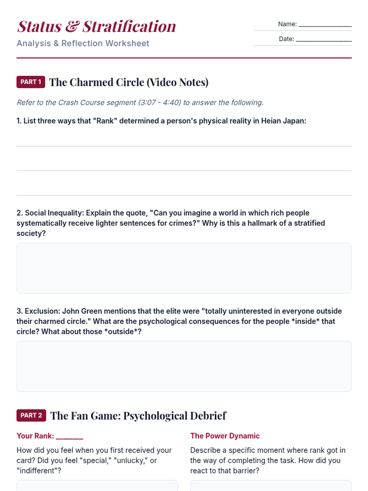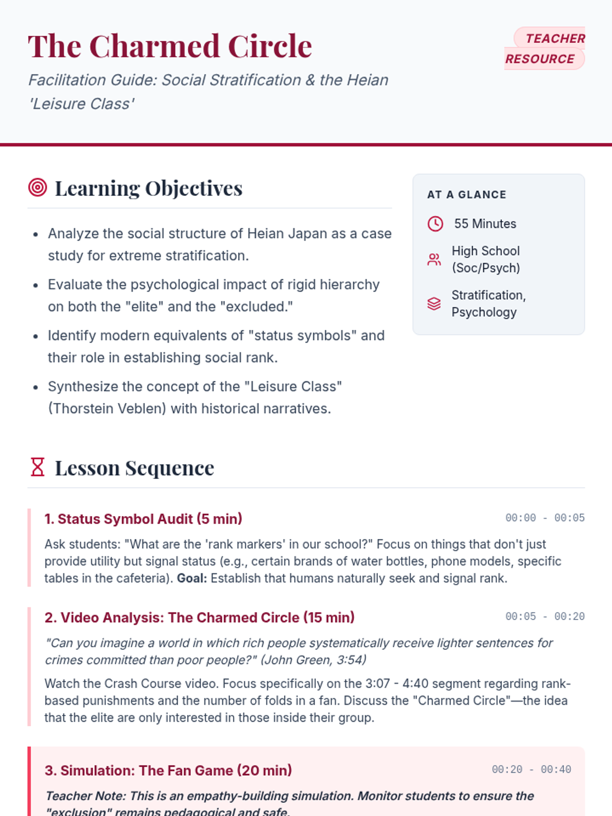 This lesson explores social stratification and the psychology of the 'leisure class' through the lens of Heian Japan. Students will analyze how arbitrary rank determines social privilege and psychological well-being, connecting historical hierarchies to modern status symbols.