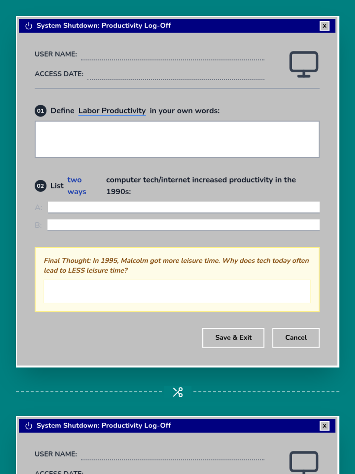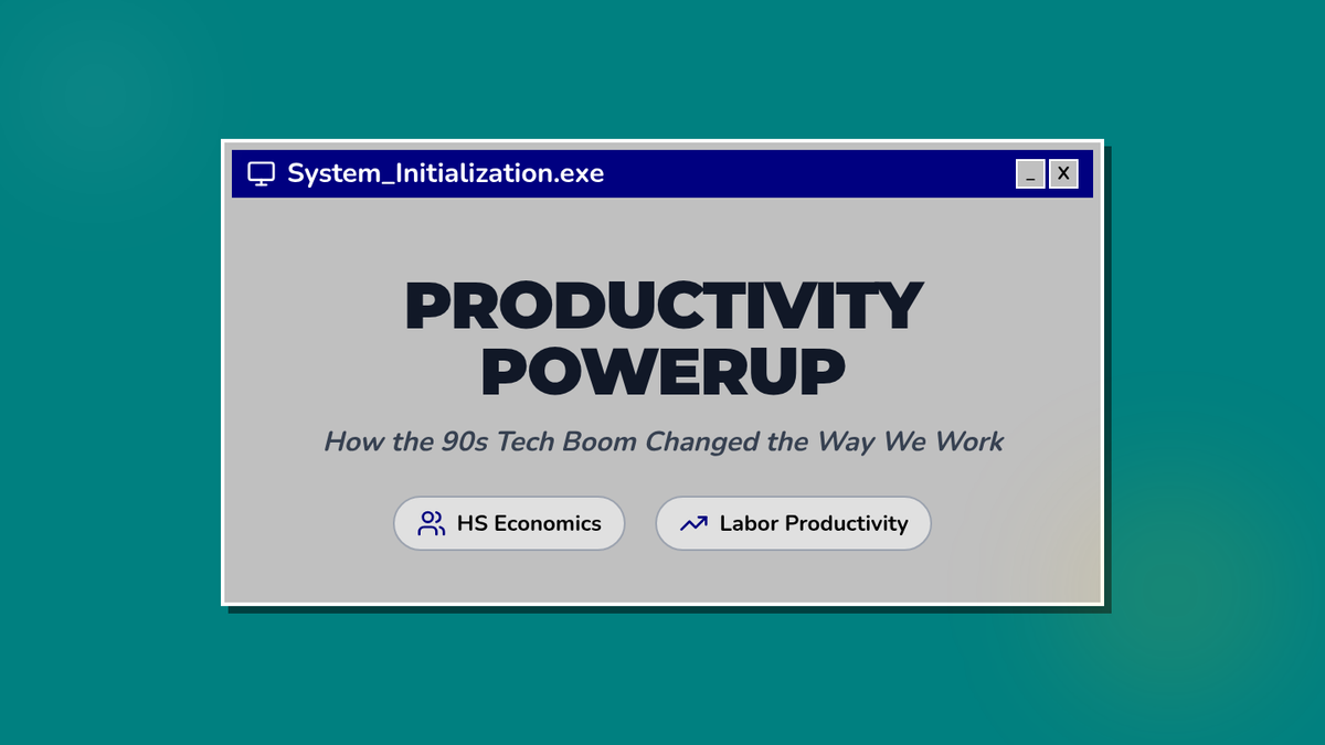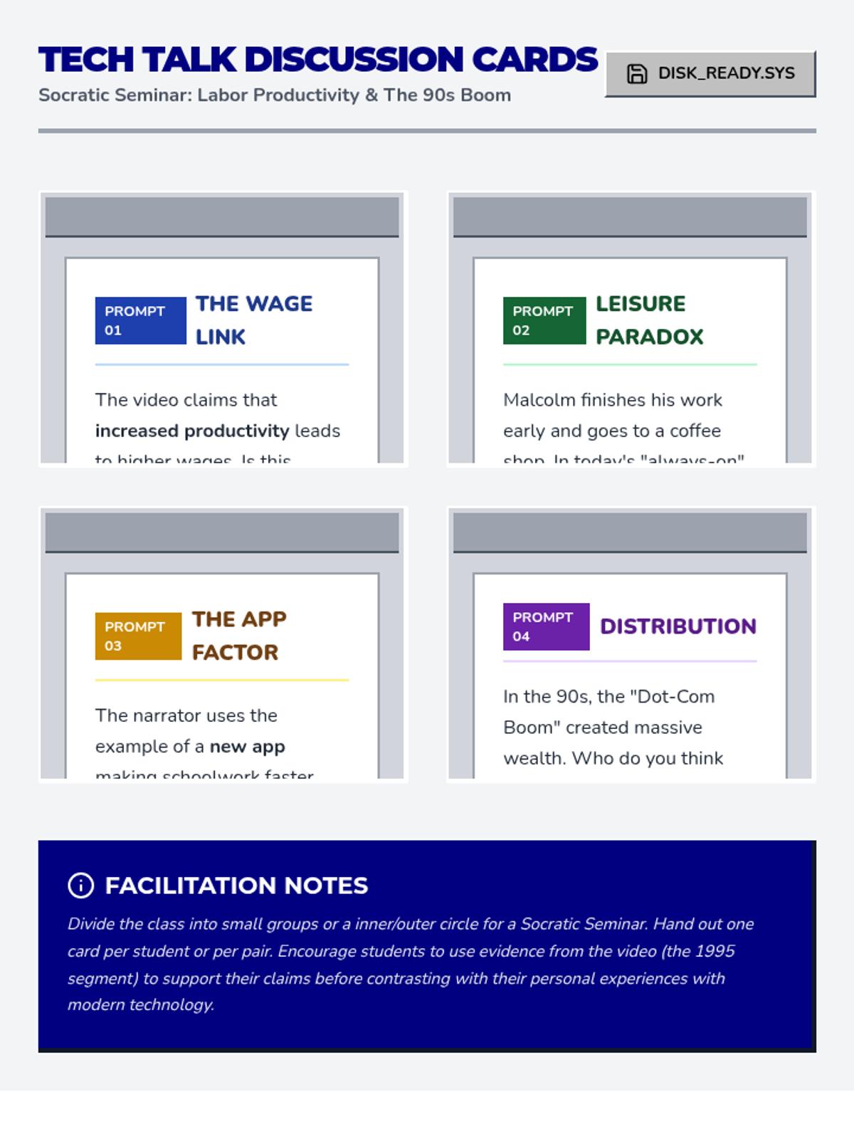 A lesson analyzing the 1990s tech boom to understand the relationship between technological innovation and labor productivity. Students use the 'Paper Chain Challenge' and video analysis to explore how computers, software, and the internet transformed economic output and leisure.