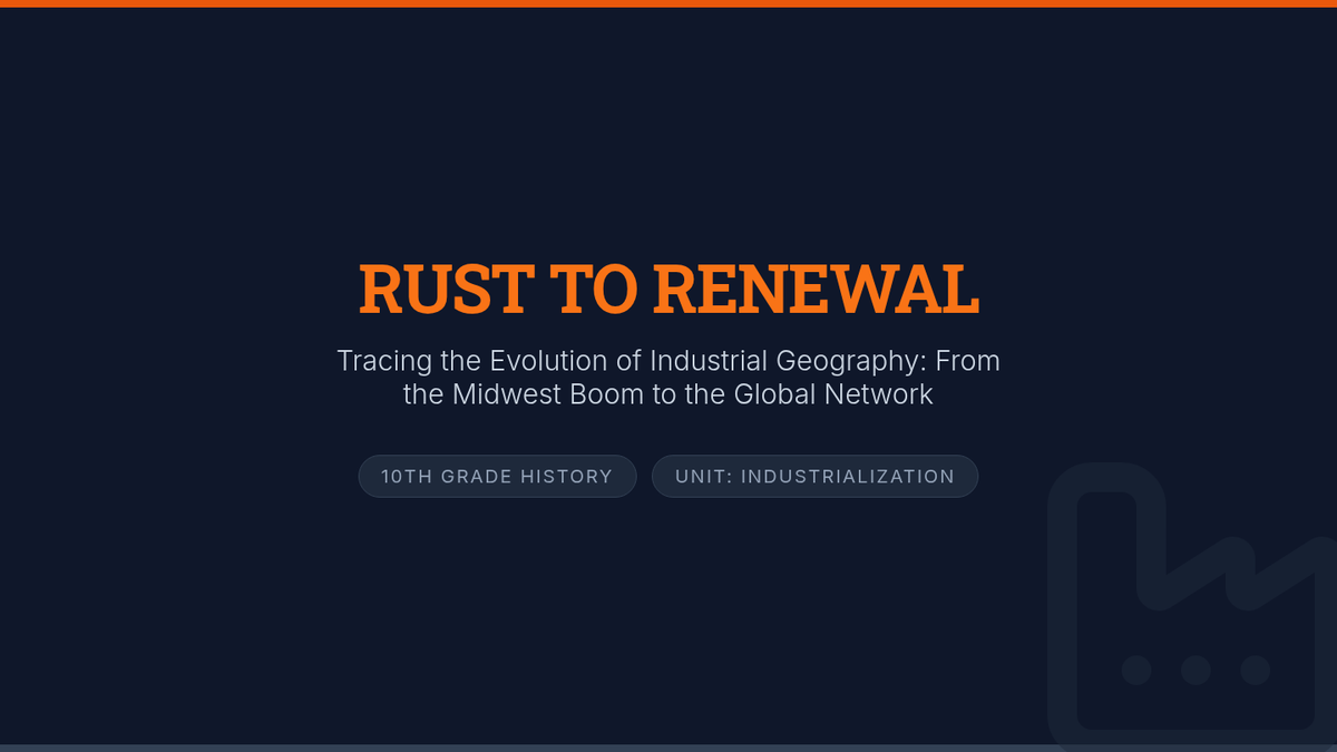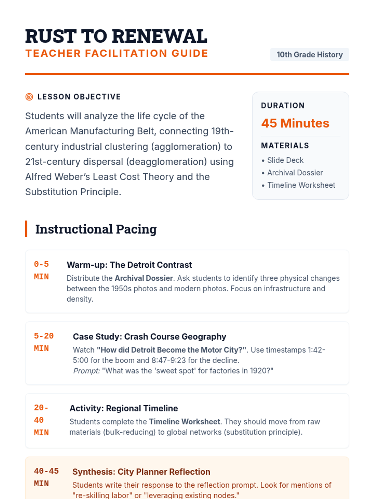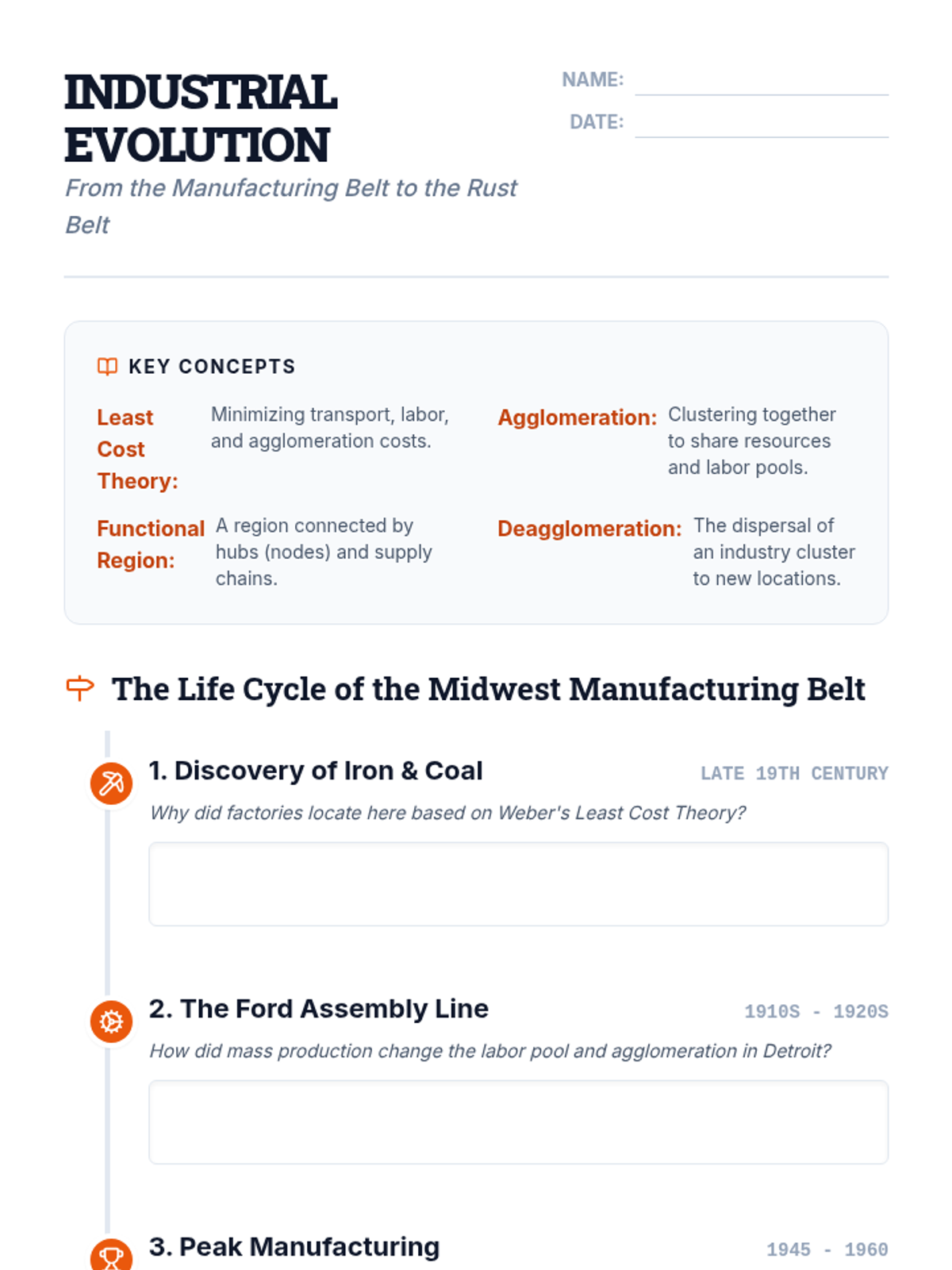 Explore the evolution of industrial geography by connecting the rise of the Midwest's manufacturing belt to modern deagglomeration and outsourcing. Students analyze the life cycle of the Rust Belt through archival imagery, a video case study of Detroit, and a chronological mapping of economic shifts.