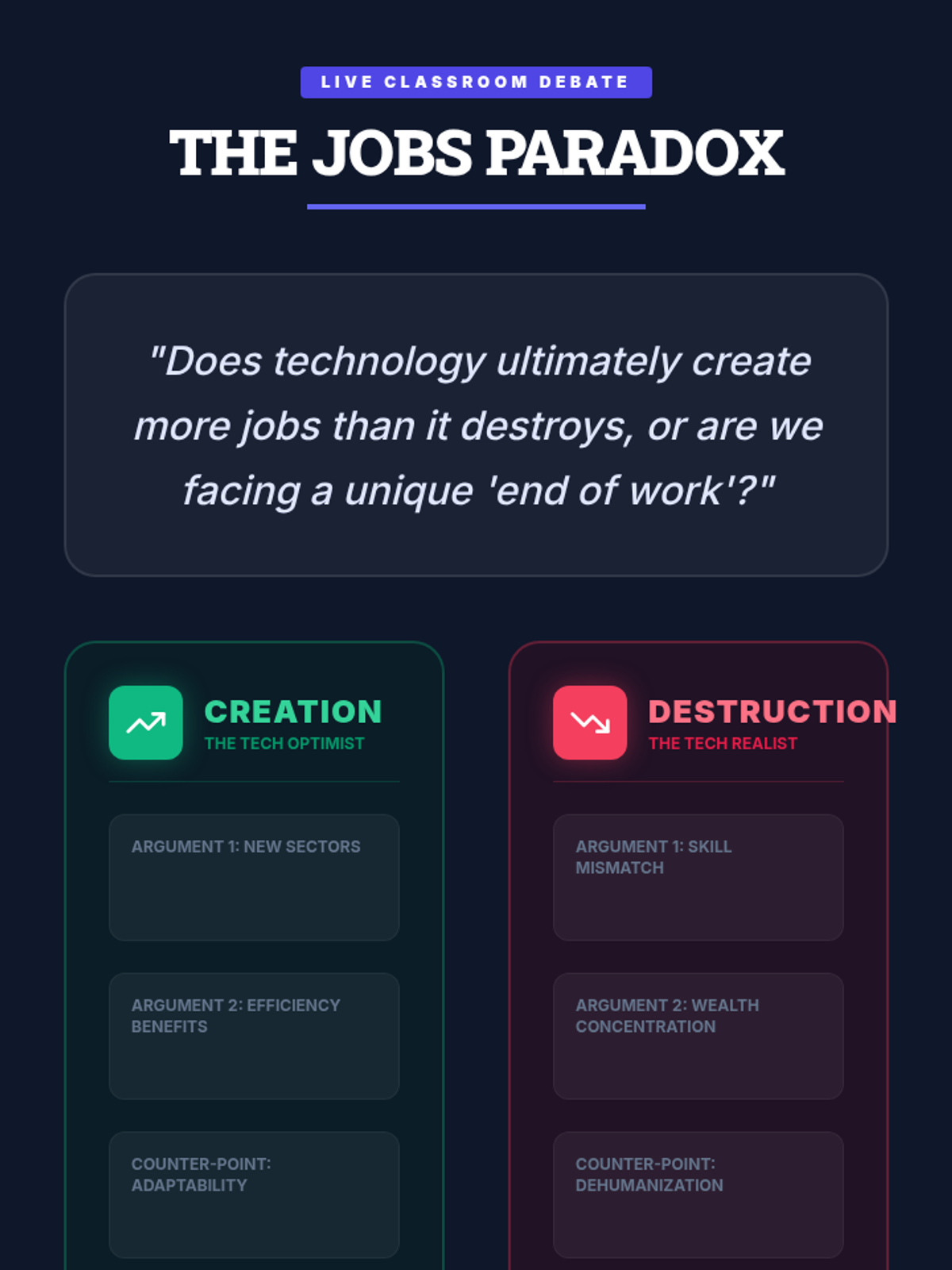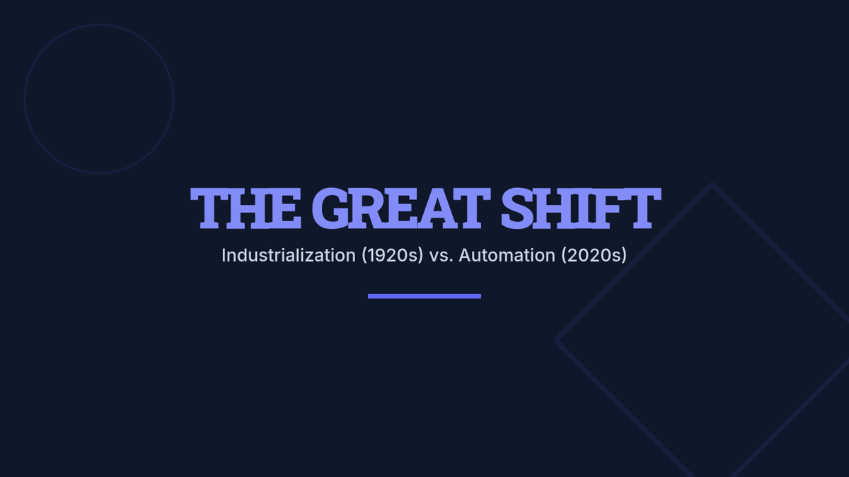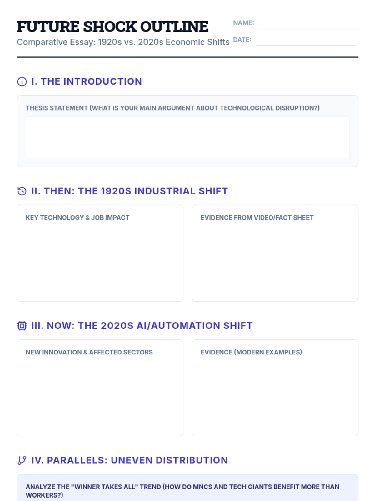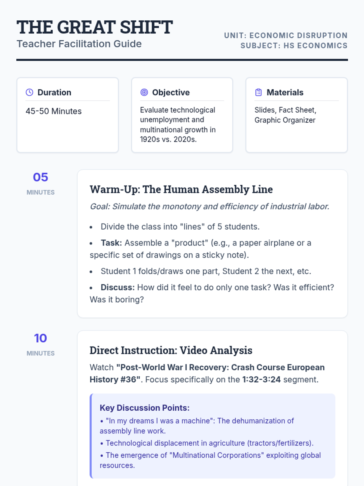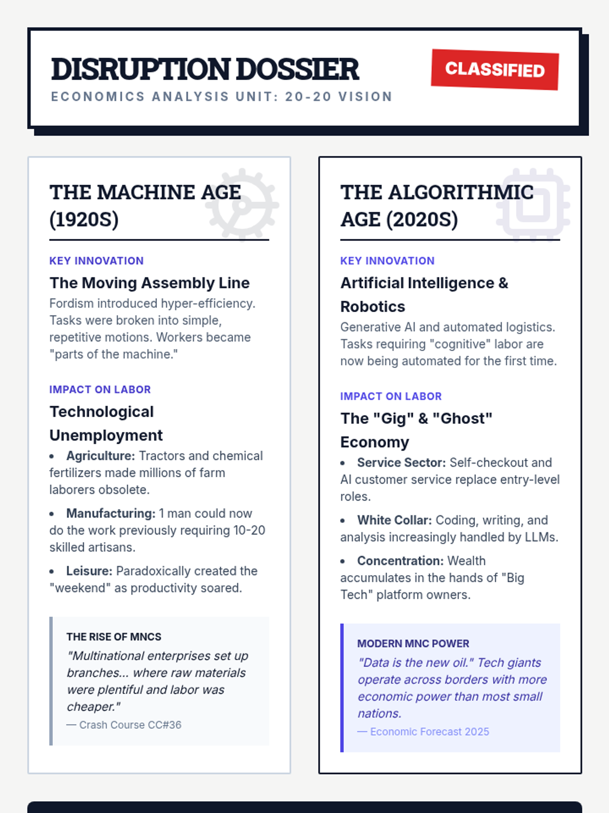 A high school economics lesson exploring the parallels between industrialization in the 1920s and the AI revolution of the 2020s, focusing on technological unemployment and the rise of multinational corporations.