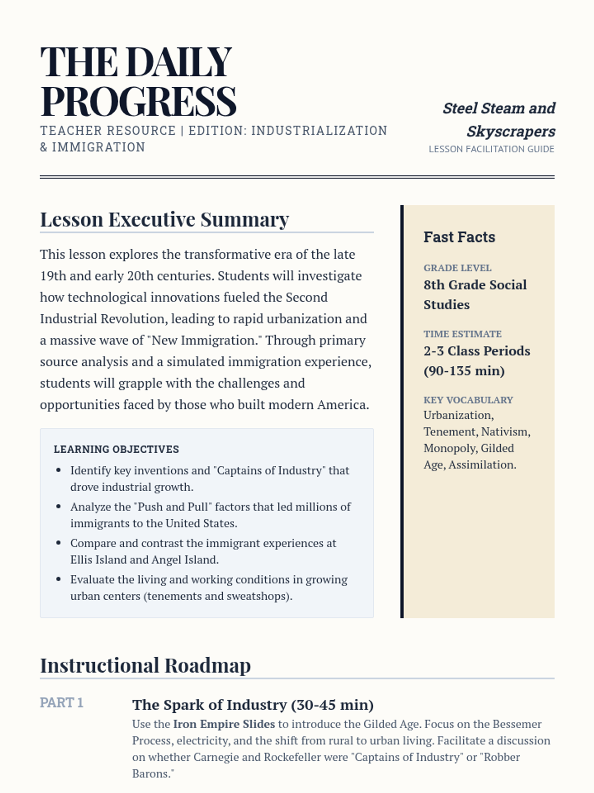 A comprehensive lesson exploring the socio-economic transformations of the 19th-century Industrial Revolution through the lens of innovation, labor, and urbanization. Students engage in role-play to debate the impacts of new technologies.