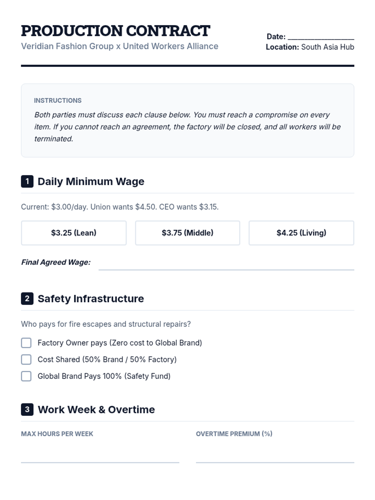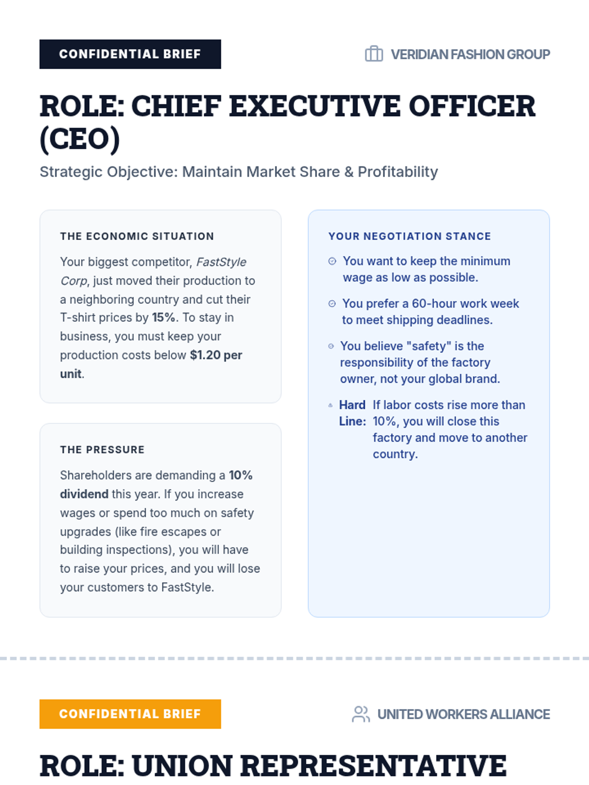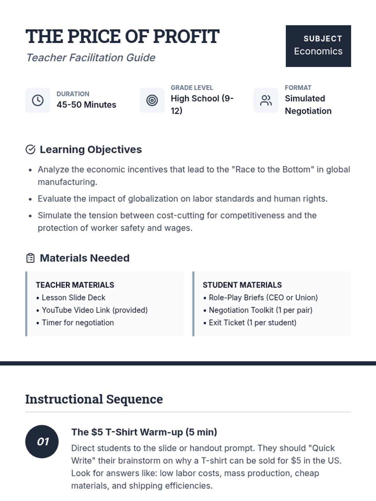 This lesson explores the 'Race to the Bottom' through the lens of economic incentives, globalization, and labor rights. Students participate in a high-stakes negotiation simulation between global CEOs and union leaders to understand the trade-offs between profit and human rights.