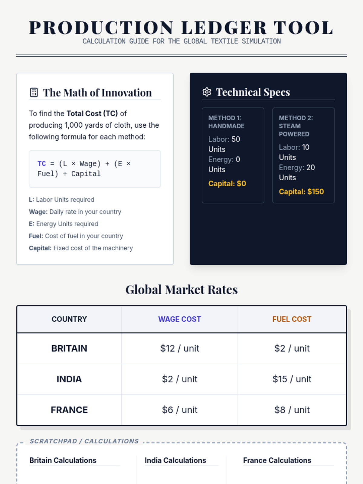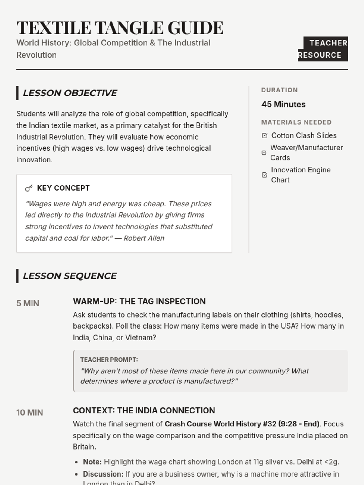 A 10th-grade World History lesson exploring how global competition with the Indian textile industry incentivized the British Industrial Revolution. Students participate in a role-play competition to understand the economic pressures that led to mechanization.
