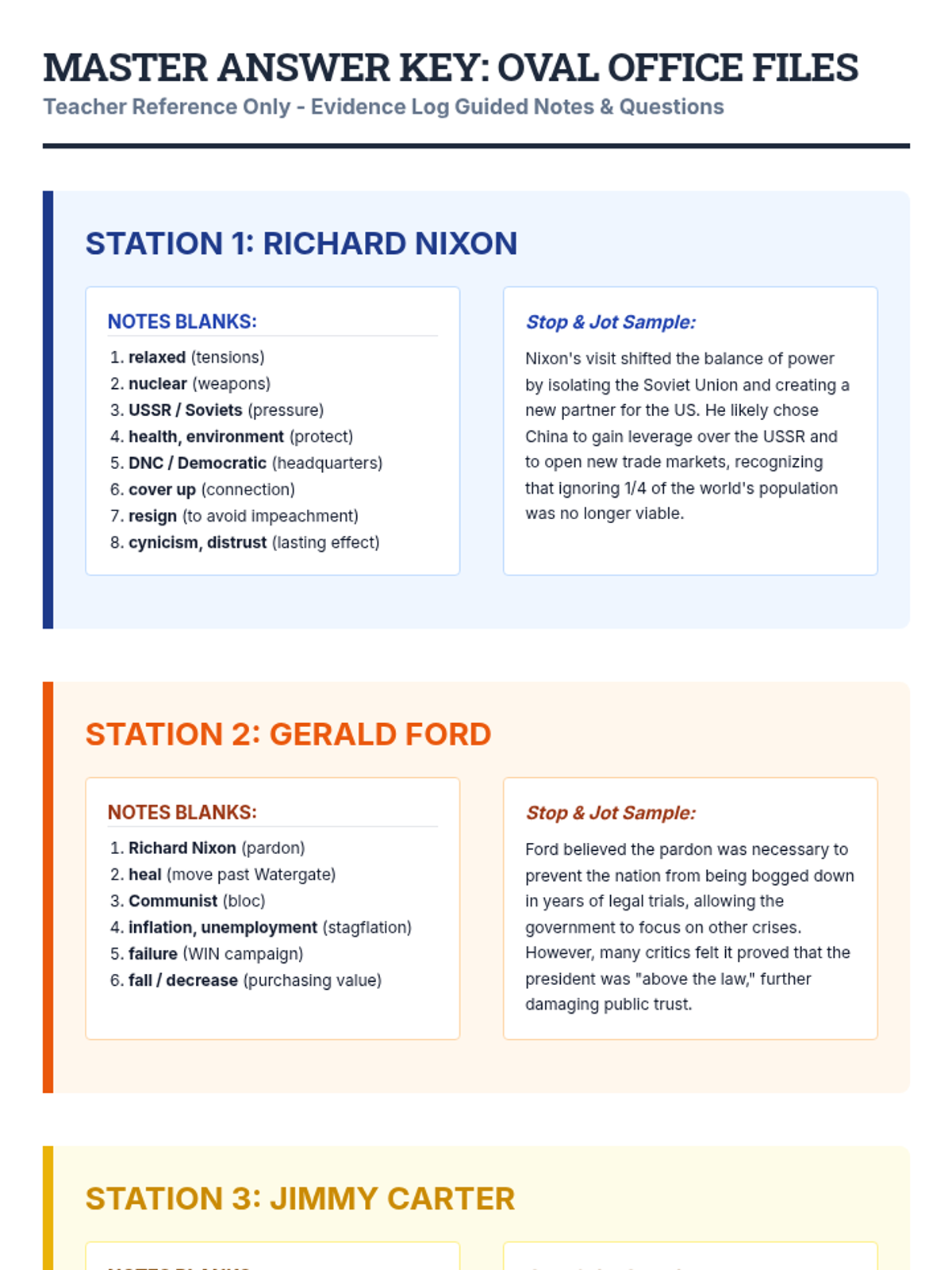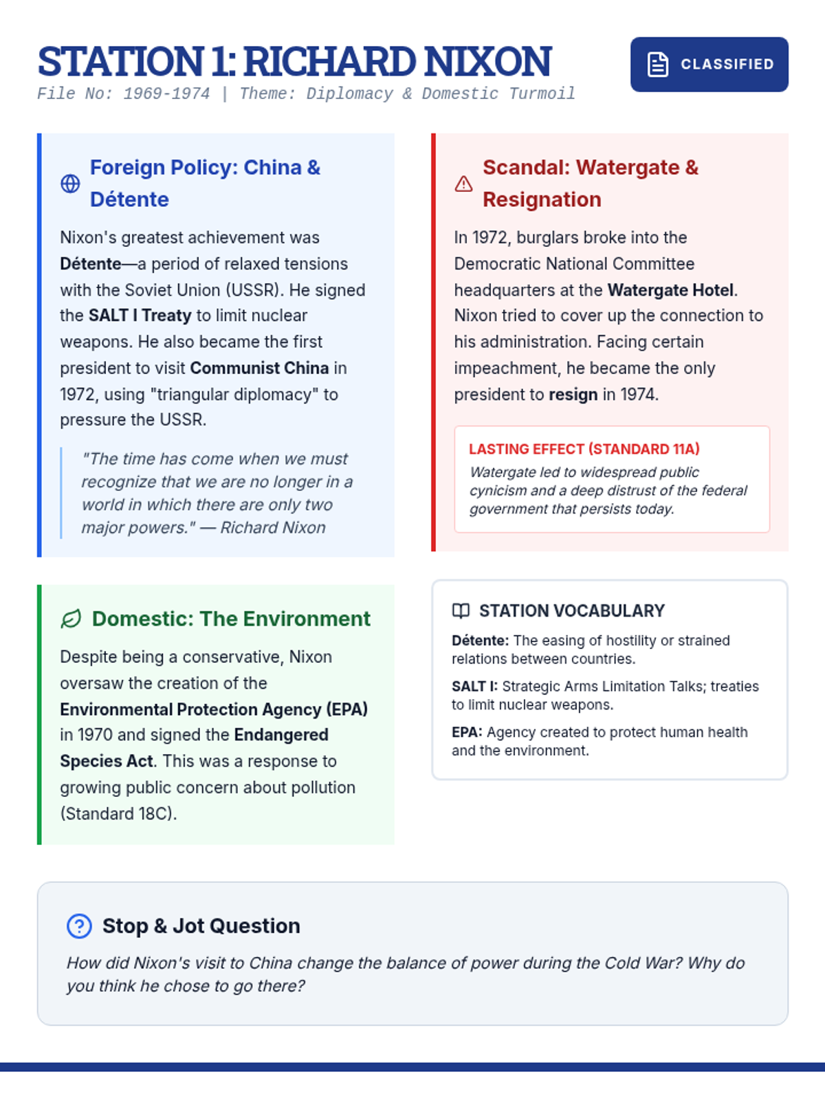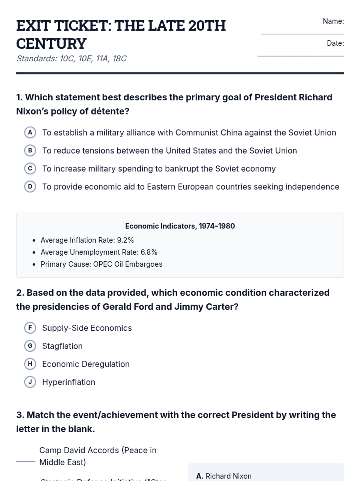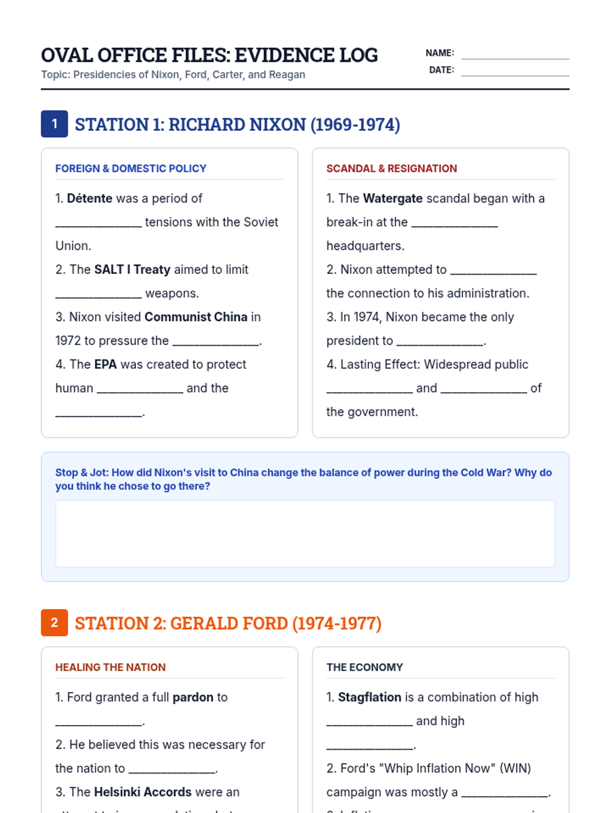 A comprehensive lesson covering the presidencies of Nixon, Ford, Carter, and Reagan, focusing on key events, scandals, economic shifts, and the rise of conservatism. Students engage with primary sources and data to analyze the changing landscape of late 20th-century America.