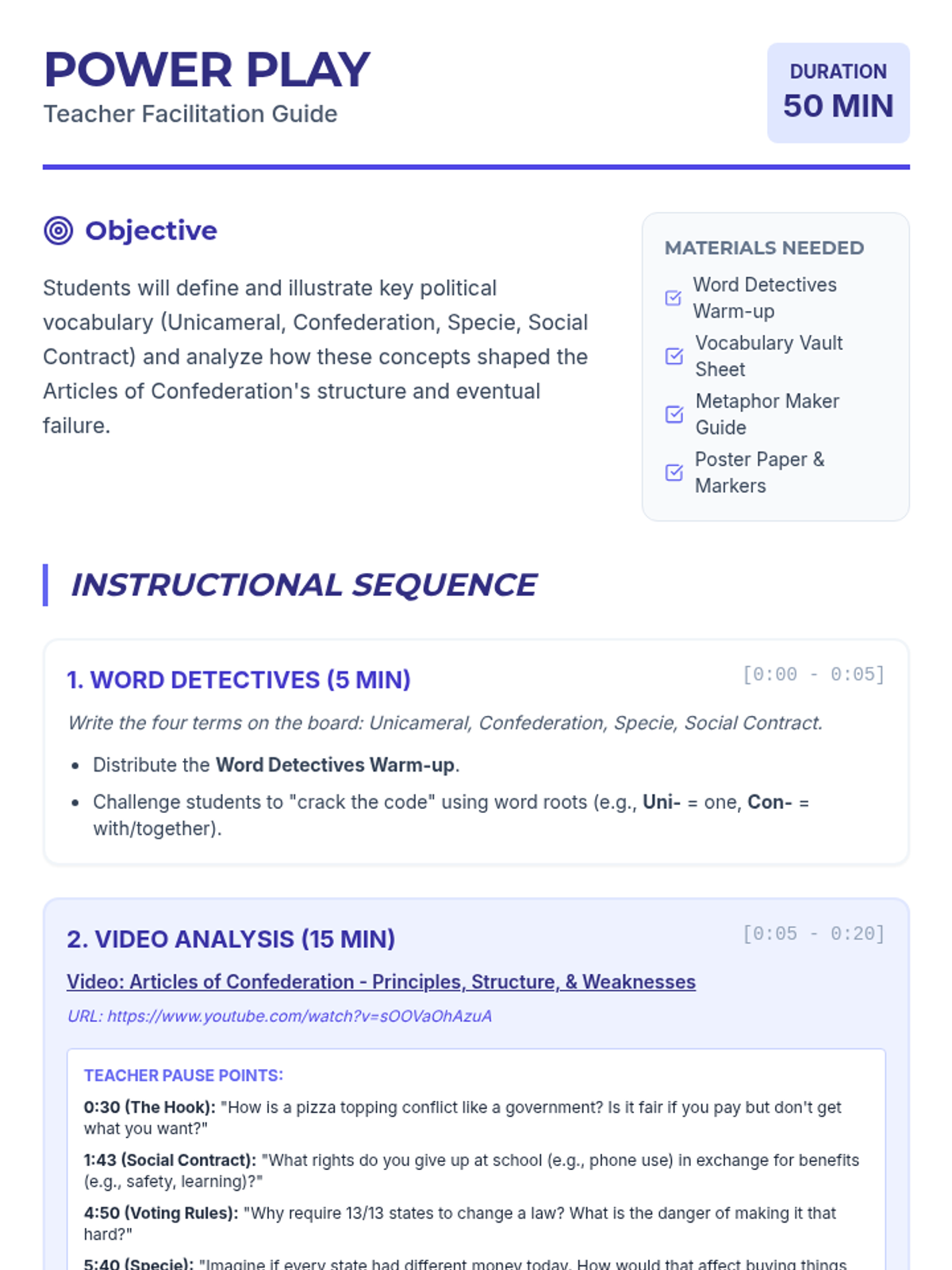 Students will explore the foundational principles and structural weaknesses of the Articles of Confederation. They will define key political vocabulary through video analysis and create visual metaphors to demonstrate their understanding of power dynamics in early American government.
