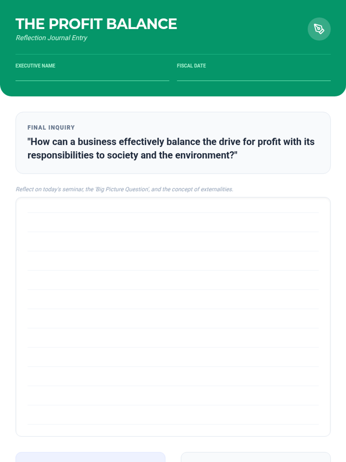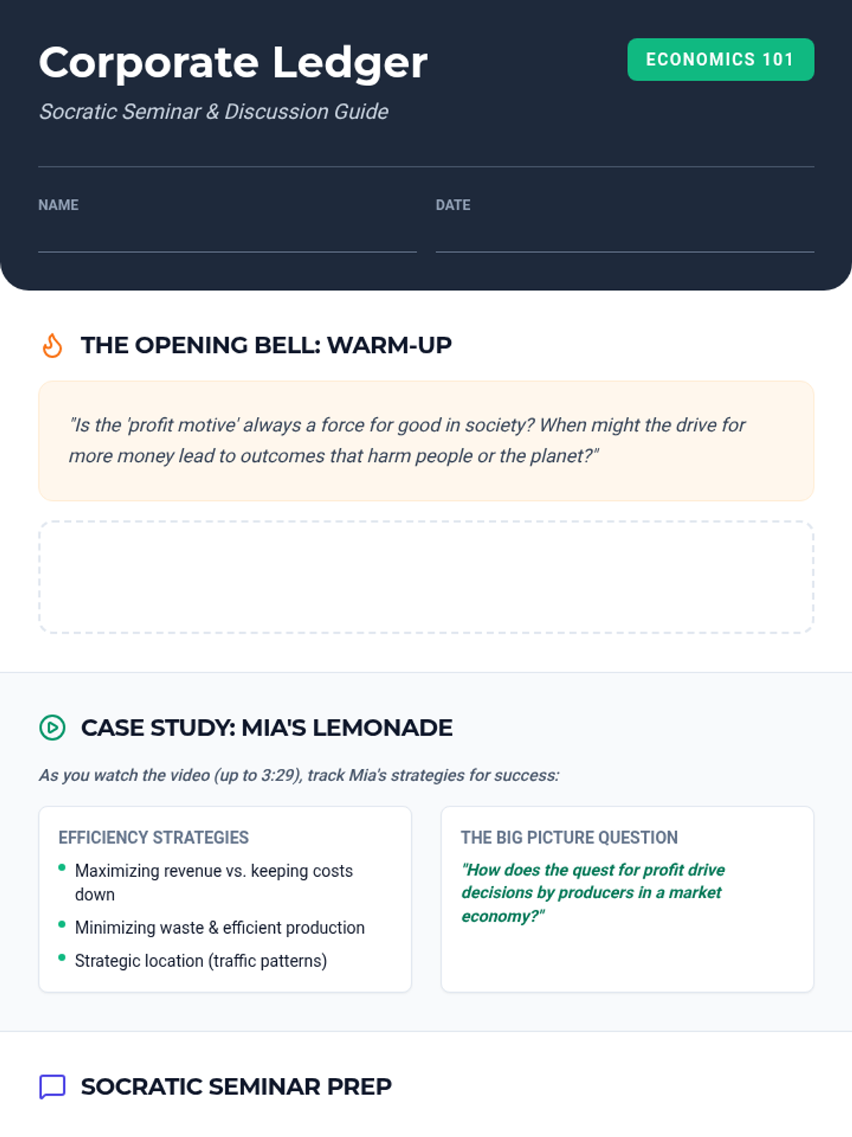 This lesson explores the 'profit motive' in a market economy, challenging high school students to analyze both its practical benefits (efficiency, innovation) and its ethical implications (externalities, labor, environment) through a Socratic Seminar.