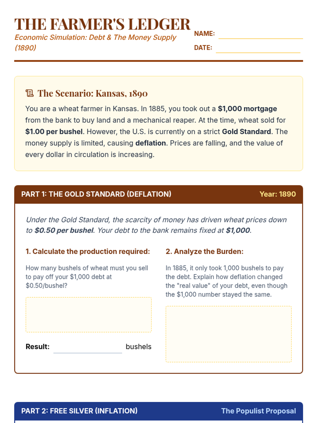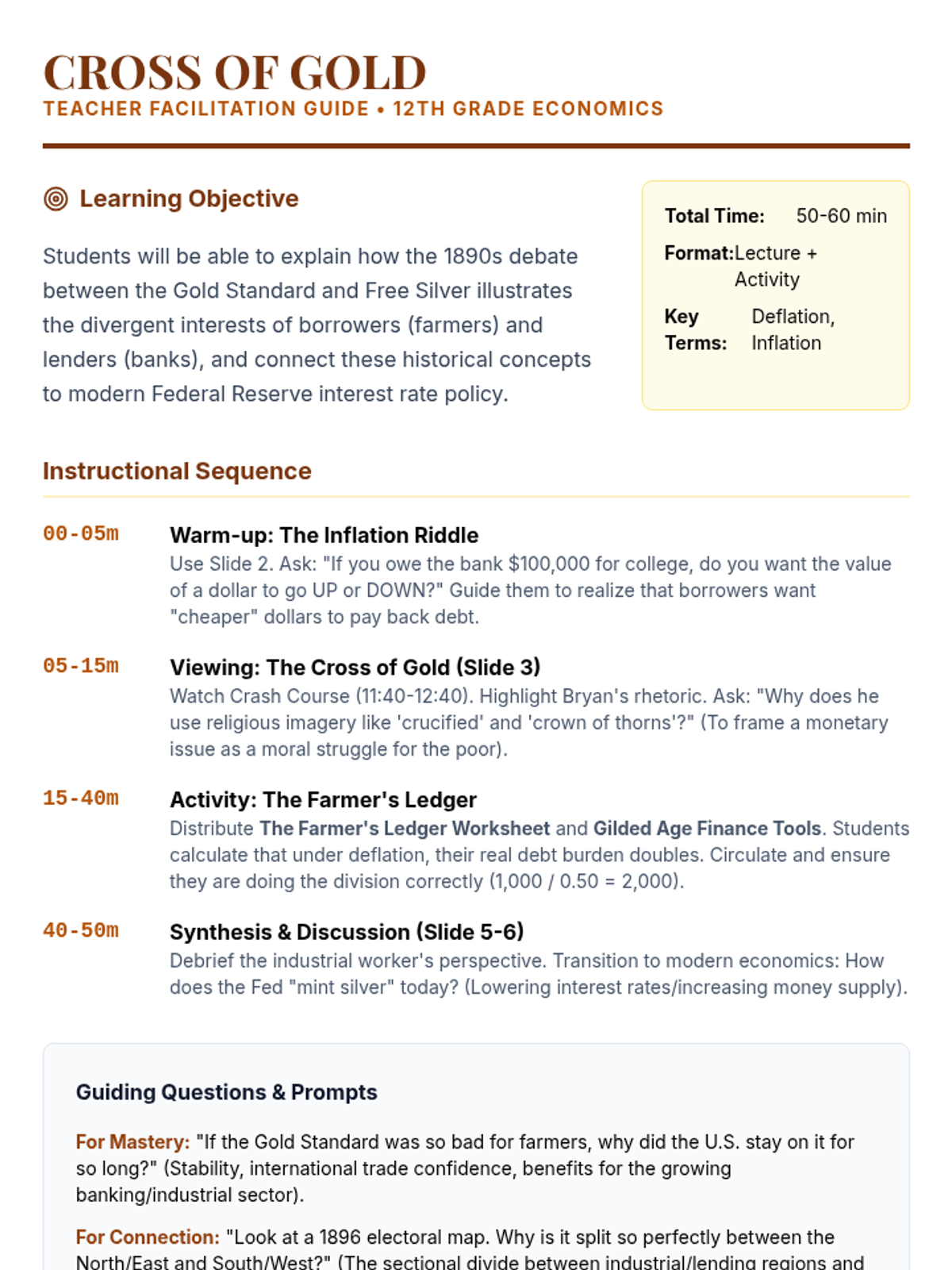 A high school economics lesson exploring the 1890s debate between the Gold Standard and Free Silver, focusing on the impact of inflation and deflation on different economic classes. Students calculate debt burdens for Gilded Age farmers and connect historical monetary policy to modern Federal Reserve actions.