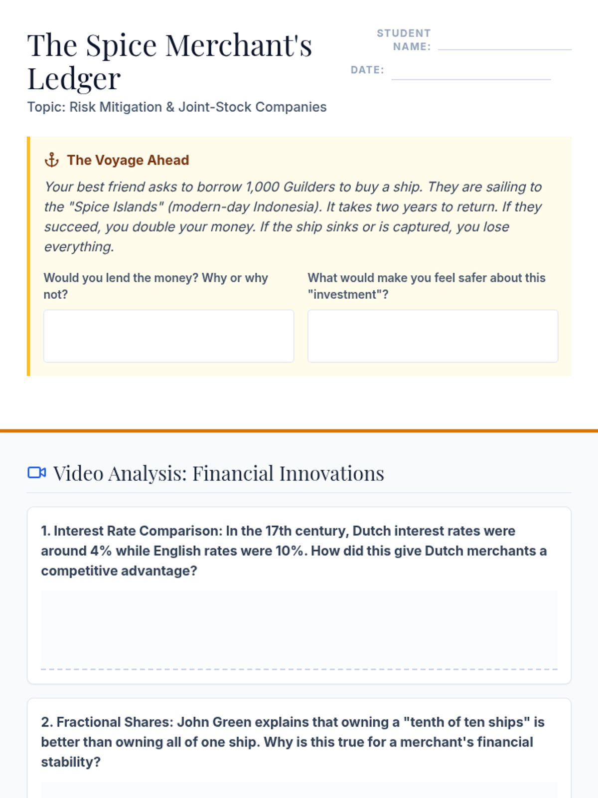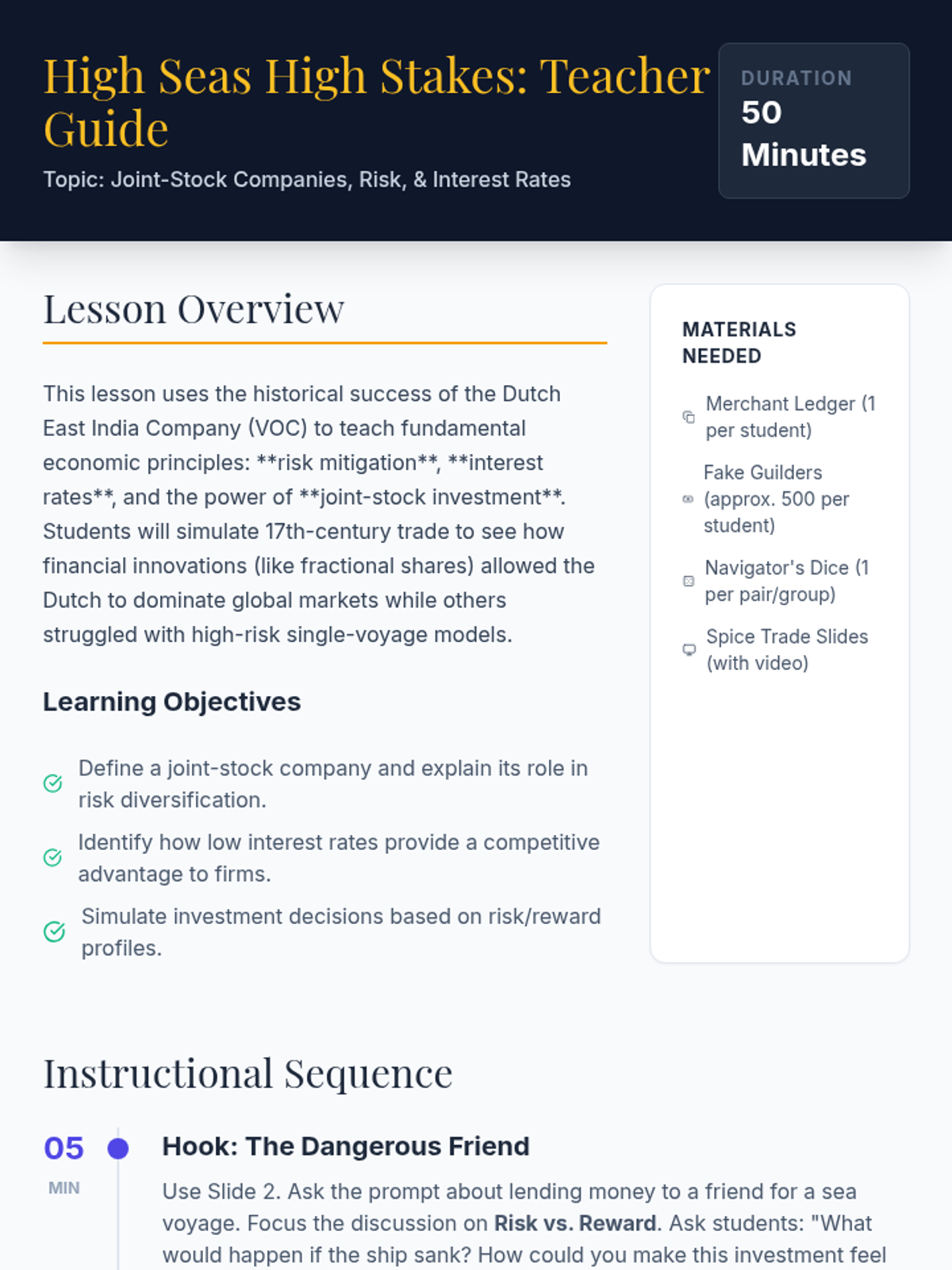This lesson explores the origins of modern capitalism through the lens of the Dutch East India Company (VOC). Students analyze financial innovations like fractional shares, interest rates, and joint-stock companies to understand risk mitigation in high-stakes historical and modern contexts.