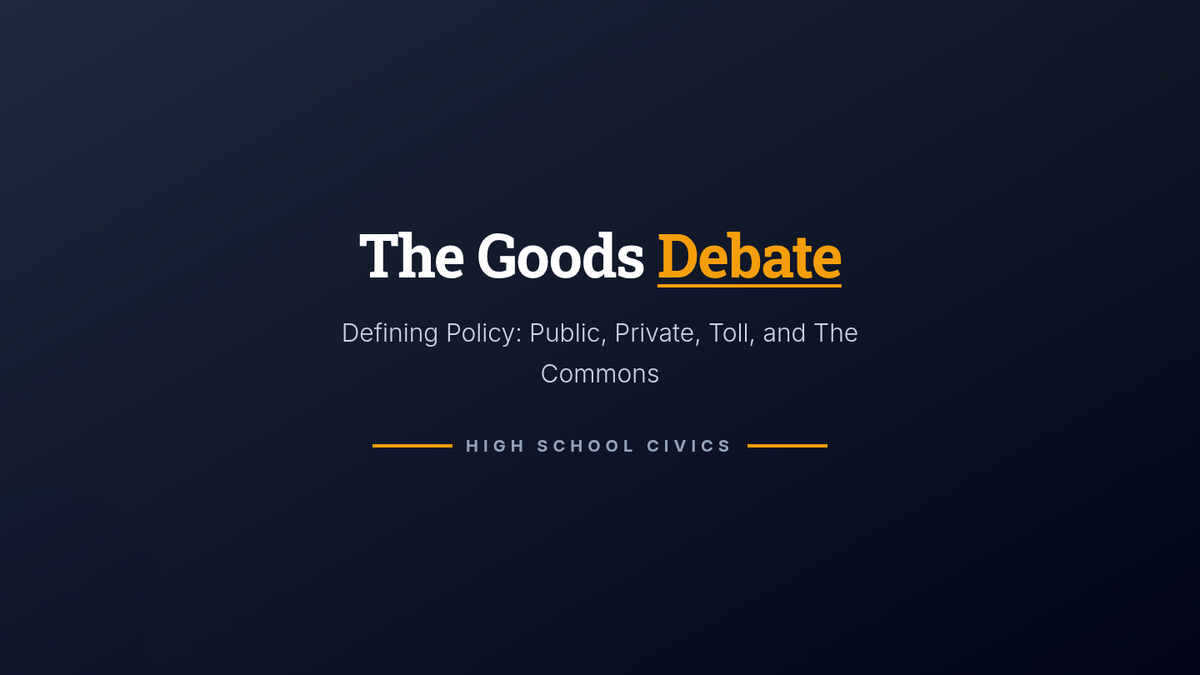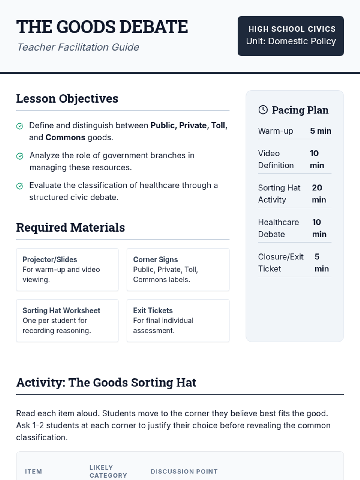 A high-school civics lesson focused on classifying goods into public, private, toll, and commons categories, featuring a structured debate on healthcare policy.