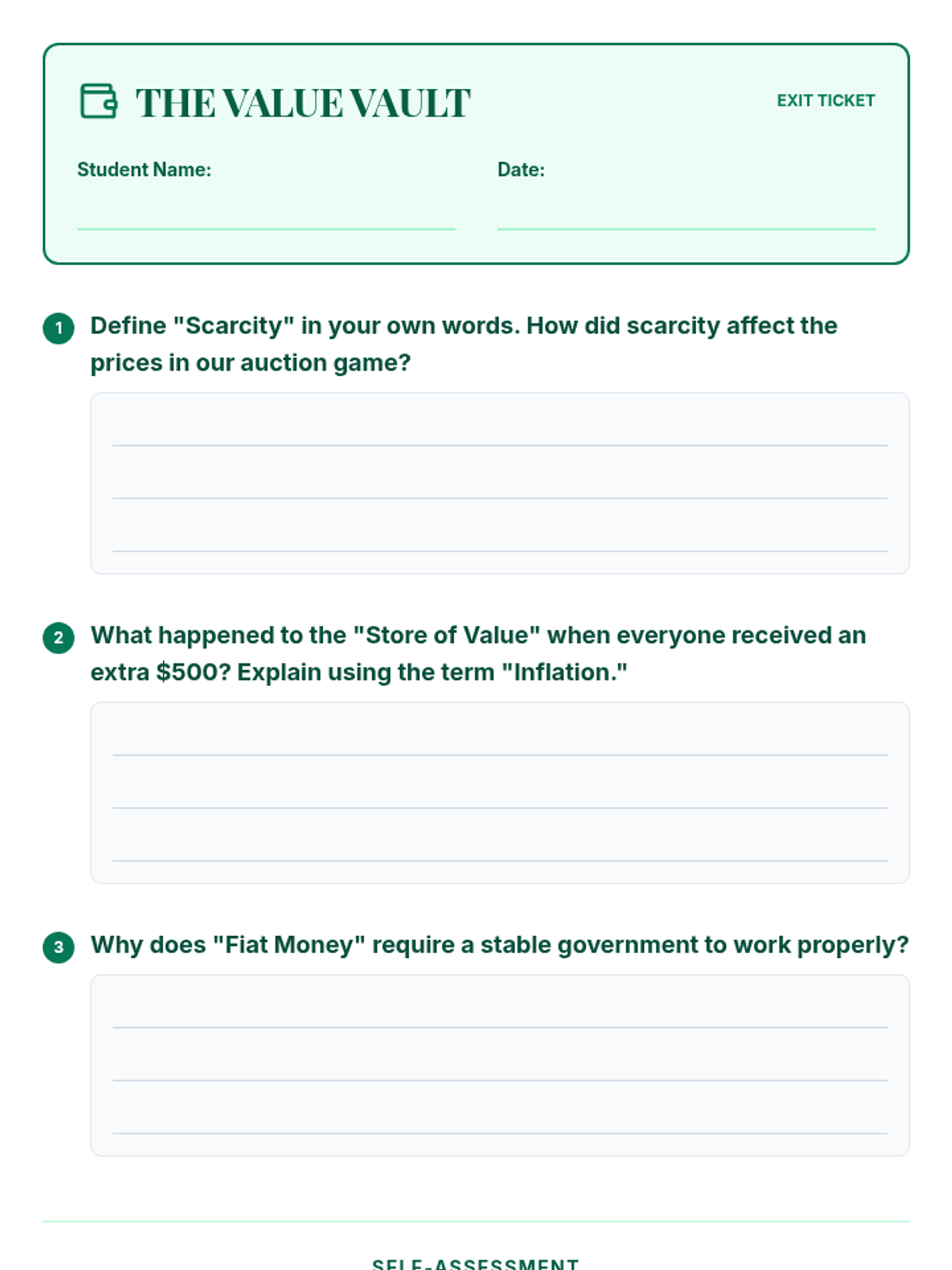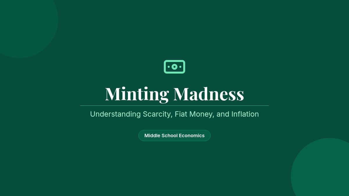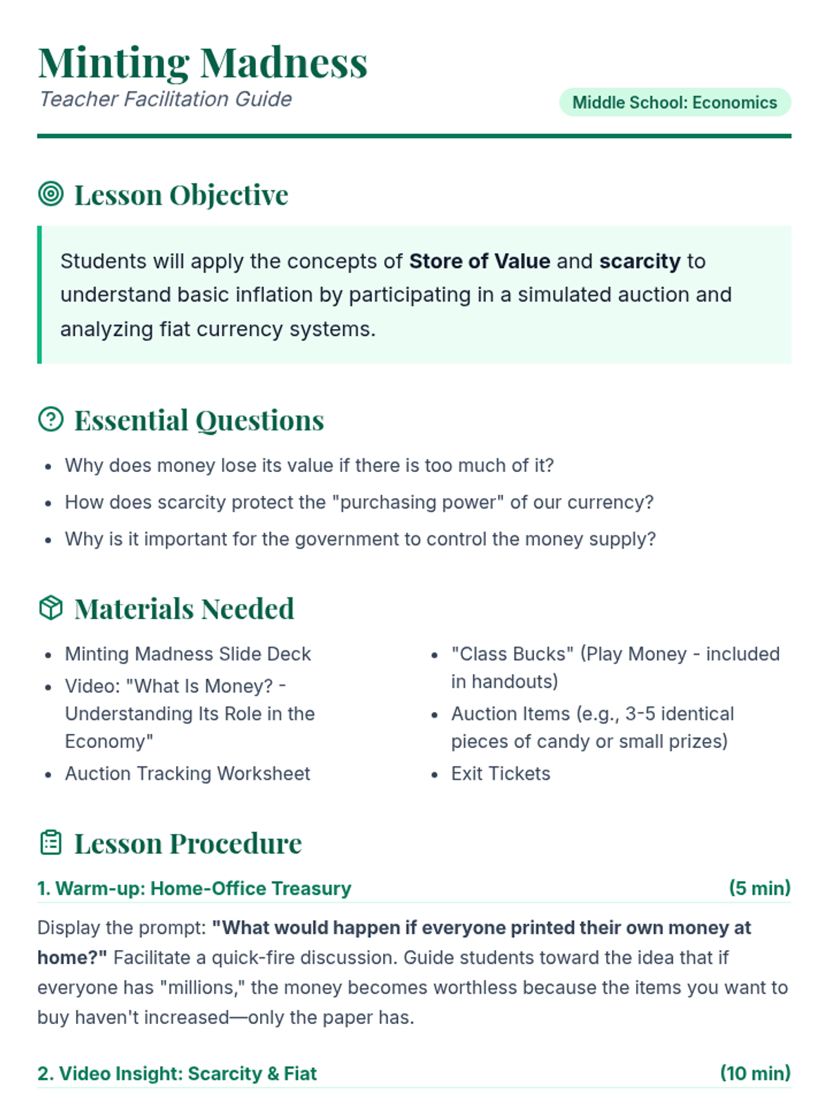A middle school economics lesson exploring the concepts of scarcity, fiat money, and the mechanics of inflation through an interactive auction simulation and video analysis.