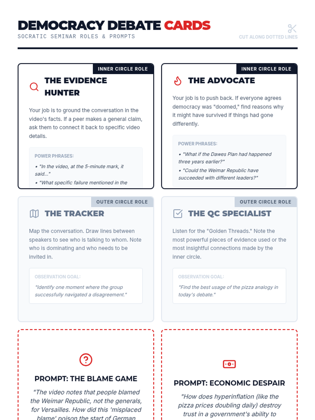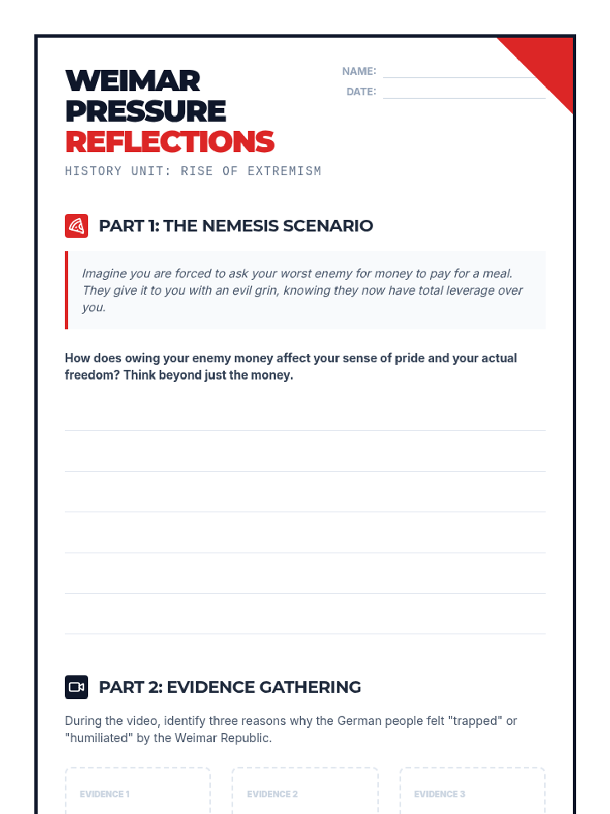 This lesson explores the psychological and economic instability of the Weimar Republic following the Treaty of Versailles, connecting national humiliation to the rise of political extremism. Students engage in a re-enactment, video analysis, and a Socratic Seminar to evaluate if German democracy was doomed from its inception.