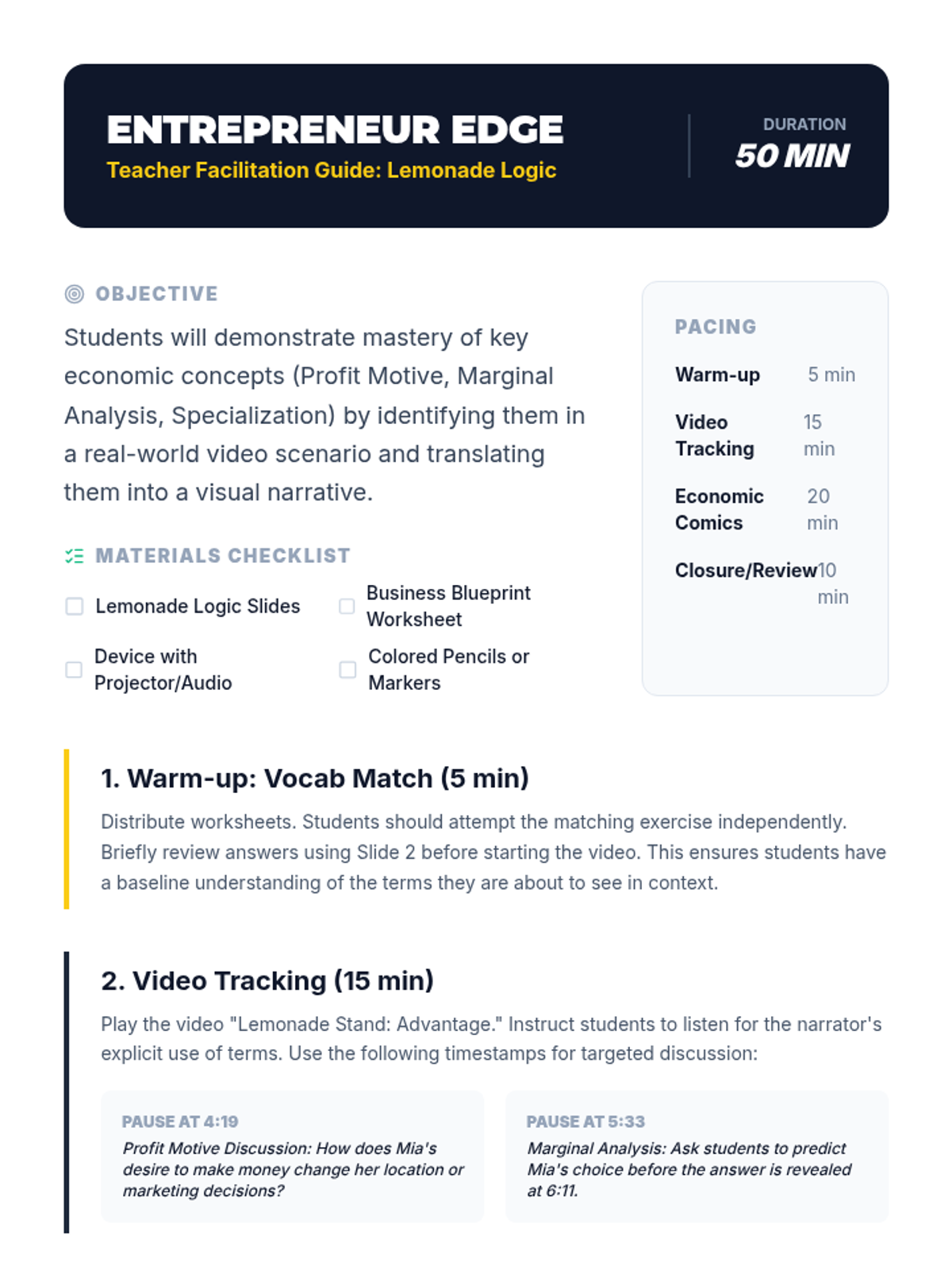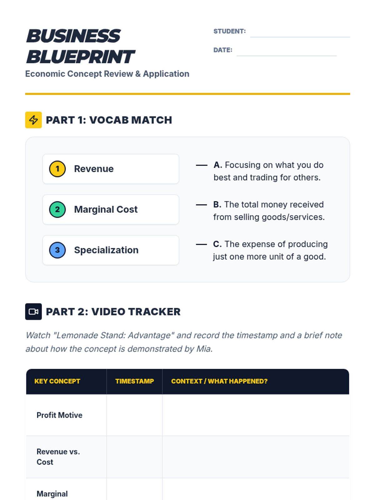 Students will master economic vocabulary including profit motive, marginal analysis, and specialization through a video case study of Mia the robot's lemonade stand and the creation of an 'Economic Comic' to illustrate complex concepts.