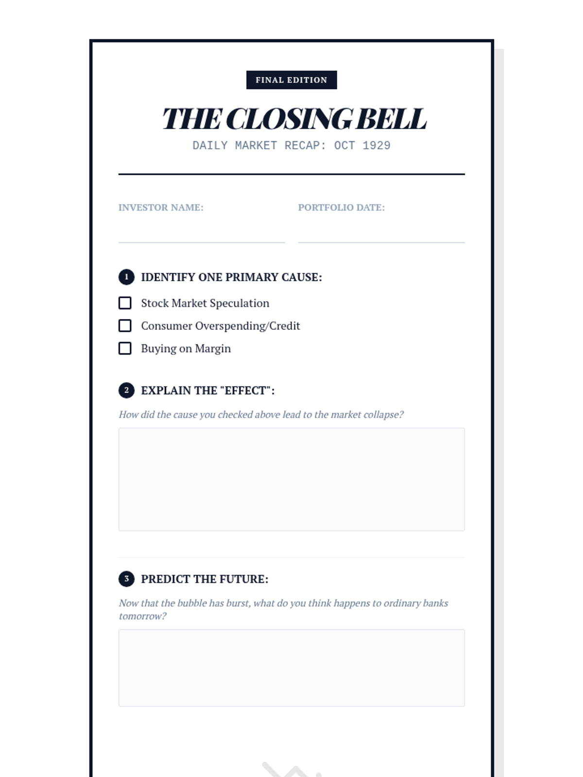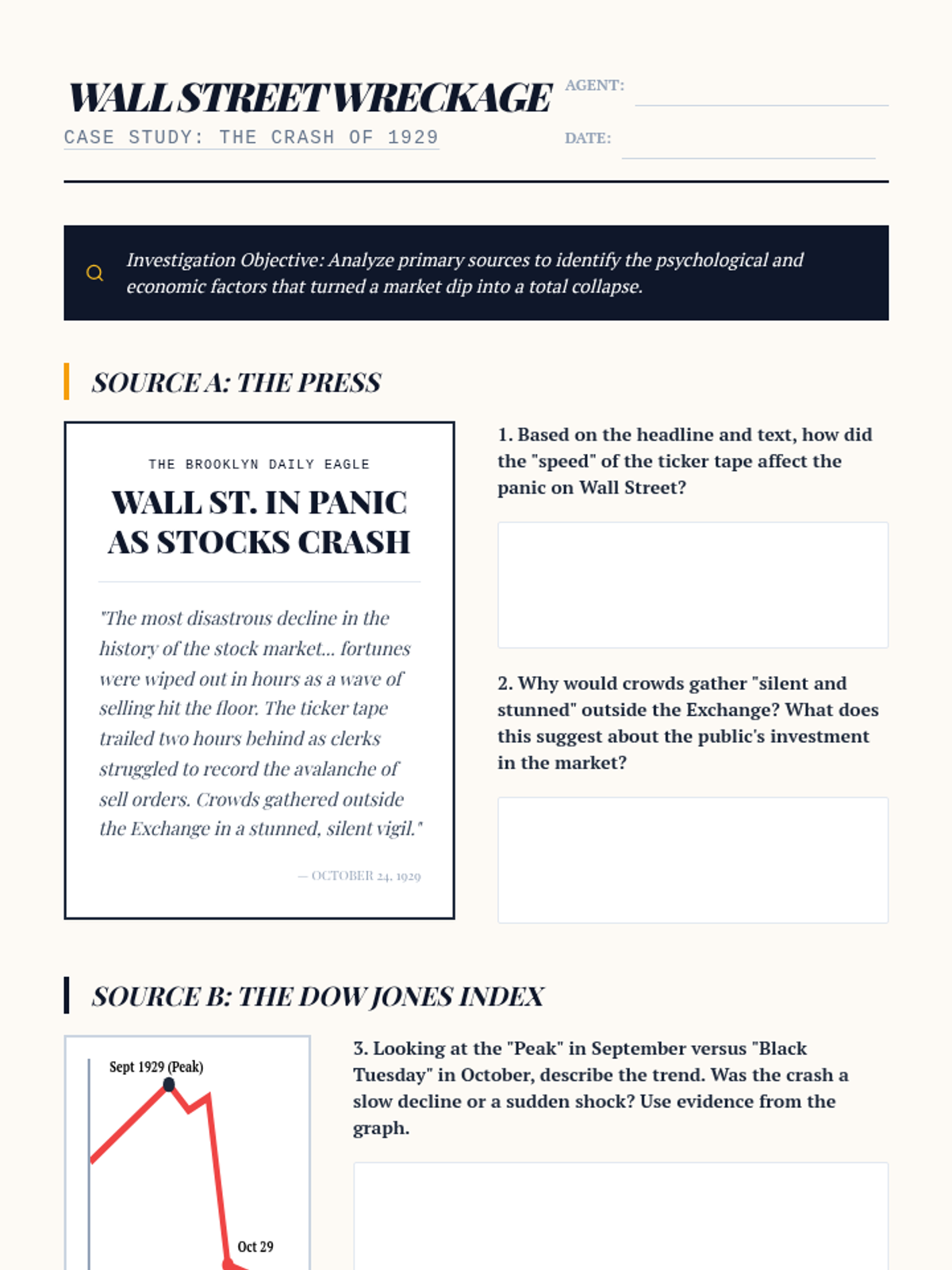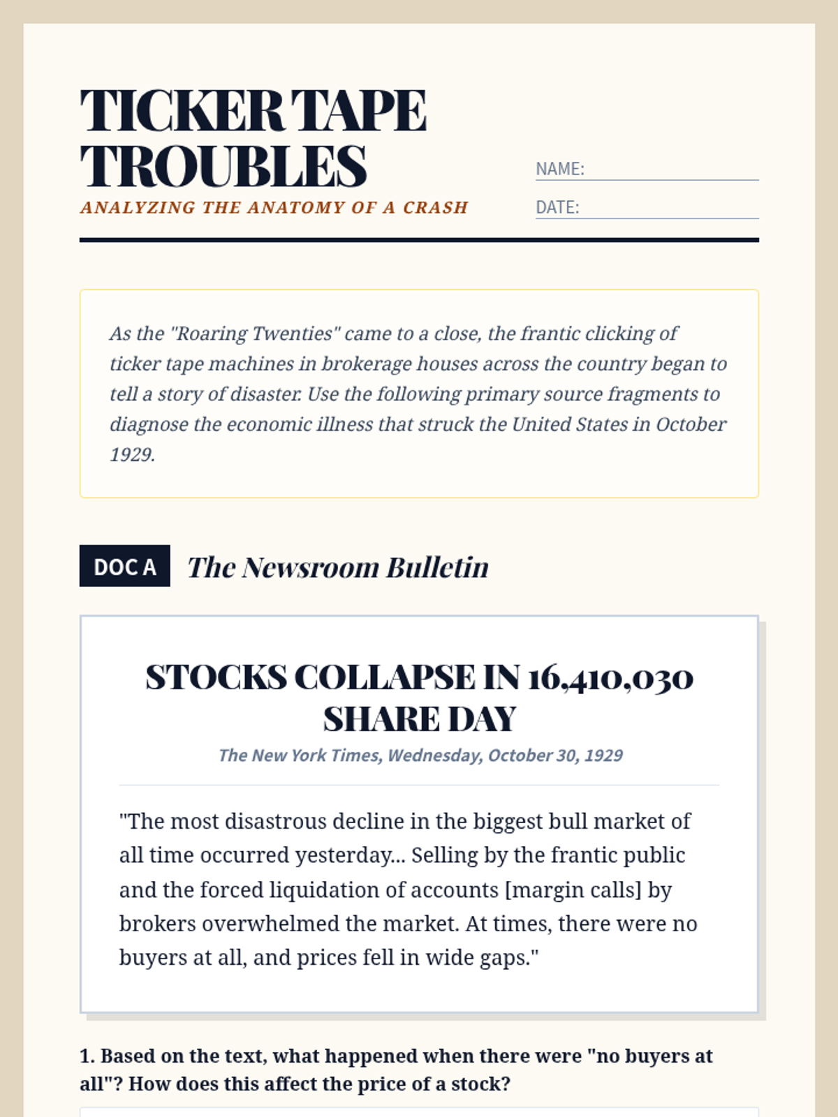 A comprehensive 45-minute lesson exploring the economic bubble of the 1920s and the specific triggers of the 1929 Stock Market Crash. Students will analyze primary sources to understand speculation and consumer behavior.