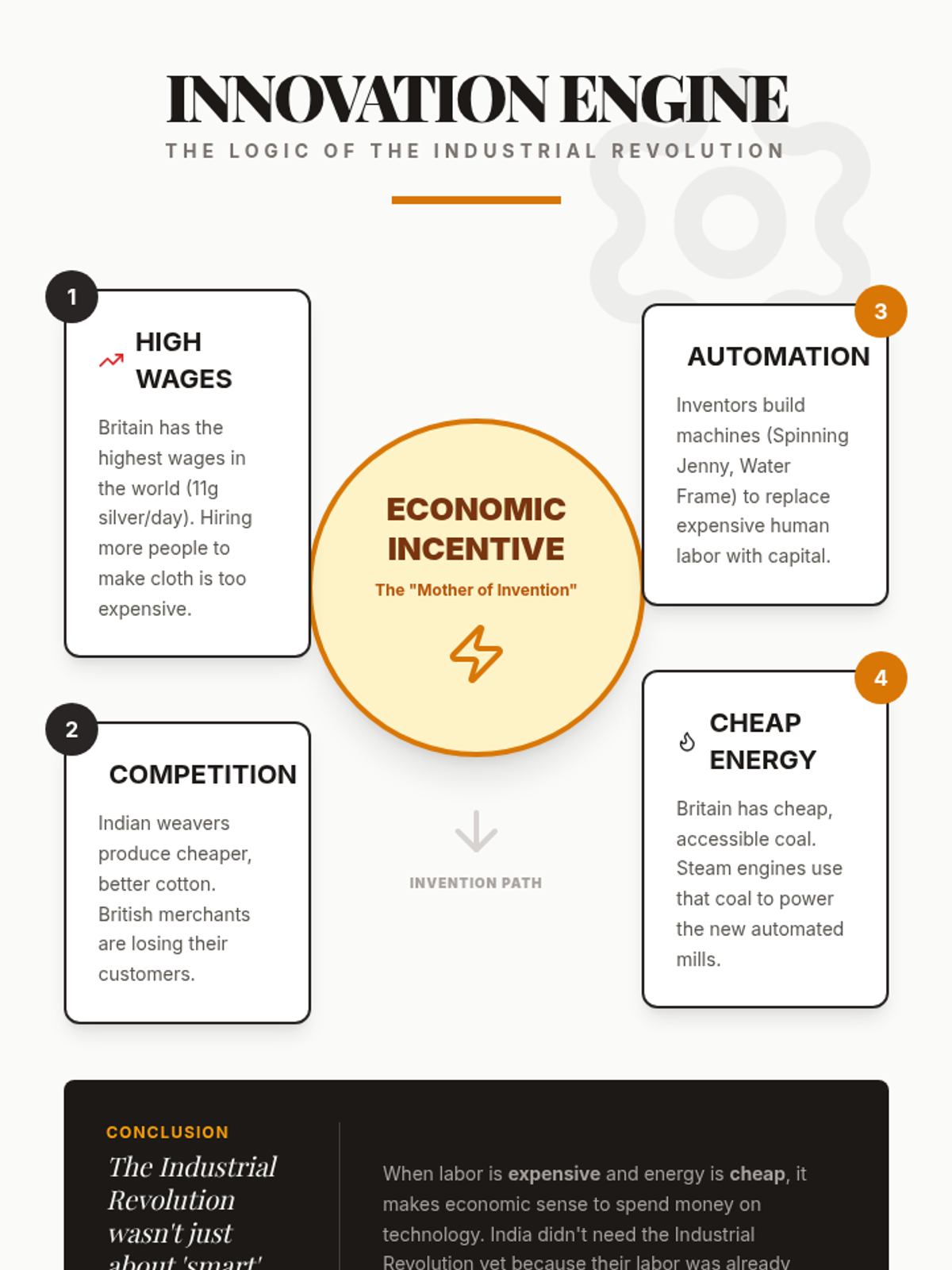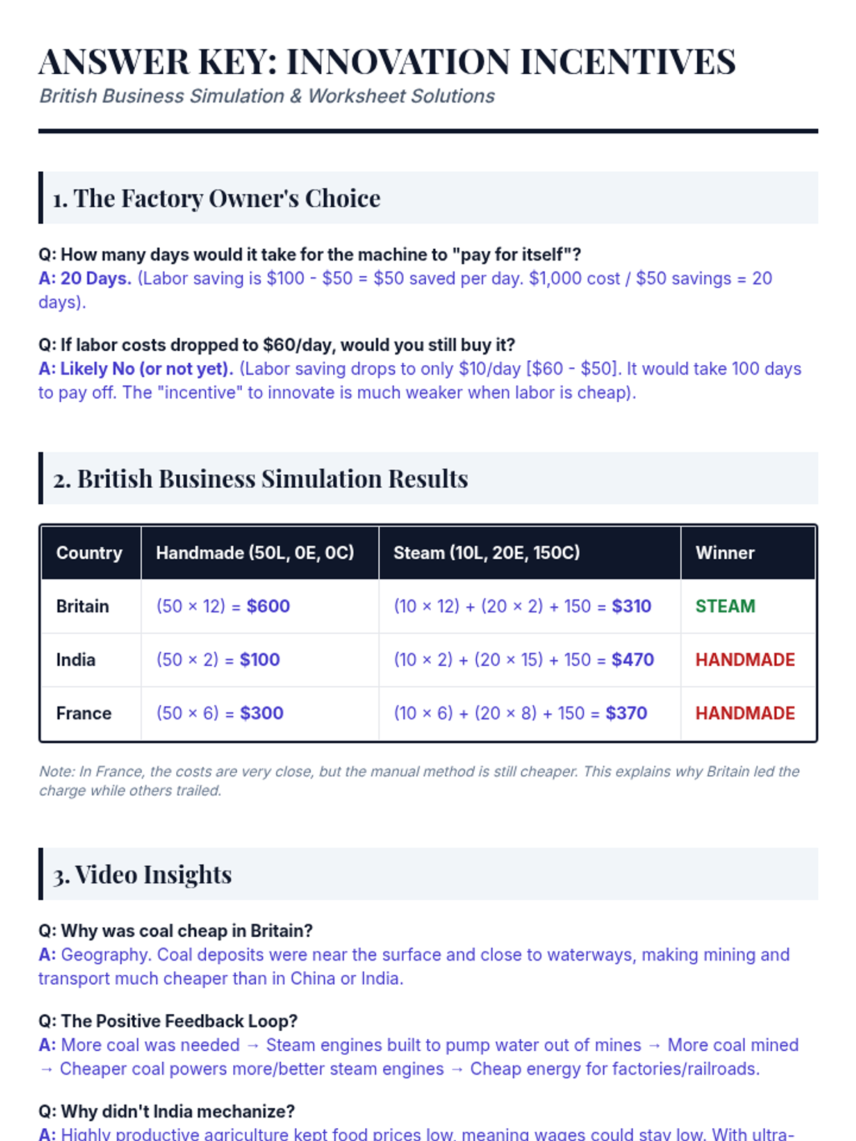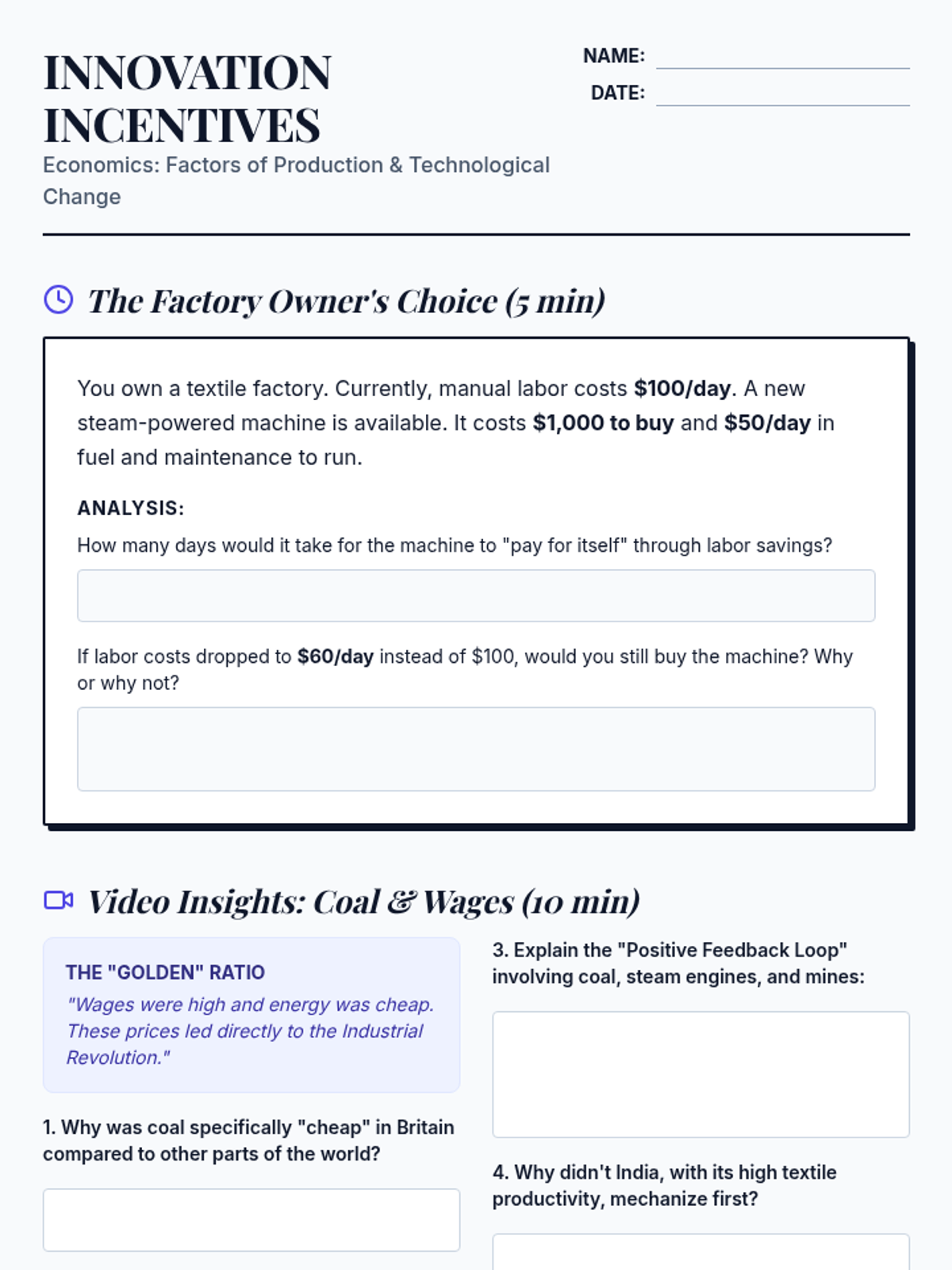 This lesson explores how relative factor prices (specifically high wages and cheap energy) acted as the primary driver for technological innovation during the Industrial Revolution, with modern parallels in automation.