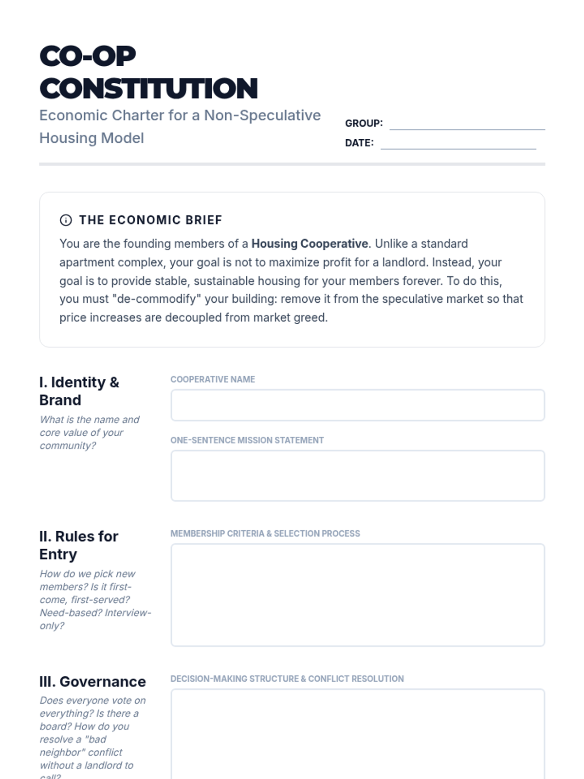A 12th Grade/Undergraduate Economics lesson exploring cooperatives as a non-speculative alternative to traditional housing markets, featuring a case study of the La Borda co-op in Barcelona.