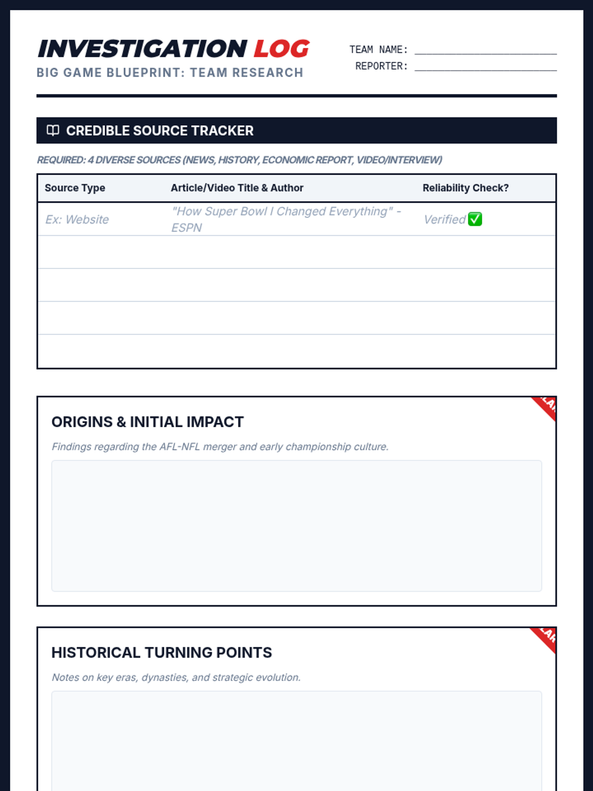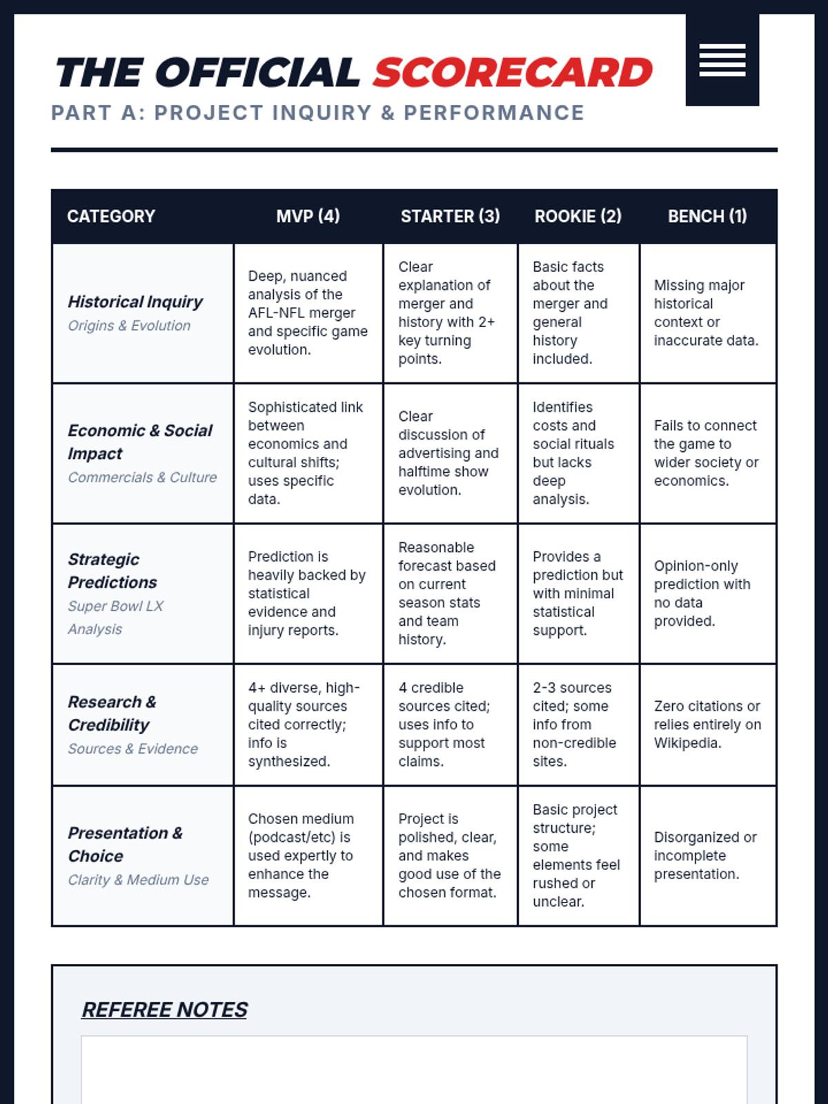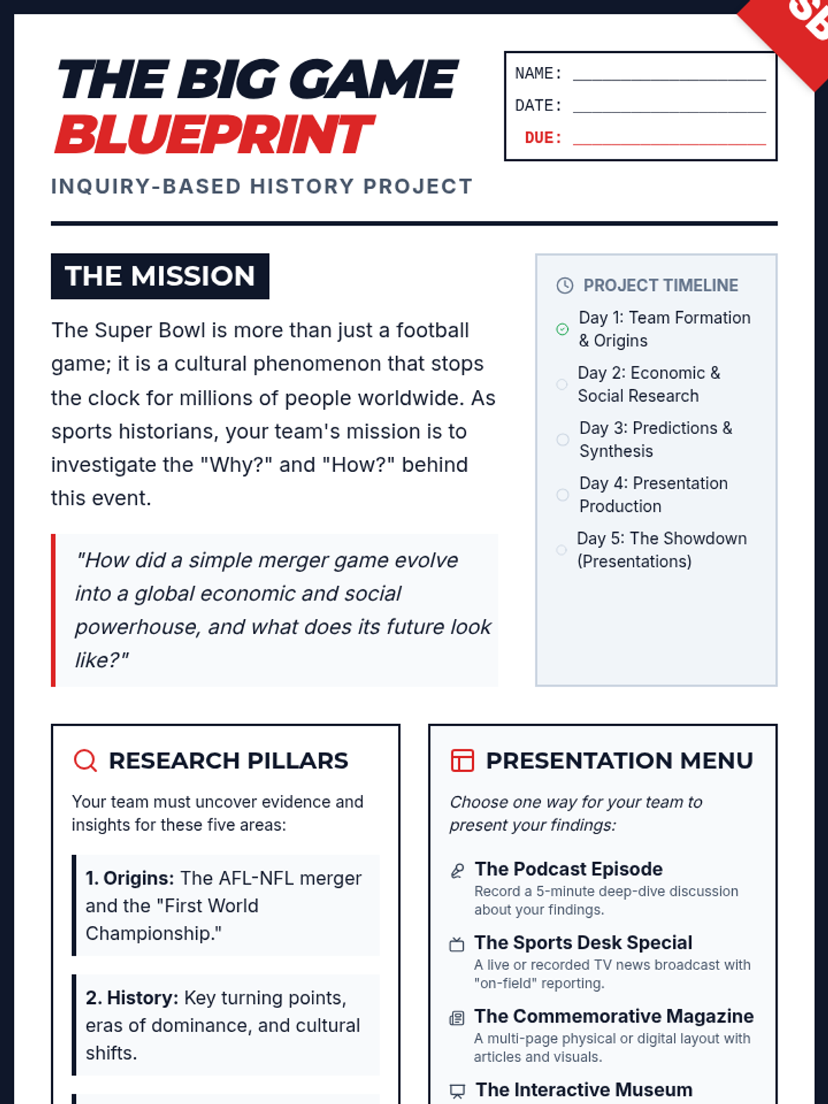A multi-day, inquiry-based group project where students explore the Super Bowl's evolution from a simple championship game into a global cultural and economic powerhouse. Students conduct research on historical, social, and economic factors before presenting their findings through a medium of their choice.