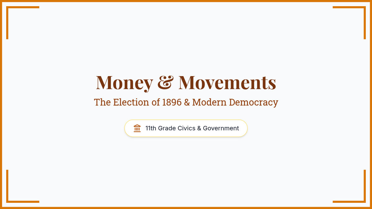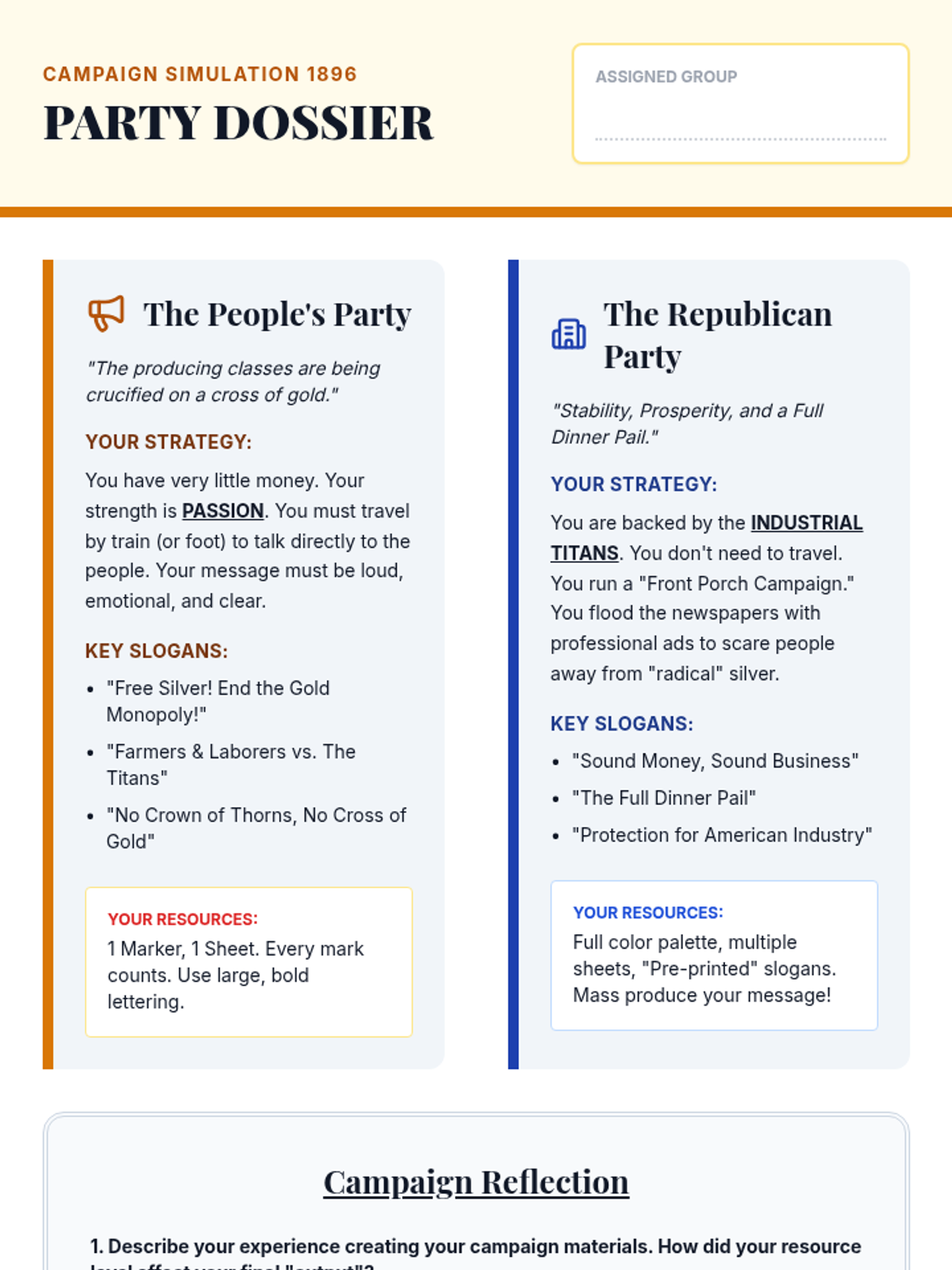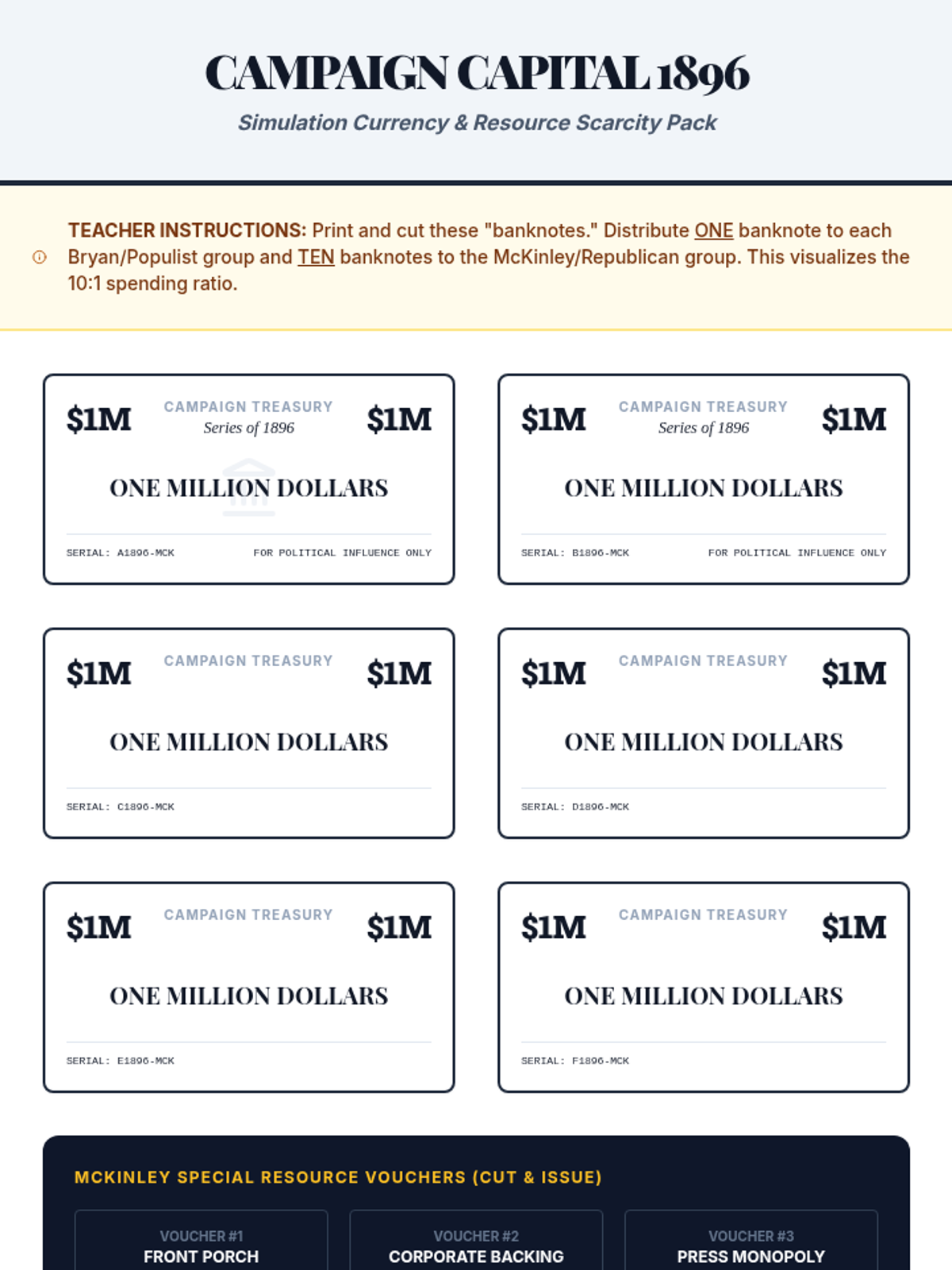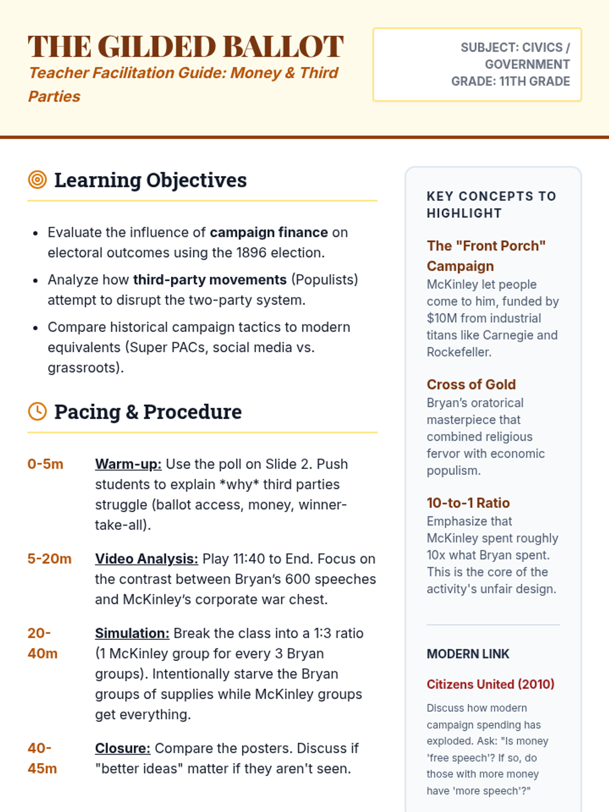 This lesson explores the influence of third-party movements and campaign finance through the lens of the 1896 US Presidential Election. Students simulate the resource disparity between the Populist-backed William Jennings Bryan and the corporate-funded William McKinley to understand how money shapes political messaging.