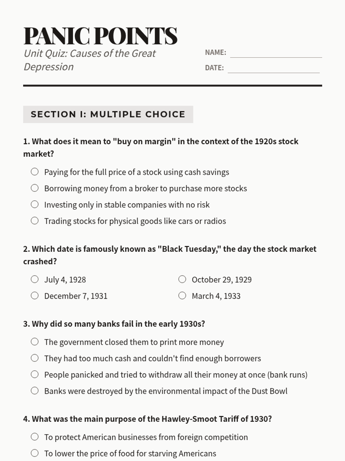 An in-depth look at the multi-faceted causes of the Great Depression, including the Stock Market Crash of 1929, bank failures, and agricultural overproduction. Students will analyze primary sources to understand the human impact of these economic shifts.