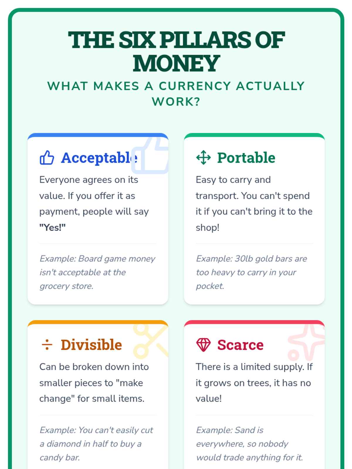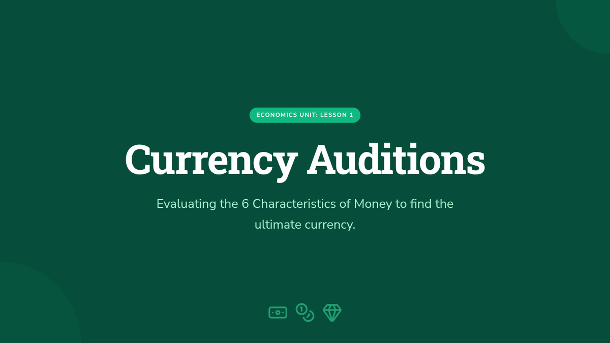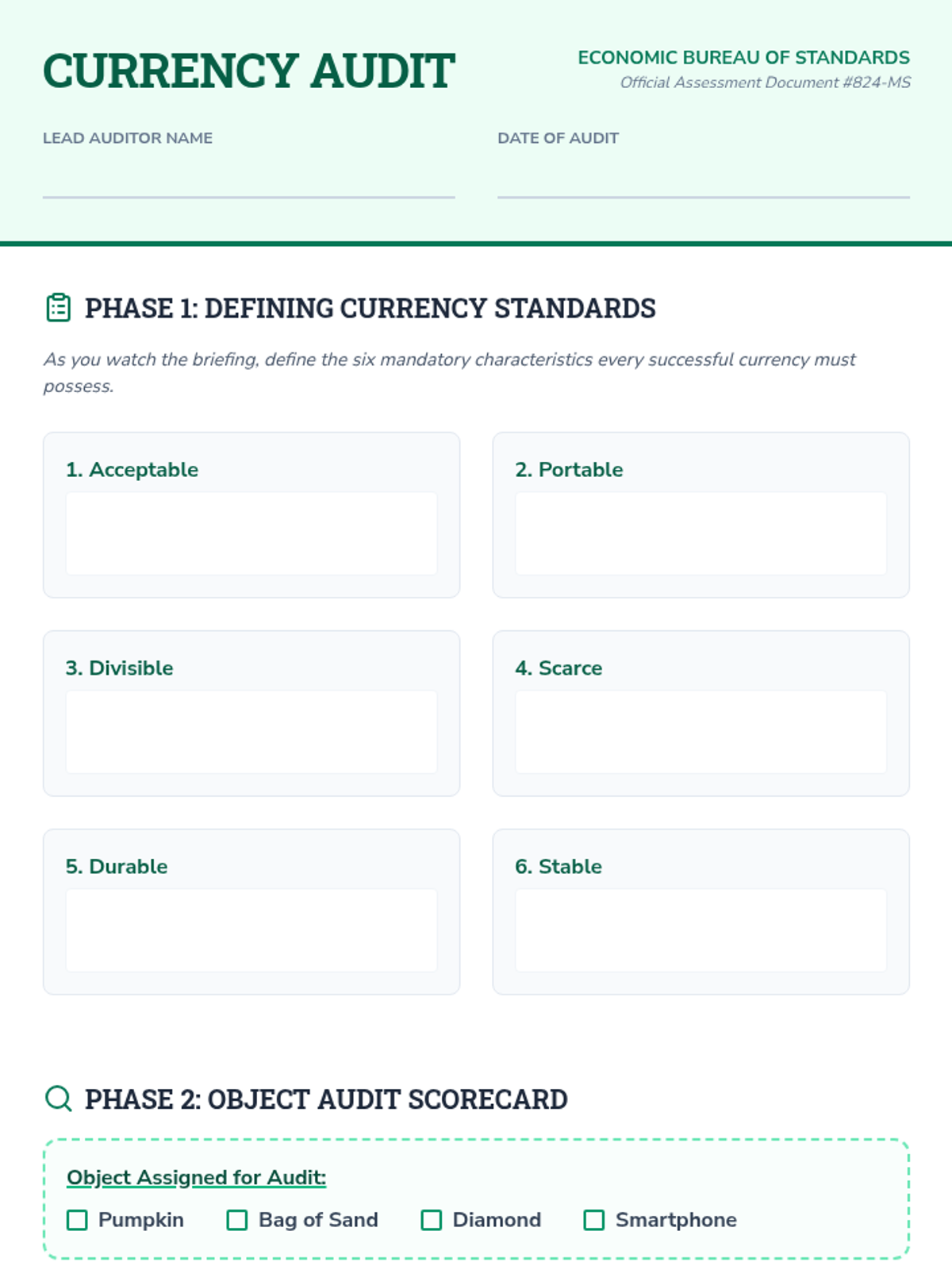 Students will evaluate various objects against the six fundamental characteristics of money (Acceptability, Portability, Divisibility, Scarcity, Durability, and Stability) to determine what makes an effective currency. This hands-on lesson uses historical examples and a 'Currency Auditions' activity to bridge the gap between barter and modern finance.