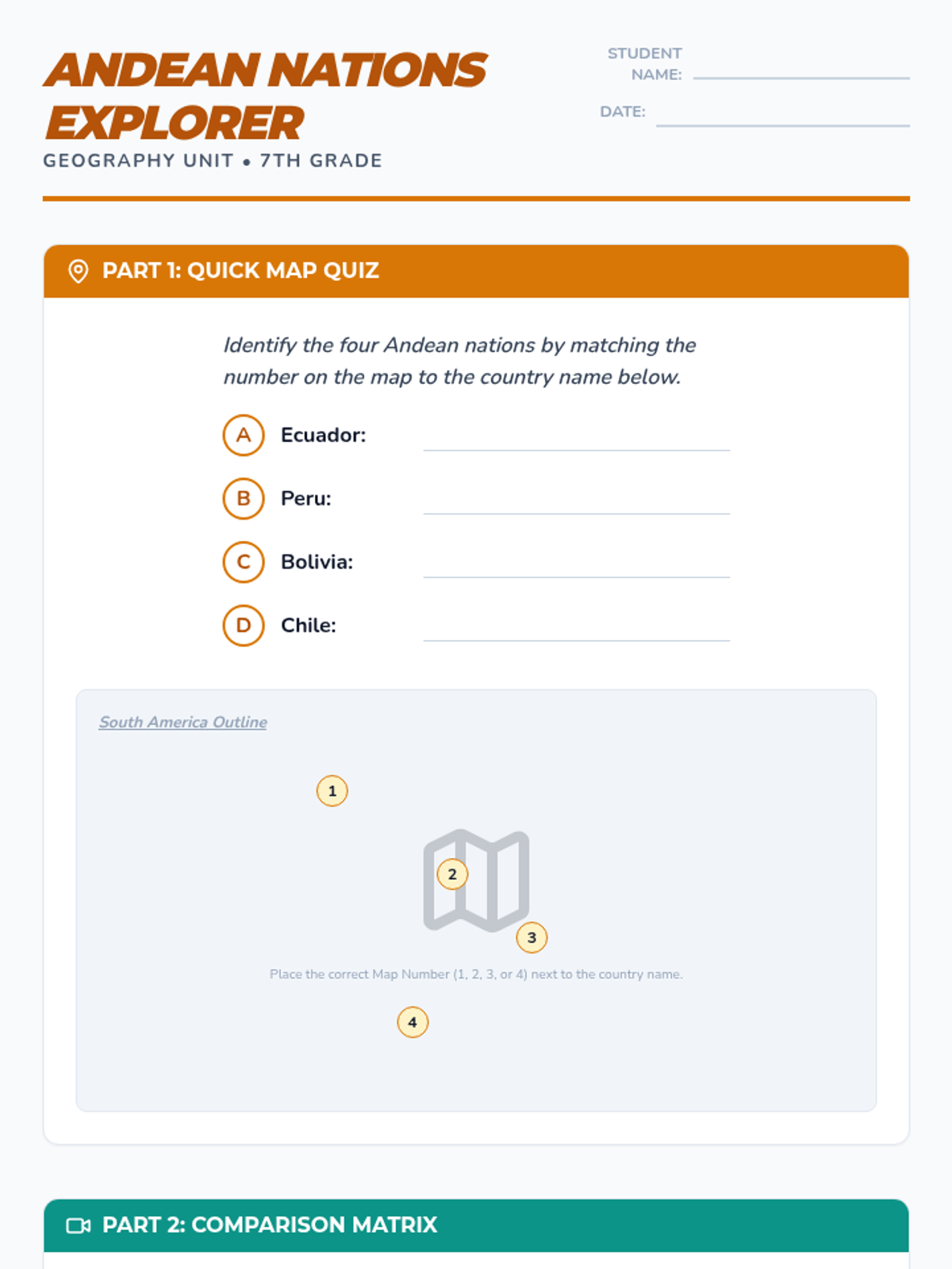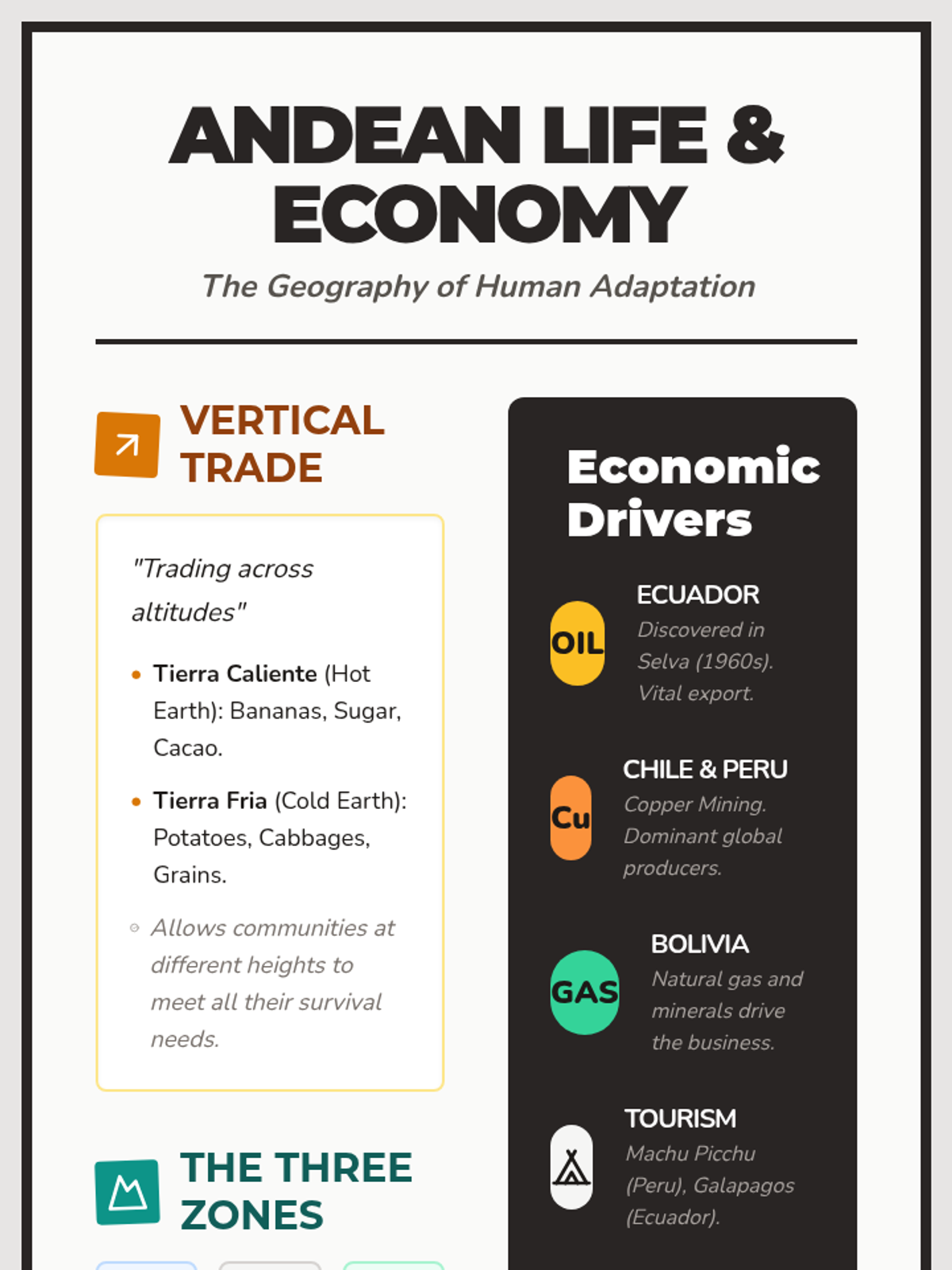Students explore the demographics and economies of Ecuador, Peru, Bolivia, and Chile, focusing on geographic adaptations like vertical trade and economic drivers like copper and oil.