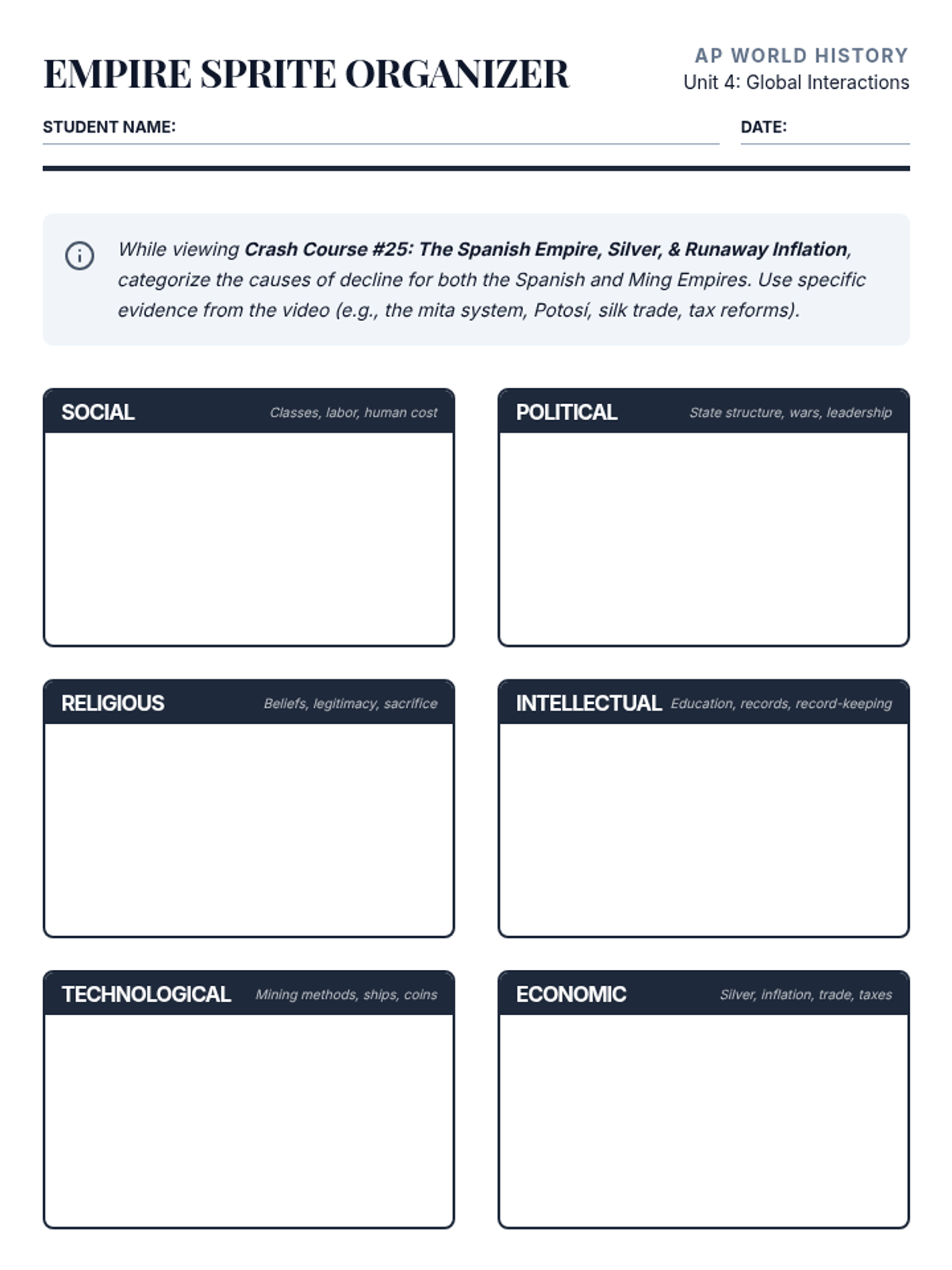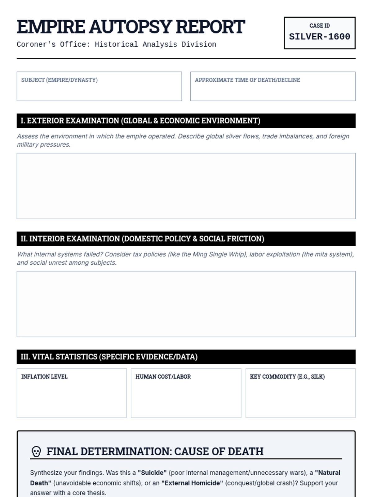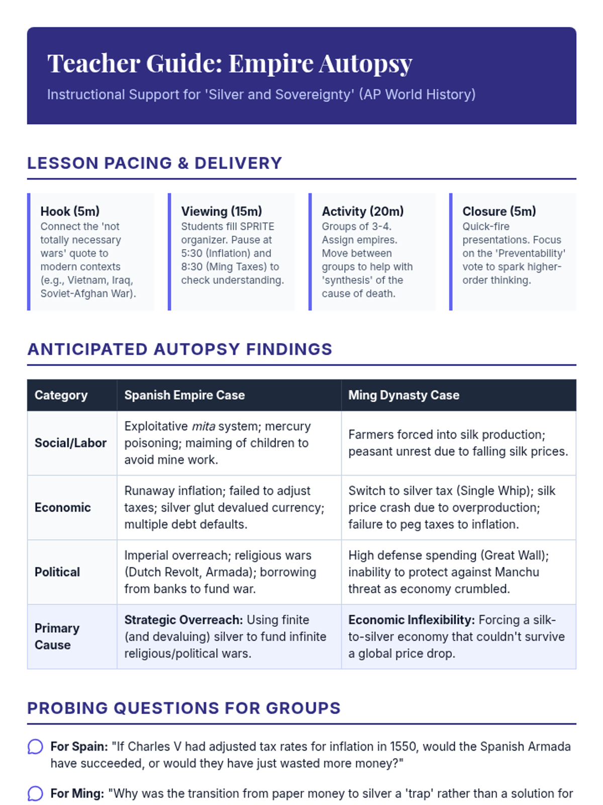 An AP-level analysis of the decline of the Spanish and Ming Empires, focusing on the global silver trade and the economic, political, and social consequences of rapid inflation. Students use a 'SPRITE' framework and a creative 'Empire Autopsy' activity to synthesize historical evidence.