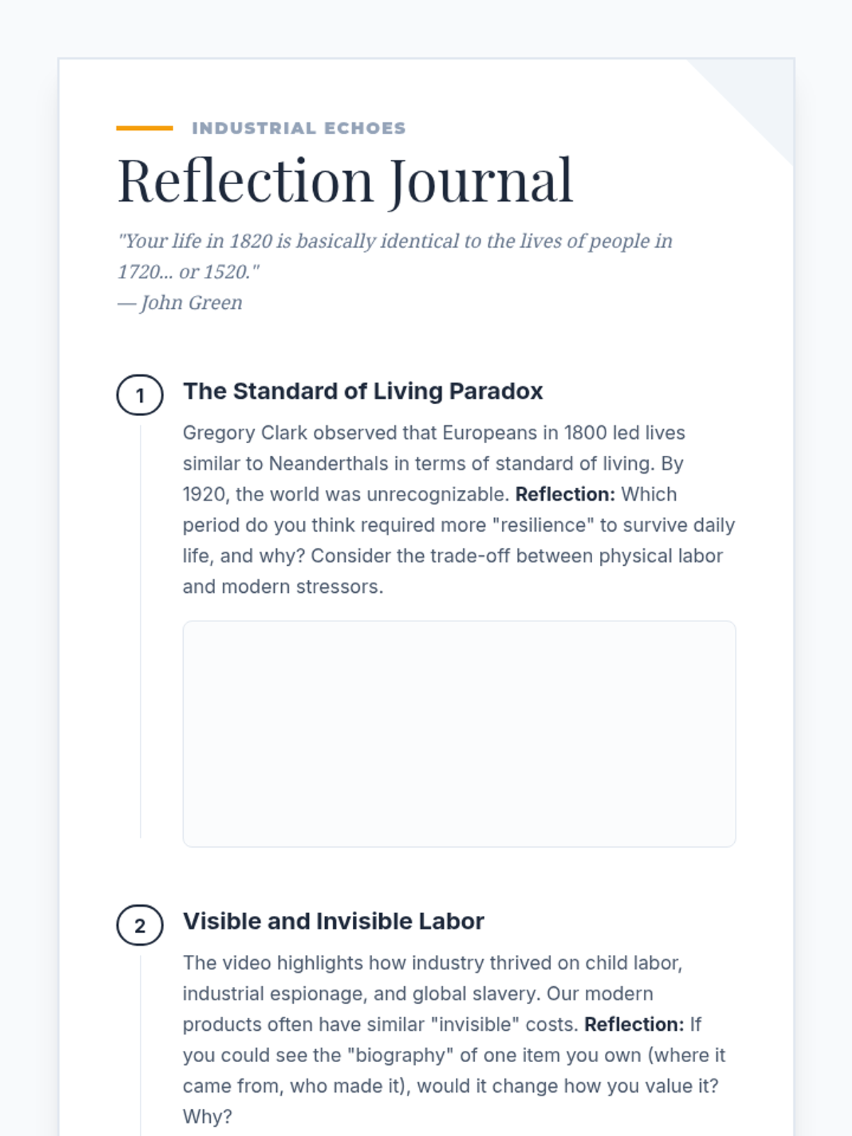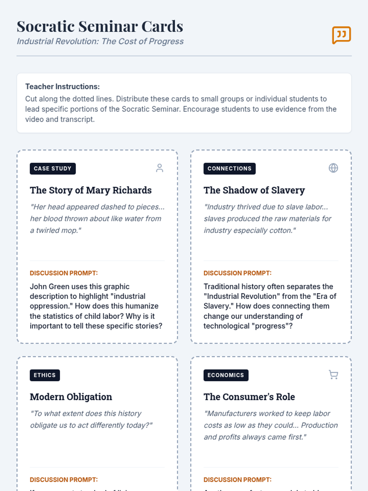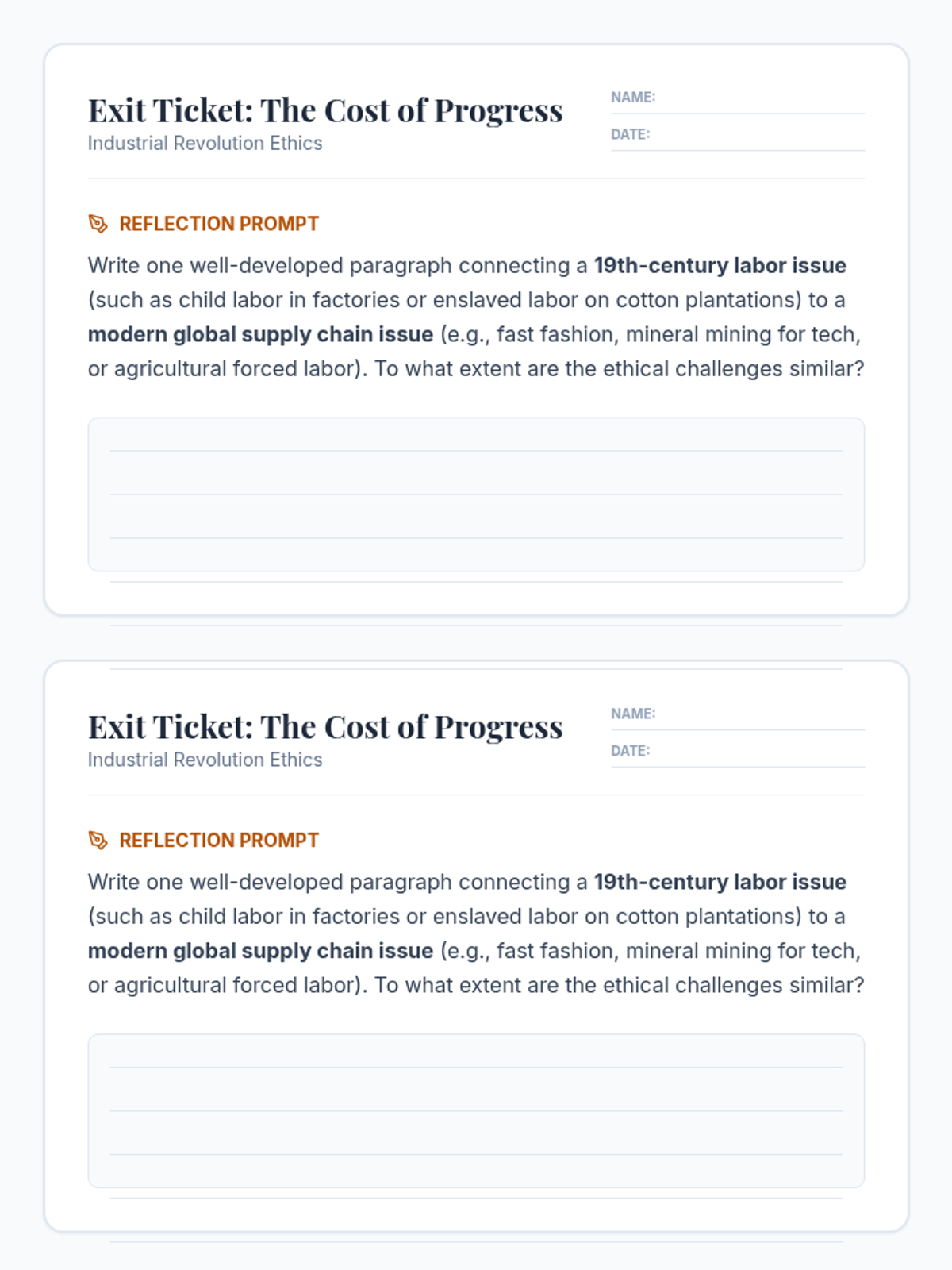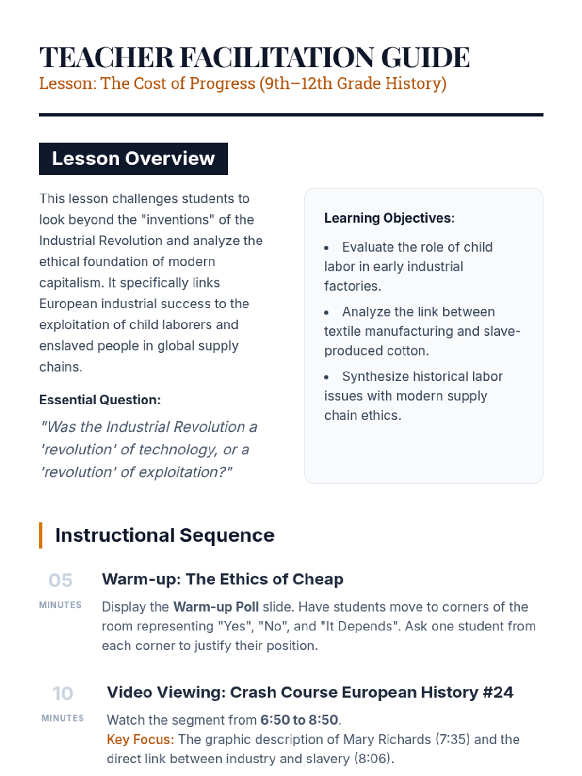 A high school history lesson exploring the ethical implications of the Industrial Revolution, focusing on the human cost of child labor and slavery, and connecting these historical issues to modern global supply chains.