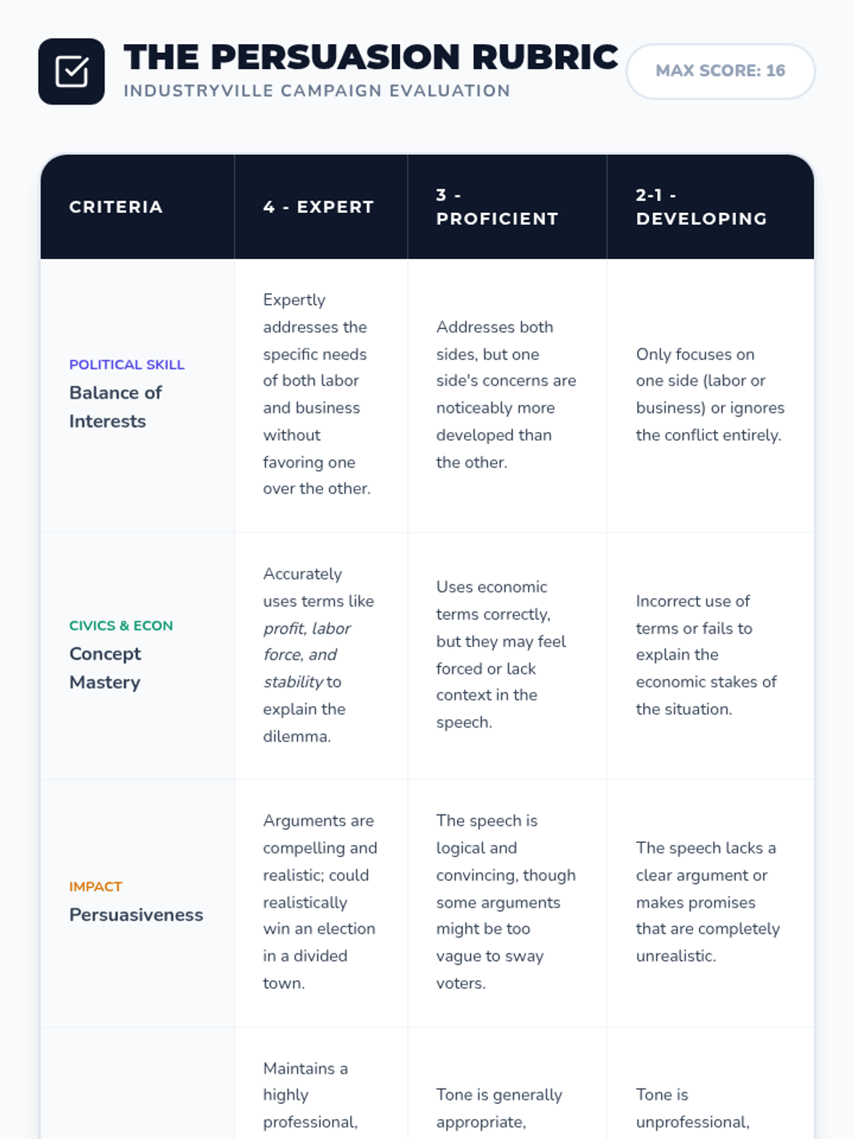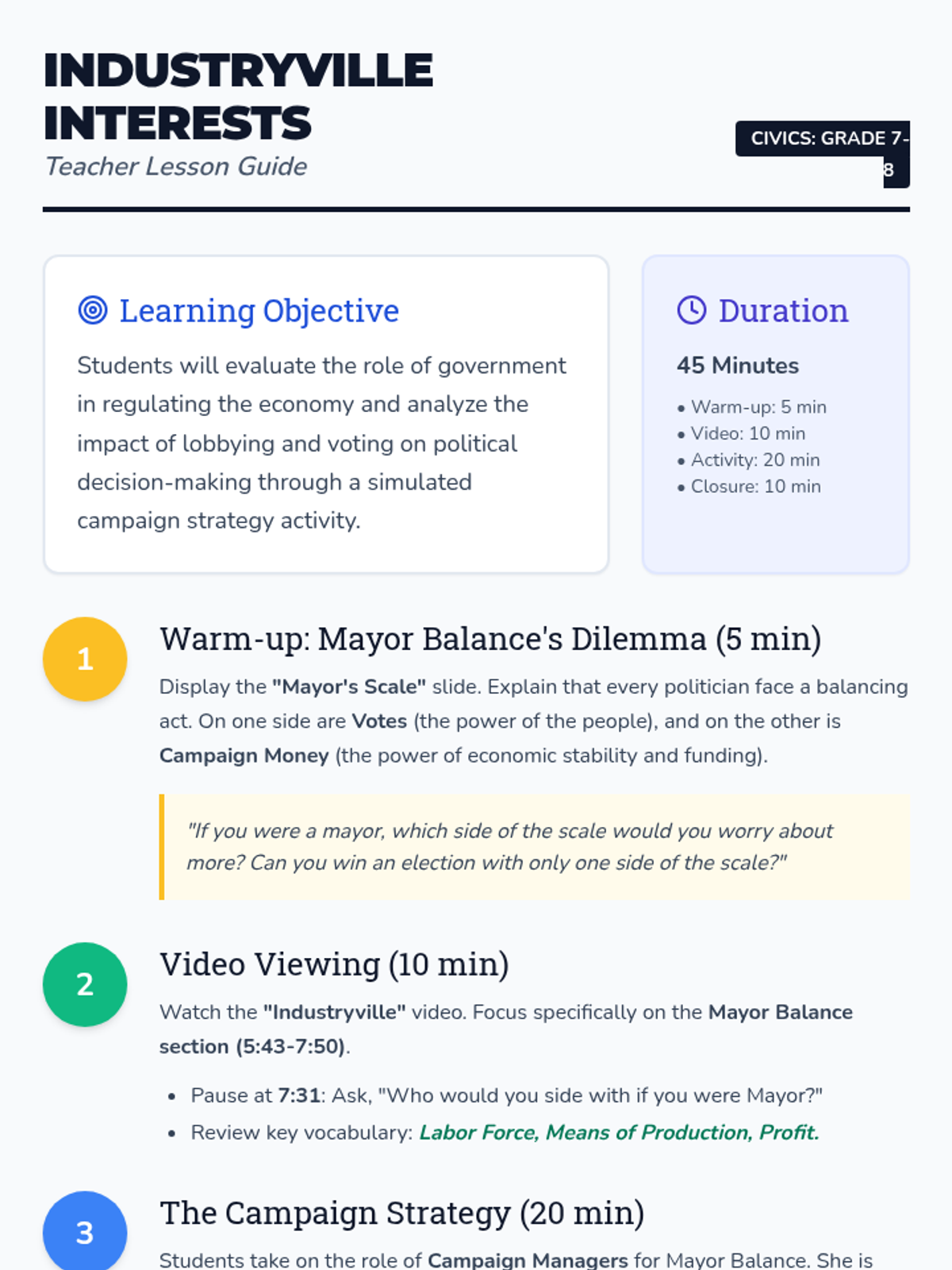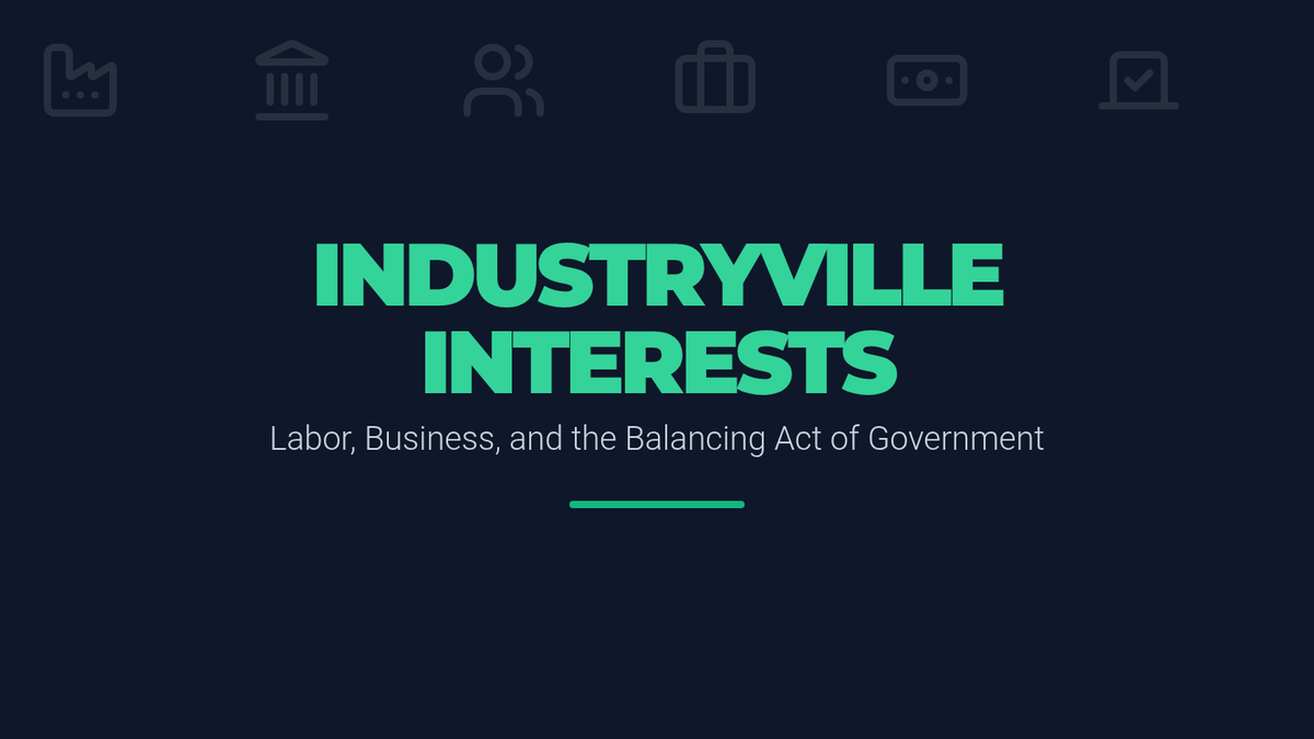 A civics lesson exploring the triangular conflict between labor, business, and government through the fictional lens of Industryville. Students analyze Mayor Balance's dilemma and practice political balancing by writing a campaign speech that addresses competing interests.