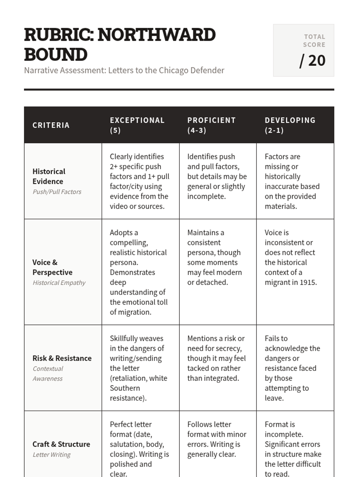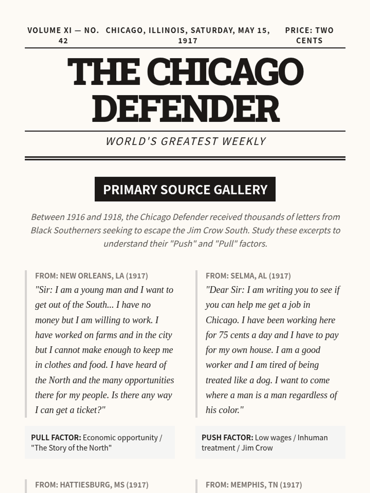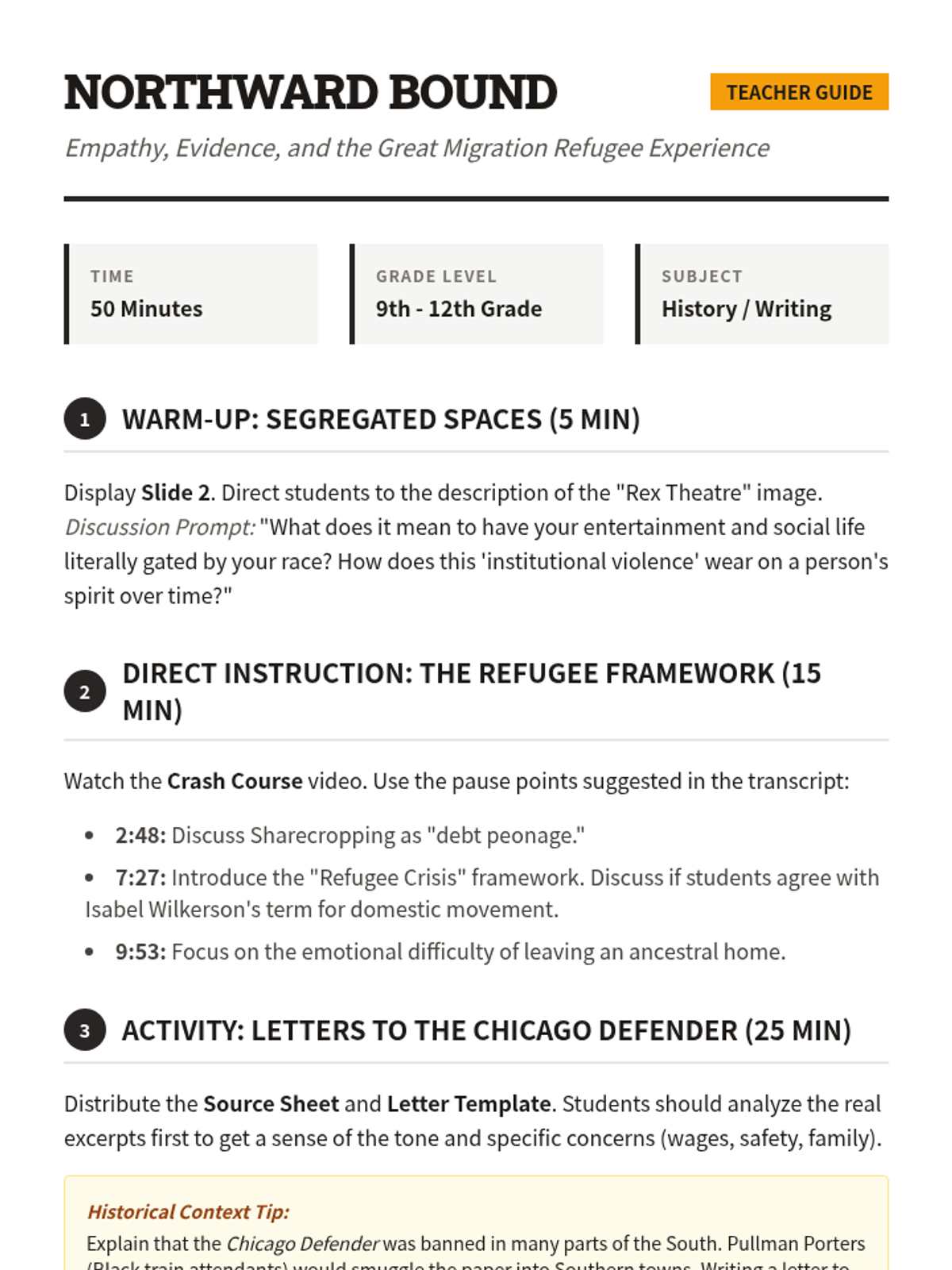 A lesson exploring the Great Migration through the lens of primary source letters, pushing students to empathize with the 'refugee' experience of Black Americans fleeing the Jim Crow South. Students analyze push and pull factors before drafting their own letter to the Chicago Defender.