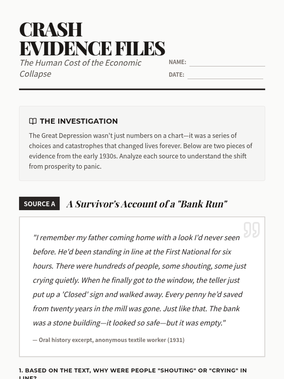 A 45-minute exploration of the social and environmental impacts of the Great Depression and the Dust Bowl on American families in the 1930s. Students analyze primary source photos and narratives to understand the human cost of economic and ecological collapse.