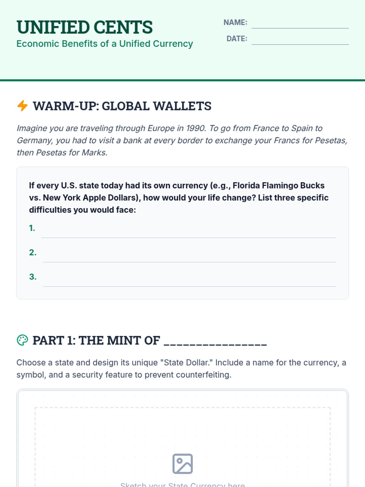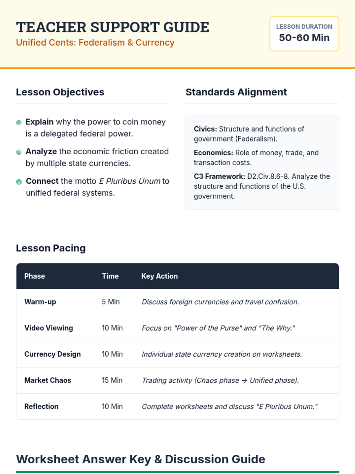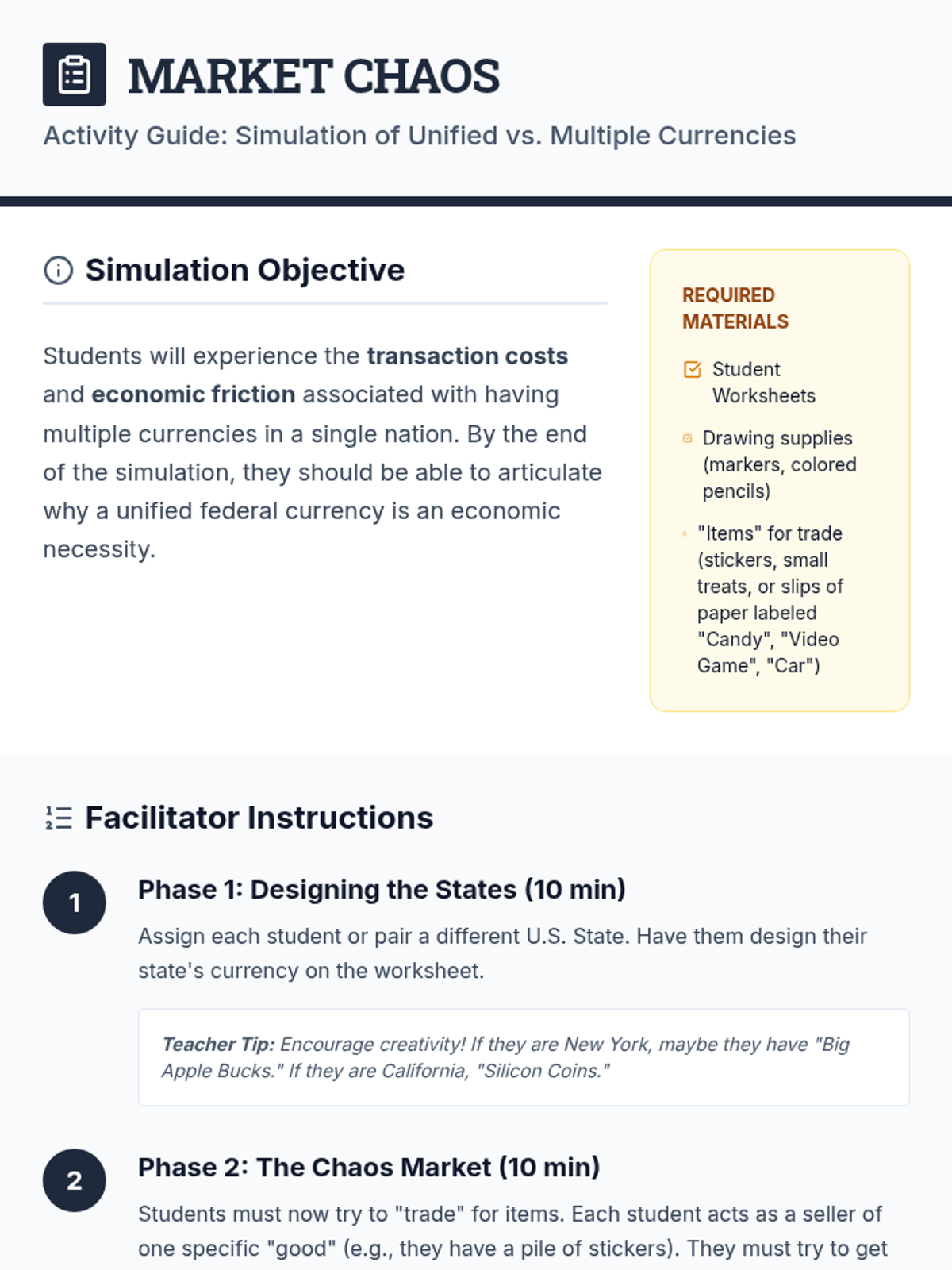 A civics and economics lesson exploring why the U.S. Constitution delegates the power to coin money to the federal government rather than the states. Students participate in a market simulation to experience the chaos of multiple currencies versus the efficiency of a unified system.