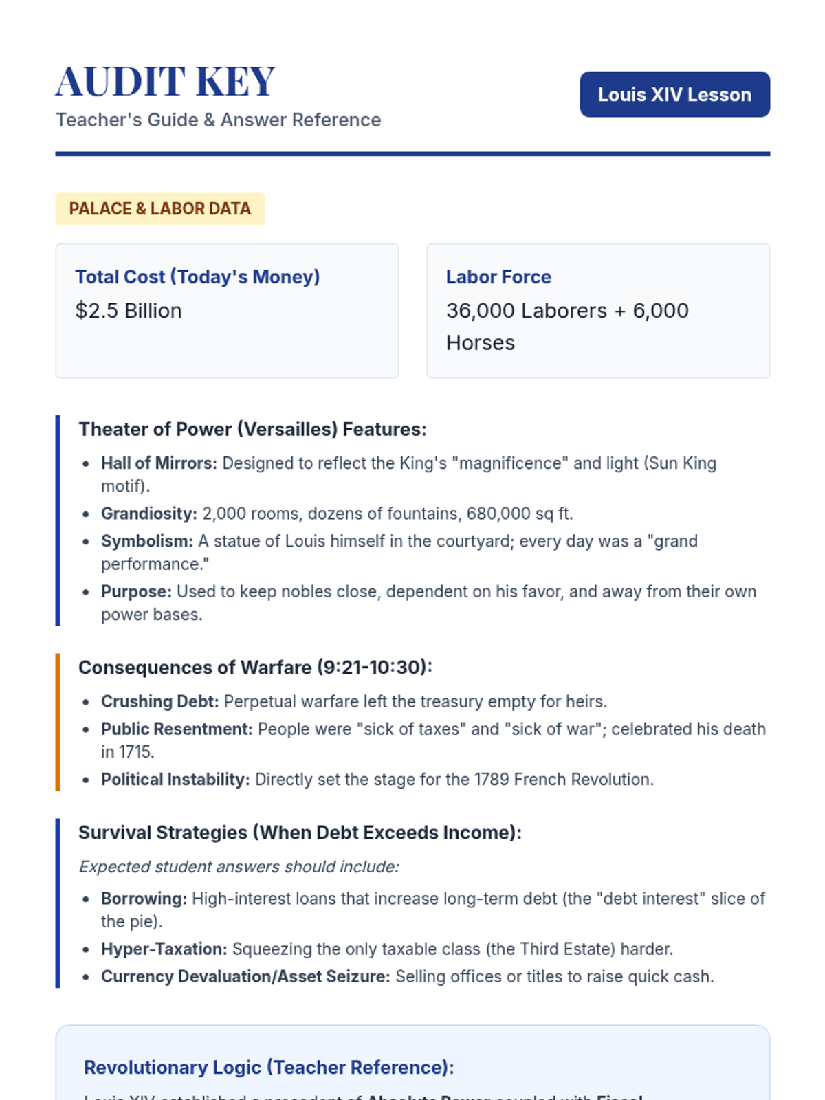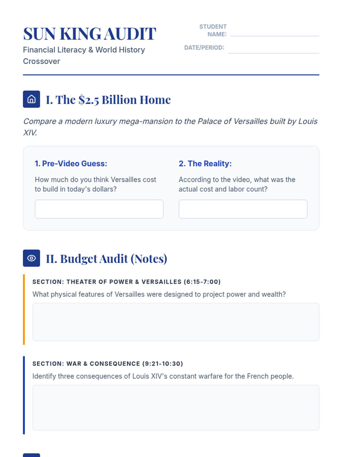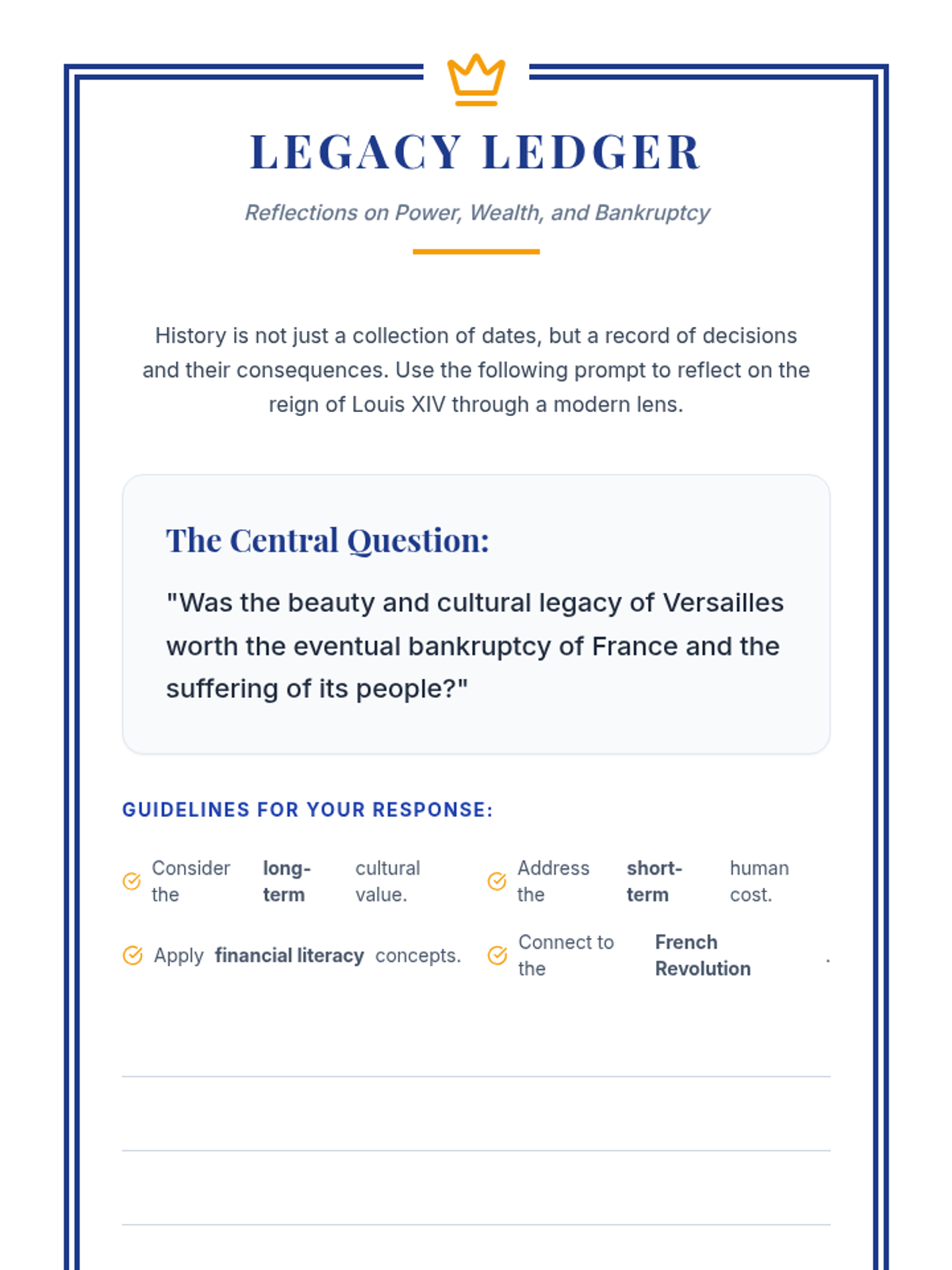 A financial literacy and history crossover lesson where students audit the reign of Louis XIV. They evaluate the staggering costs of Versailles and perpetual warfare against the tax burden placed on the third estate, connecting royal extravagance to the eventual French Revolution.