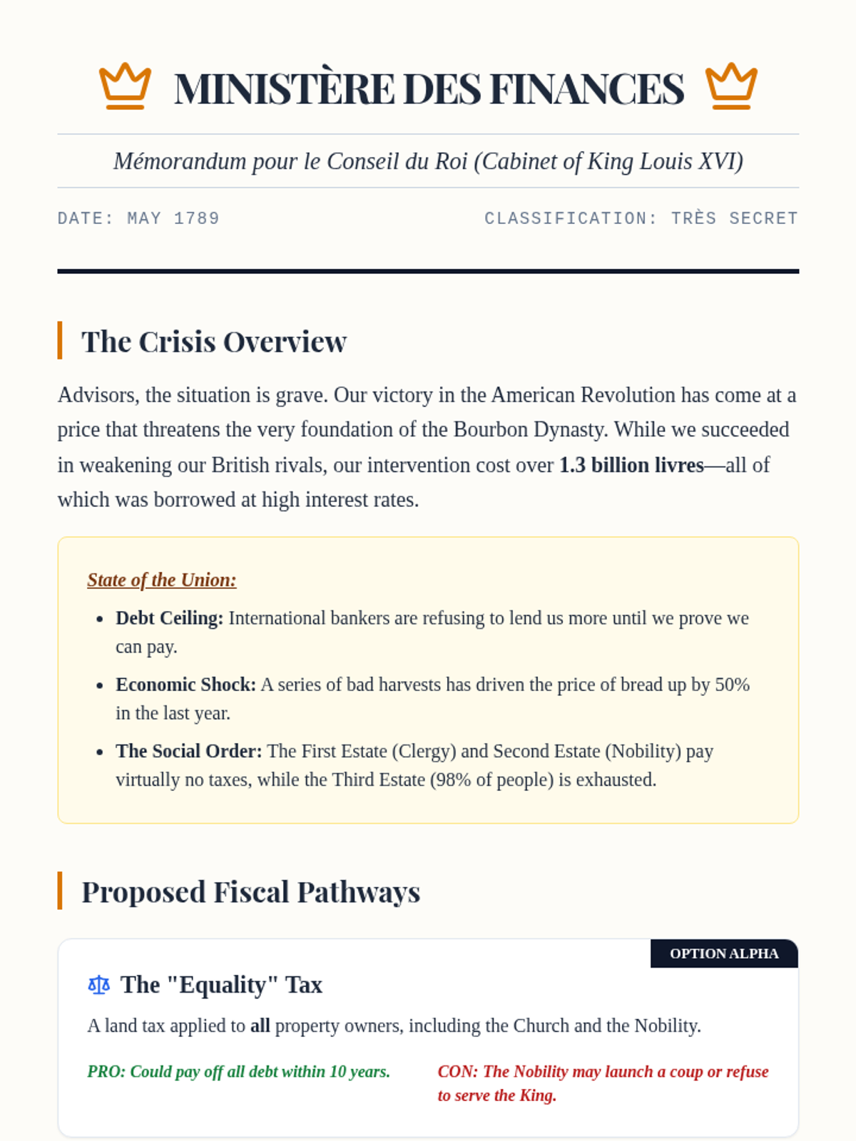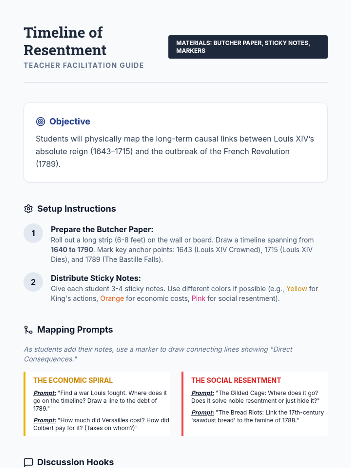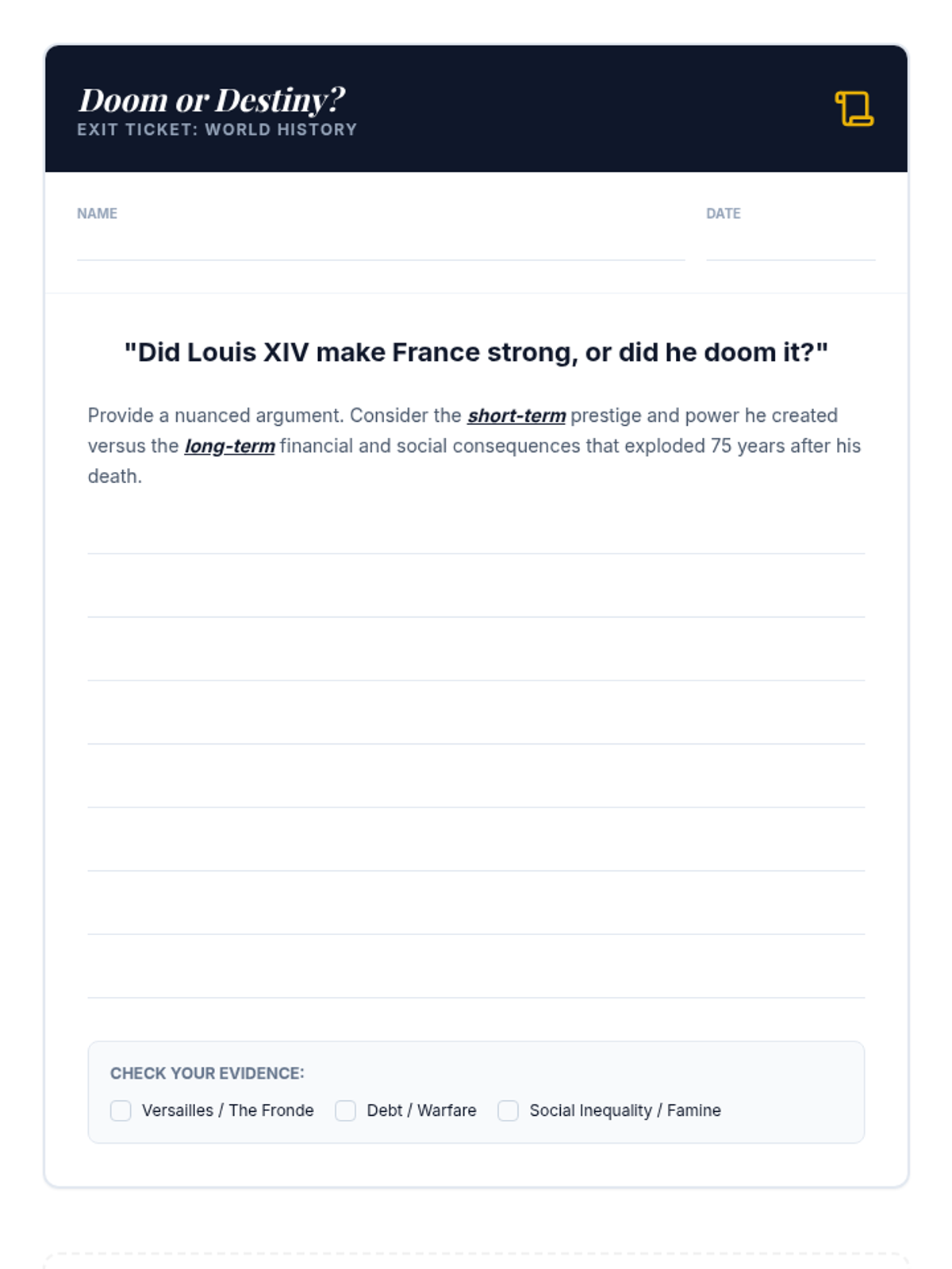 A financial literacy and history crossover lesson where students audit the reign of Louis XIV. They evaluate the staggering costs of Versailles and perpetual warfare against the tax burden placed on the third estate, connecting royal extravagance to the eventual French Revolution.