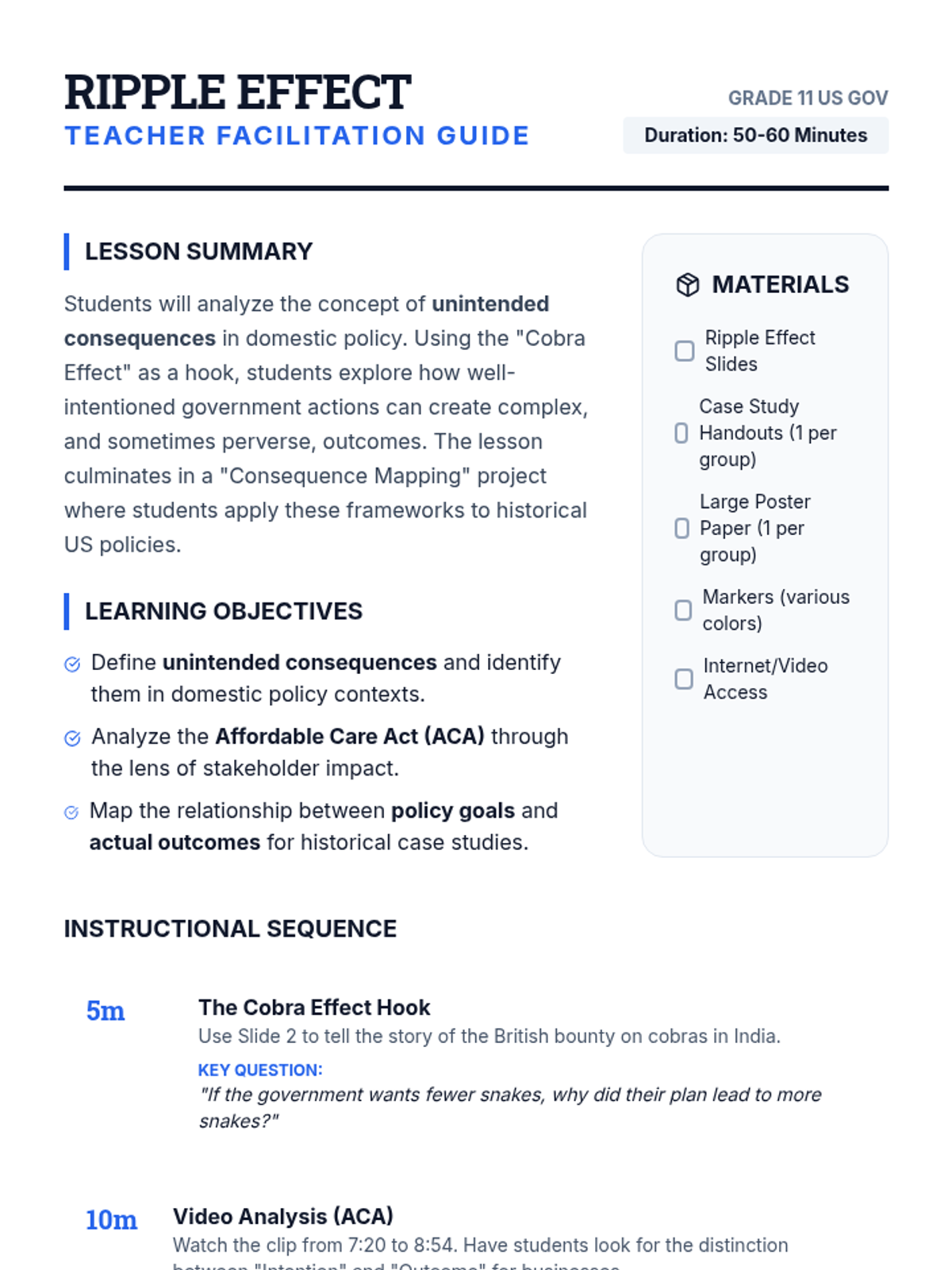 An 11th-grade US History and Government lesson exploring the 'Cobra Effect' and the concept of unintended consequences in domestic policy, featuring a case study on the Affordable Care Act and a group consequence-mapping project.