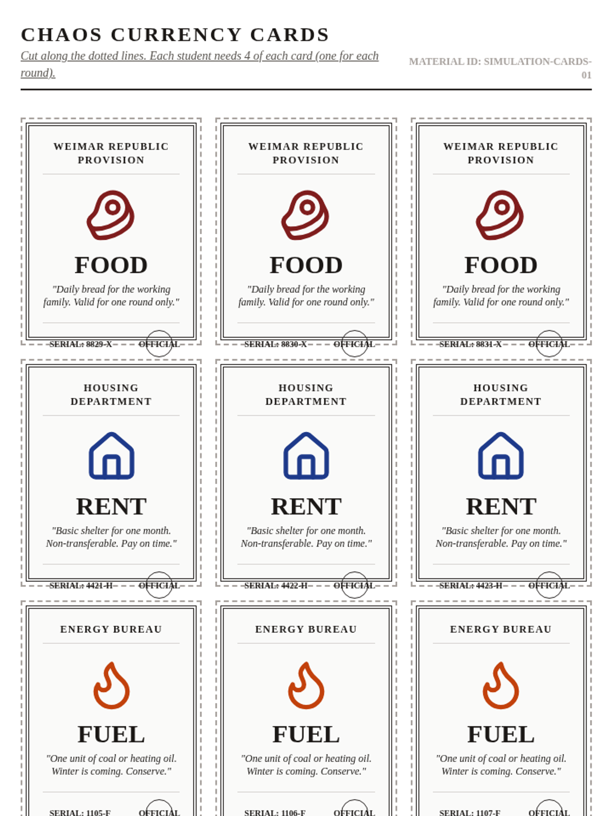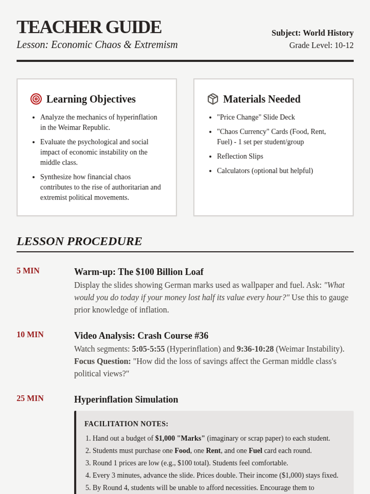 Students investigate the collapse of the Weimar Republic's economy through a hyperinflation simulation, analyzing how financial desperation creates a vacuum for political extremism.