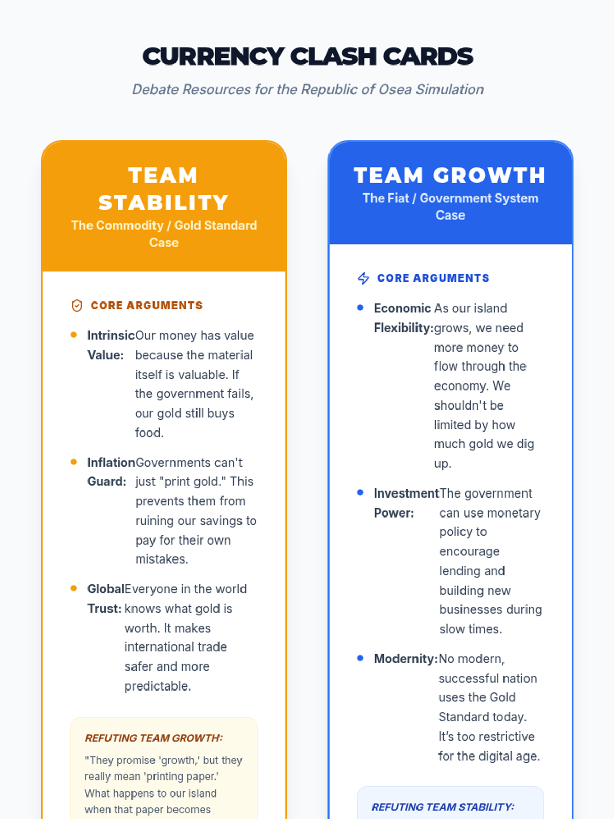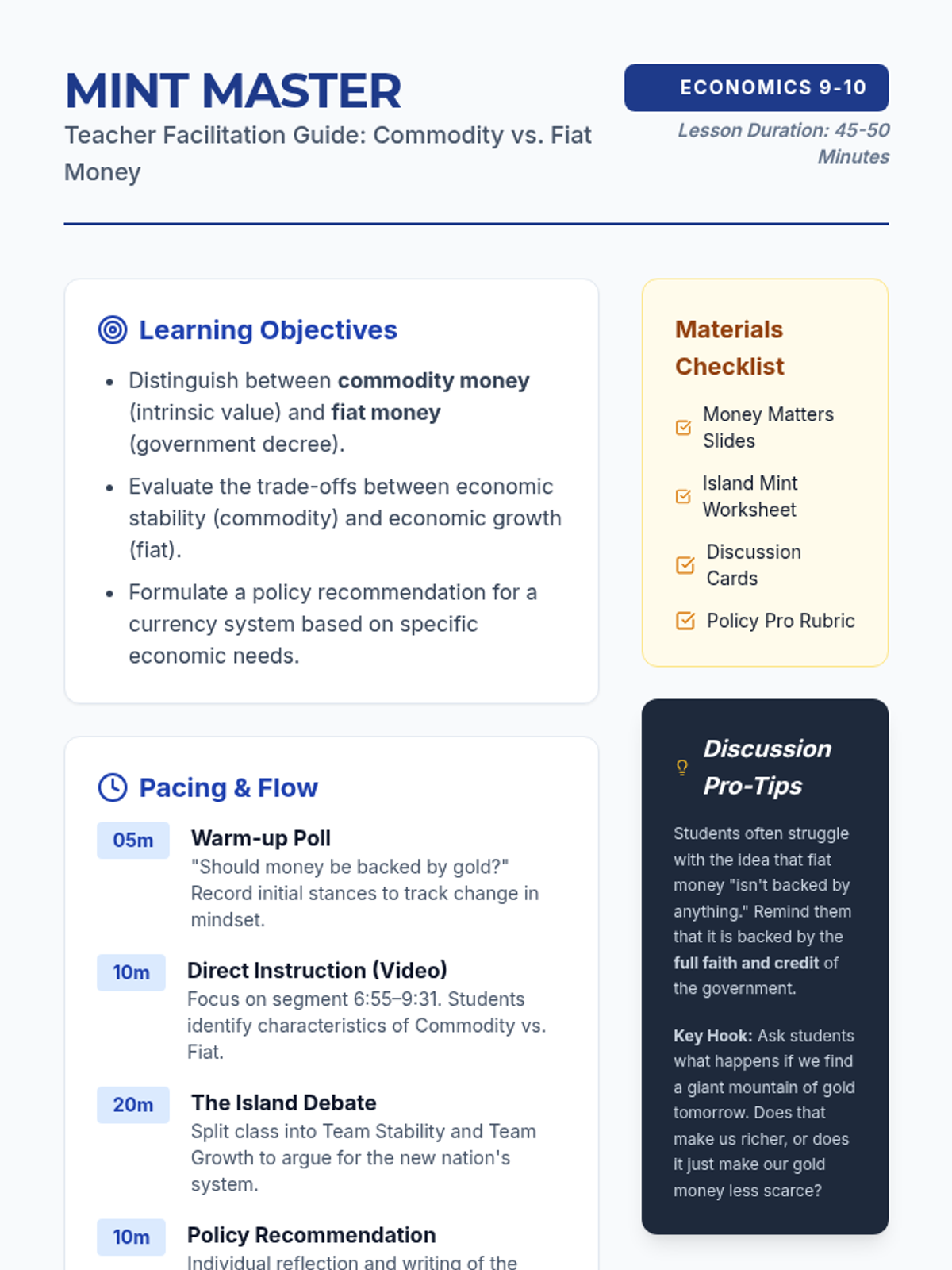 Students will distinguish between commodity and fiat money, analyze the six characteristics of money, and debate the merits of the Gold Standard through an island nation simulation.