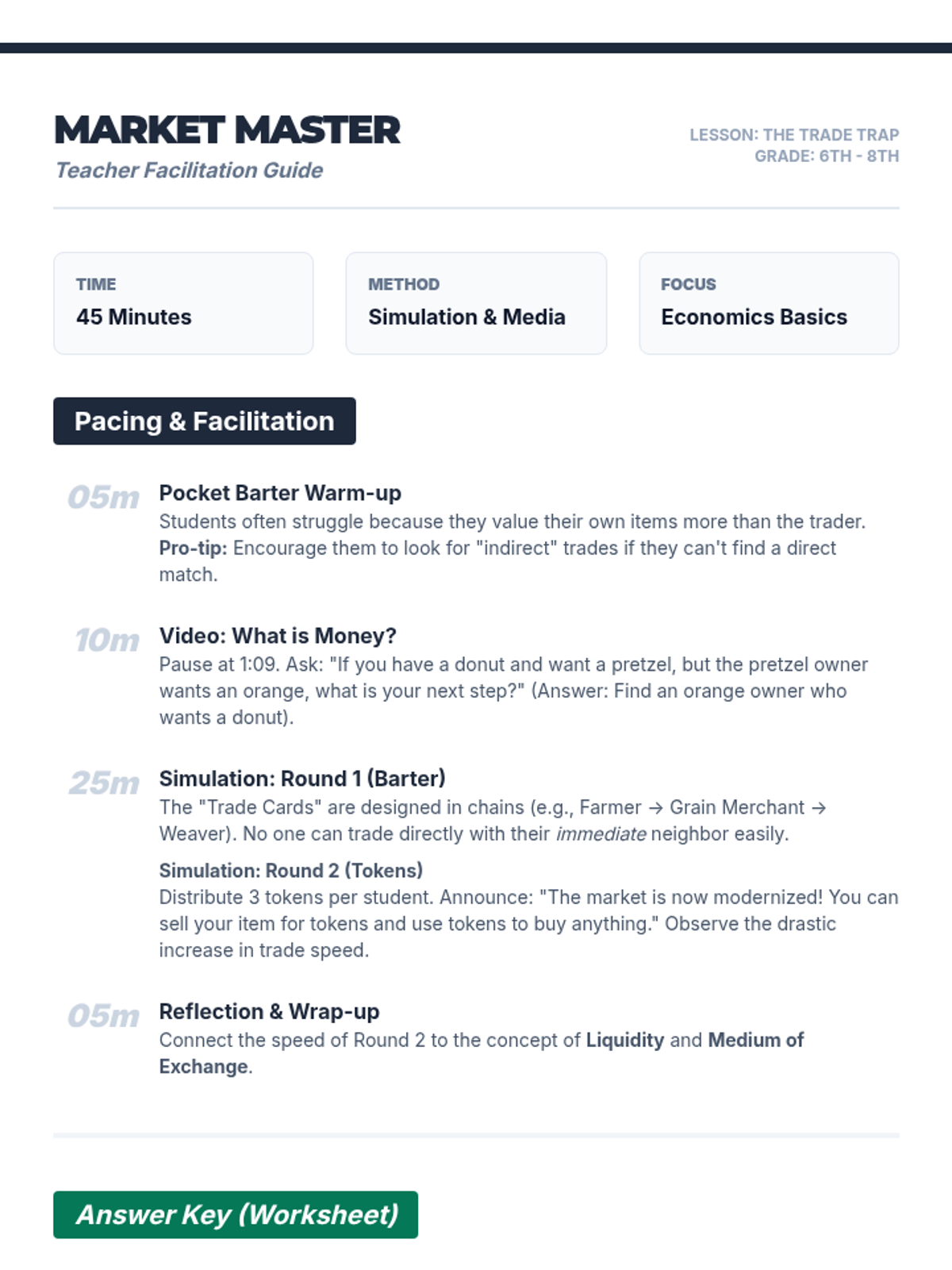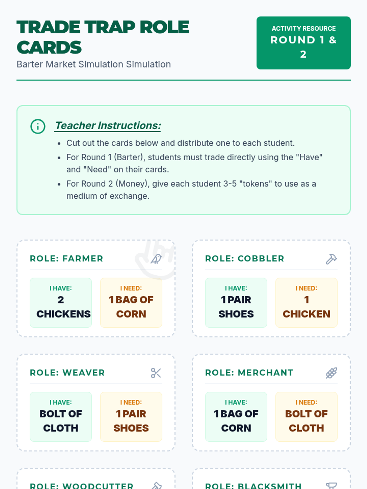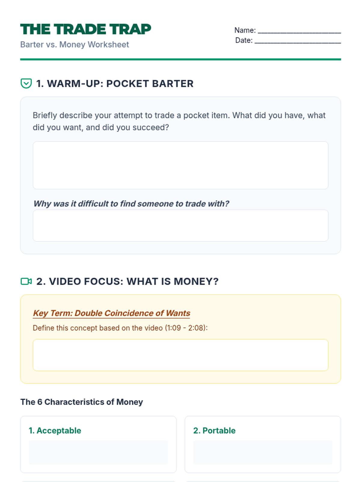 Students explore the limitations of the barter system through a hands-on simulation and a video analysis, discovering why money evolved as a medium of exchange to solve the 'double coincidence of wants' problem.